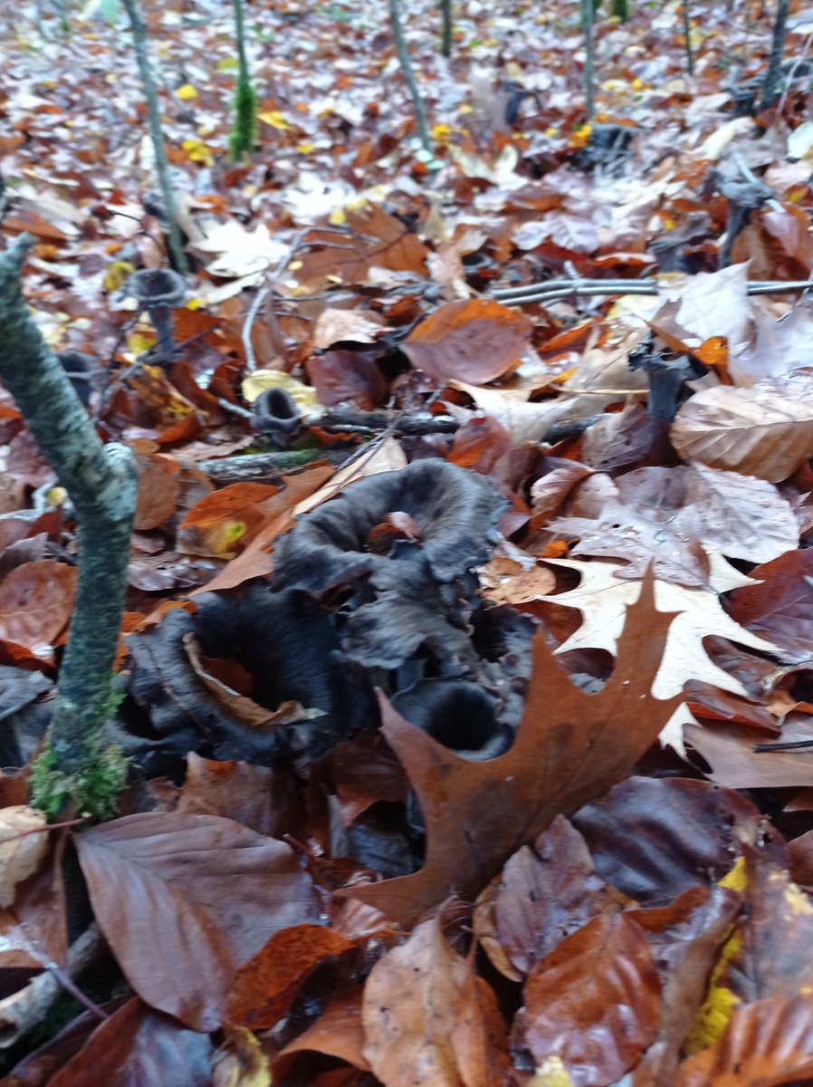 hab ich hier eine Herbstrompete? Steht im Laubwald und schmeckt bei längerem draufkauen nach Pfifferling.