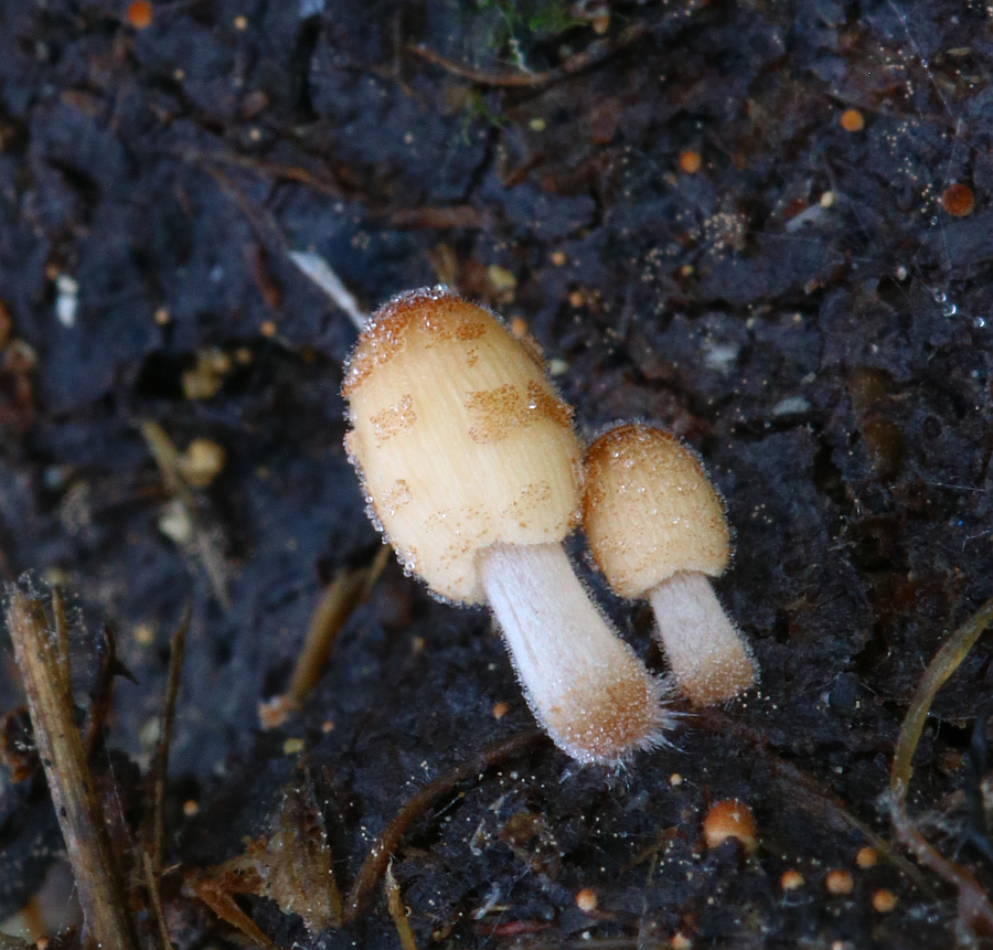 I have found this cute Coprinellus on horse dung on lawn under maquis trees which when young they are 2 mm orange-brown bodies and then develops into a 5 - 10 mm gray pileus with puntate veil remnants that are orange-brown. When young the veil is in isolated patches These are composed of globular cells. I should be in the genus Coprinellus (? Domestici)