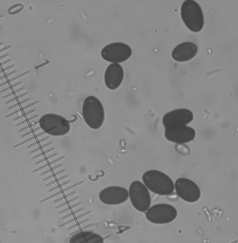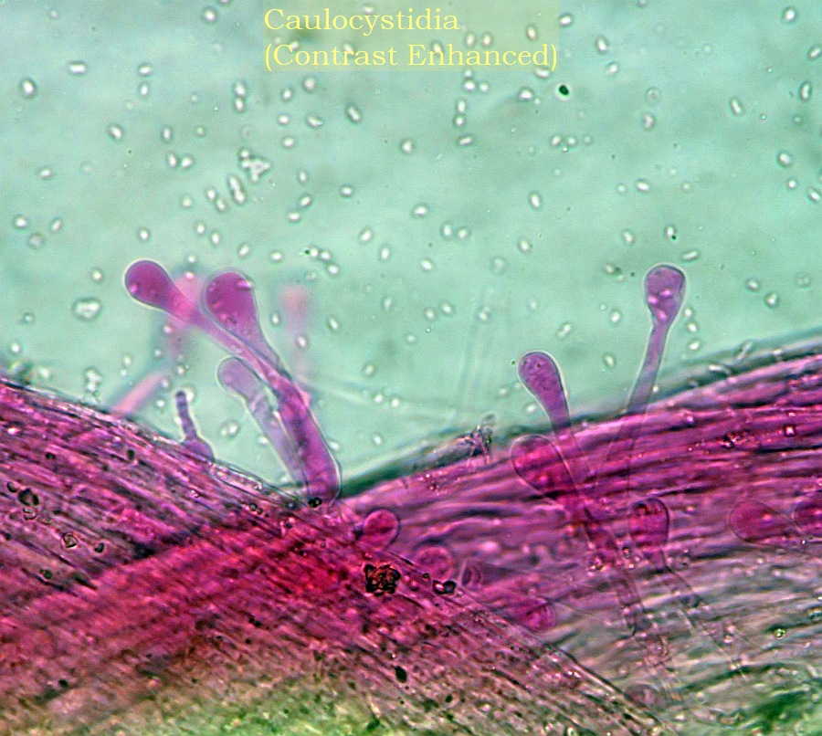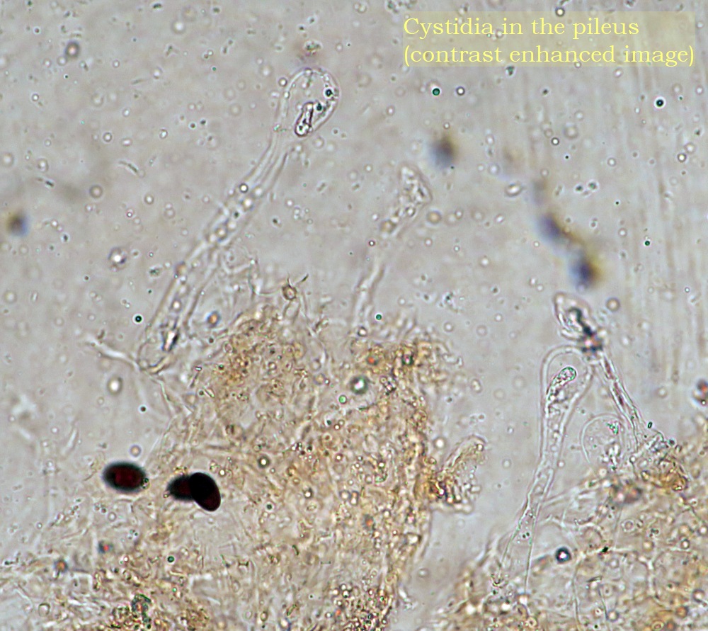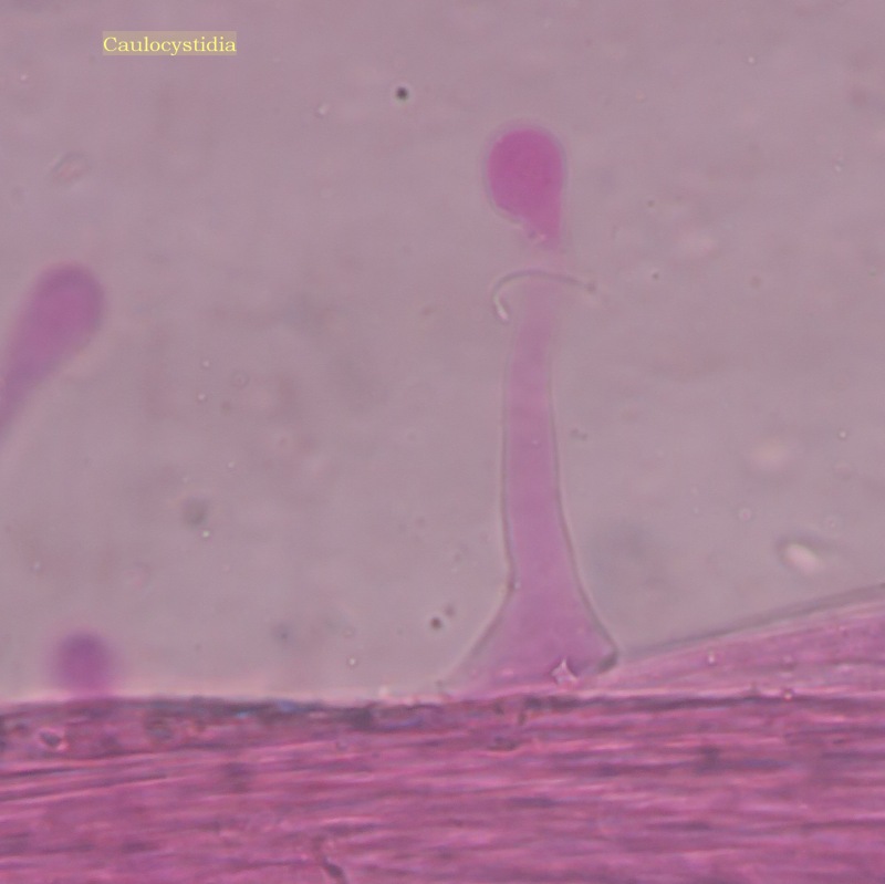 The spores are 13 x 8 um (mean) dark brown with a tiny pore. I thought that I saw an oblique pole at the germ pore or it is just a bit eccentric. Another interesting feature is the presence of caulocystidia (also seen in macro pics) which have a long neck and a nice rounded head. I have seen these in the pileus too. The pileus was deliquescent and was not able to see Cheilo/Pleuros.