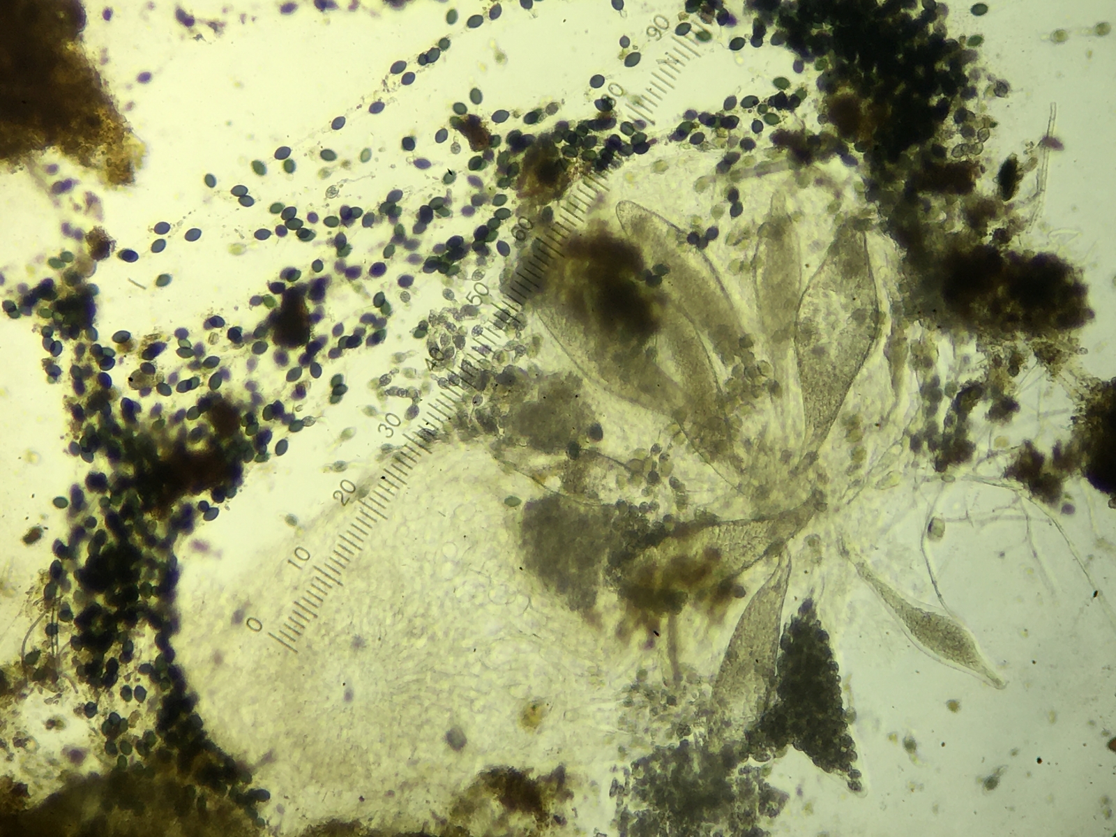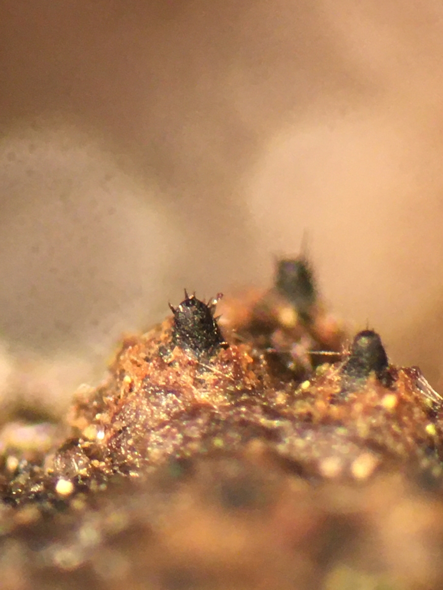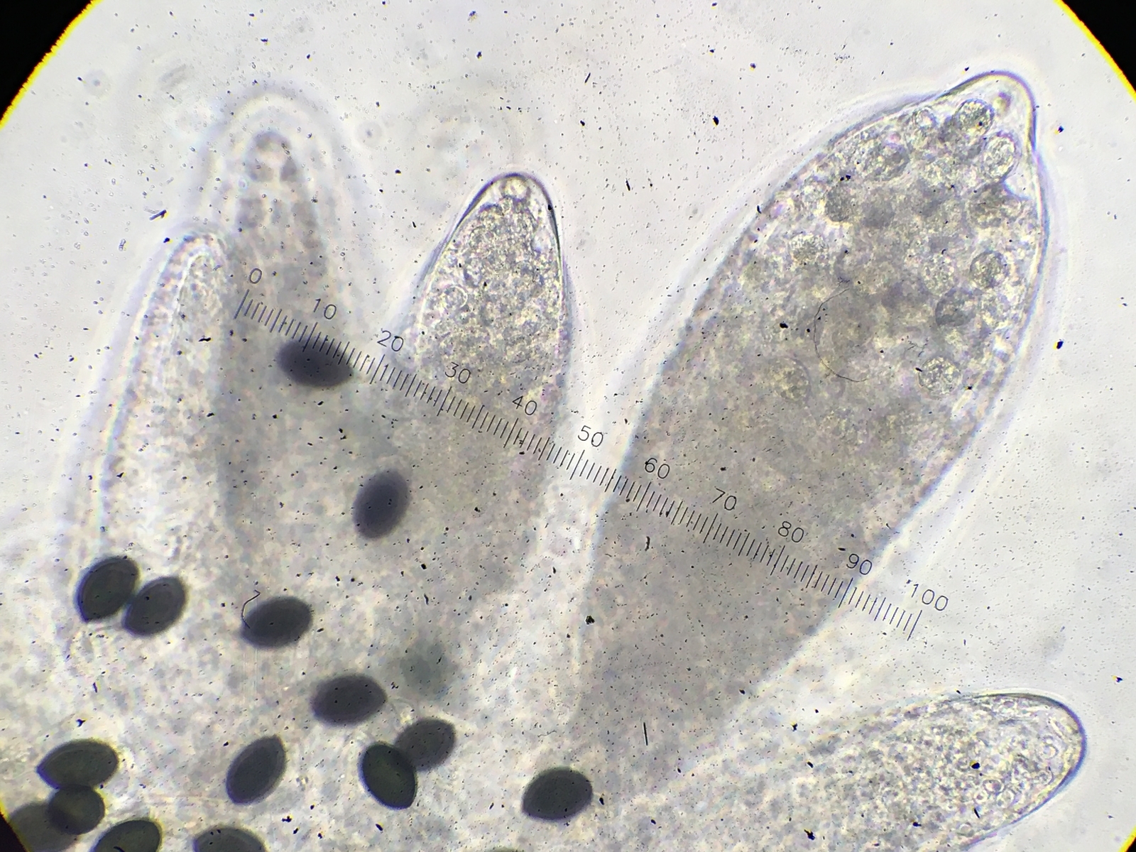 Asci appear to contain more than 64 spores (128?), And each spore is about 20 µm long. Perithecium opening is small, black, and covered in spikes.