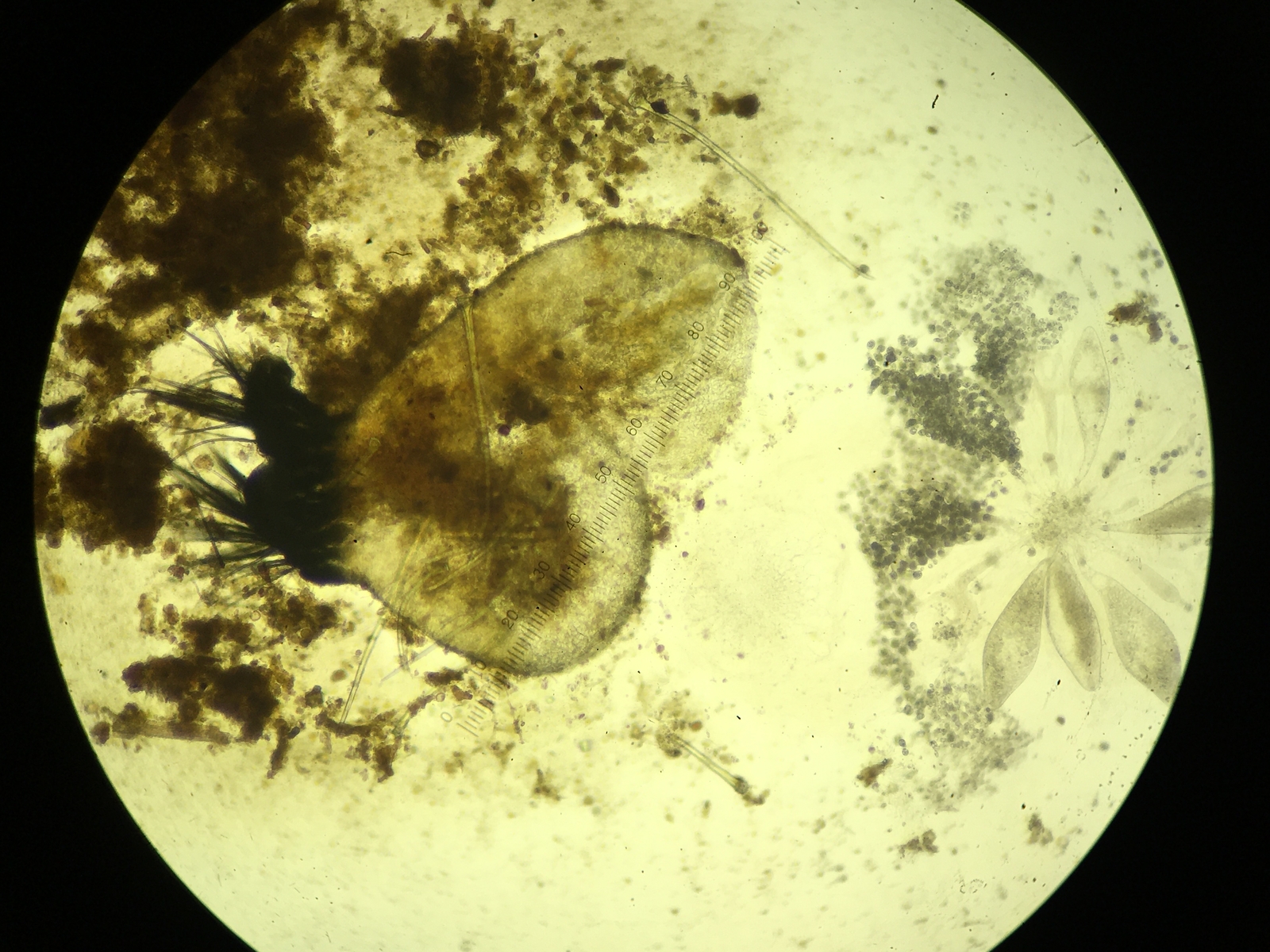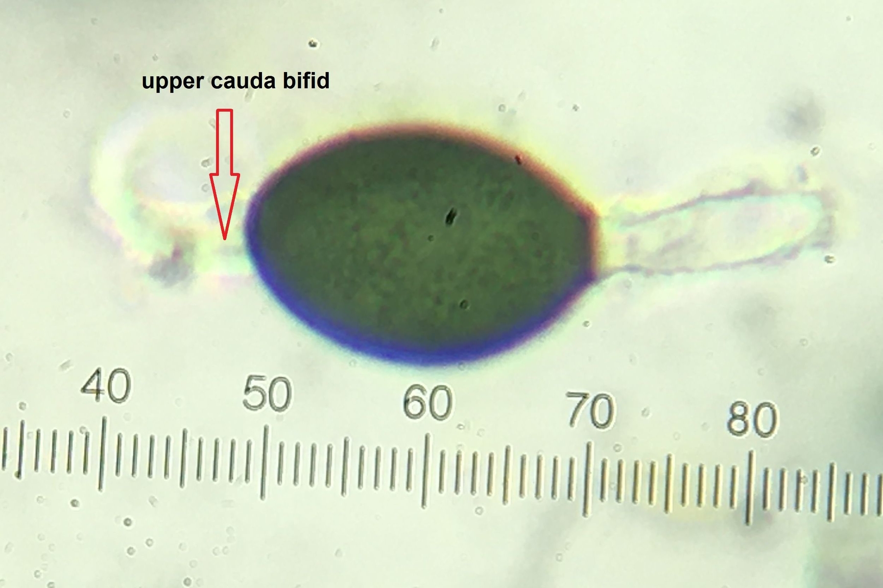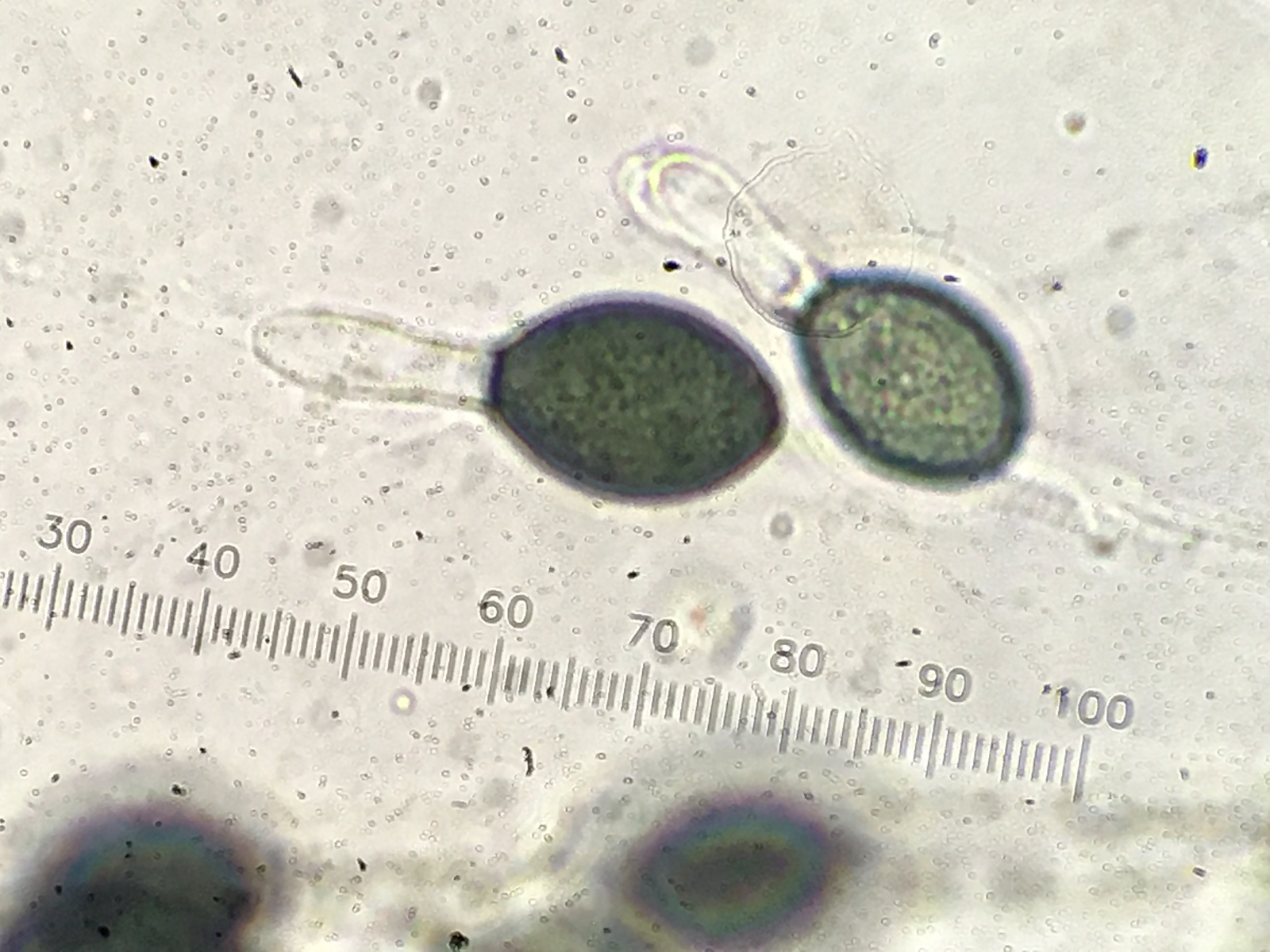 Asci appear to contain more than 64 spores (128?), And each spore is about 20 µm long. Perithecium opening is small, black, and covered in spikes.