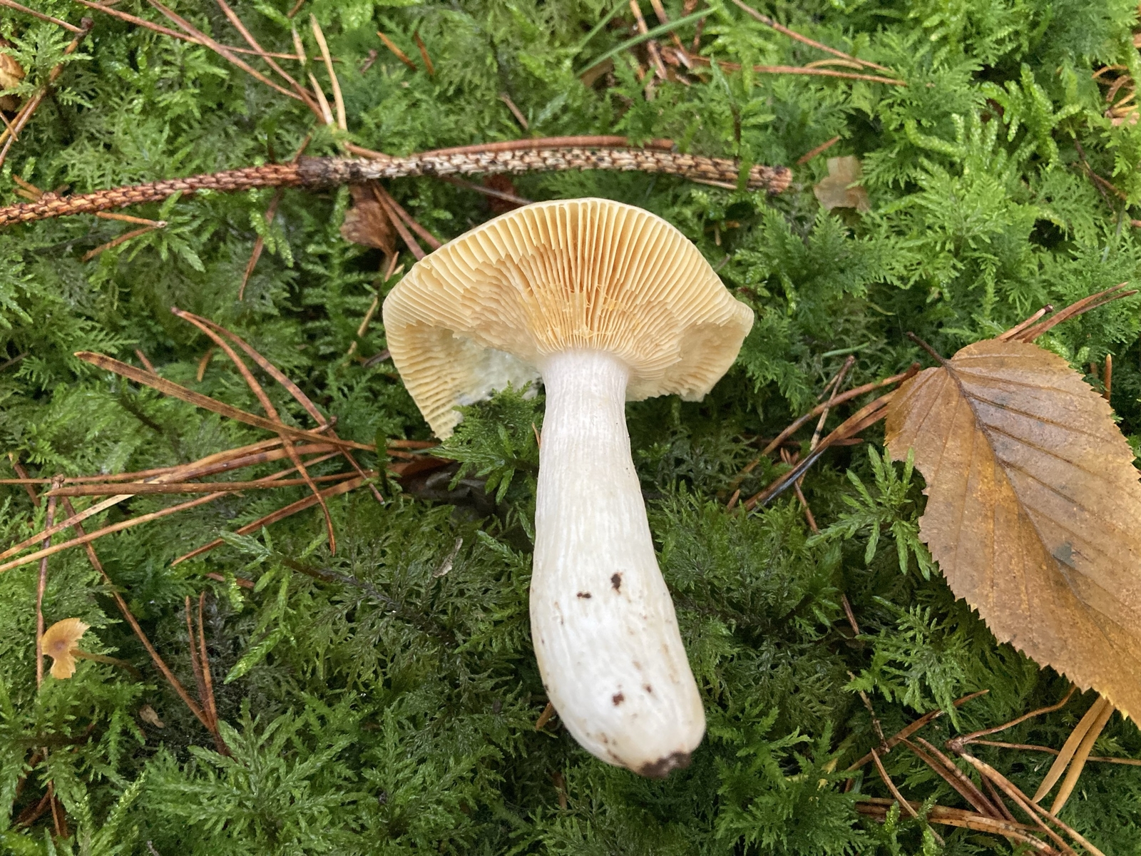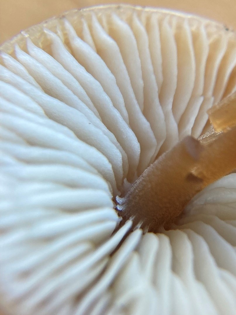 Ich kenne den deutlich dunkler, ohne durchscheinend gerieften Hut und mit braunem, samtigen Stiel.