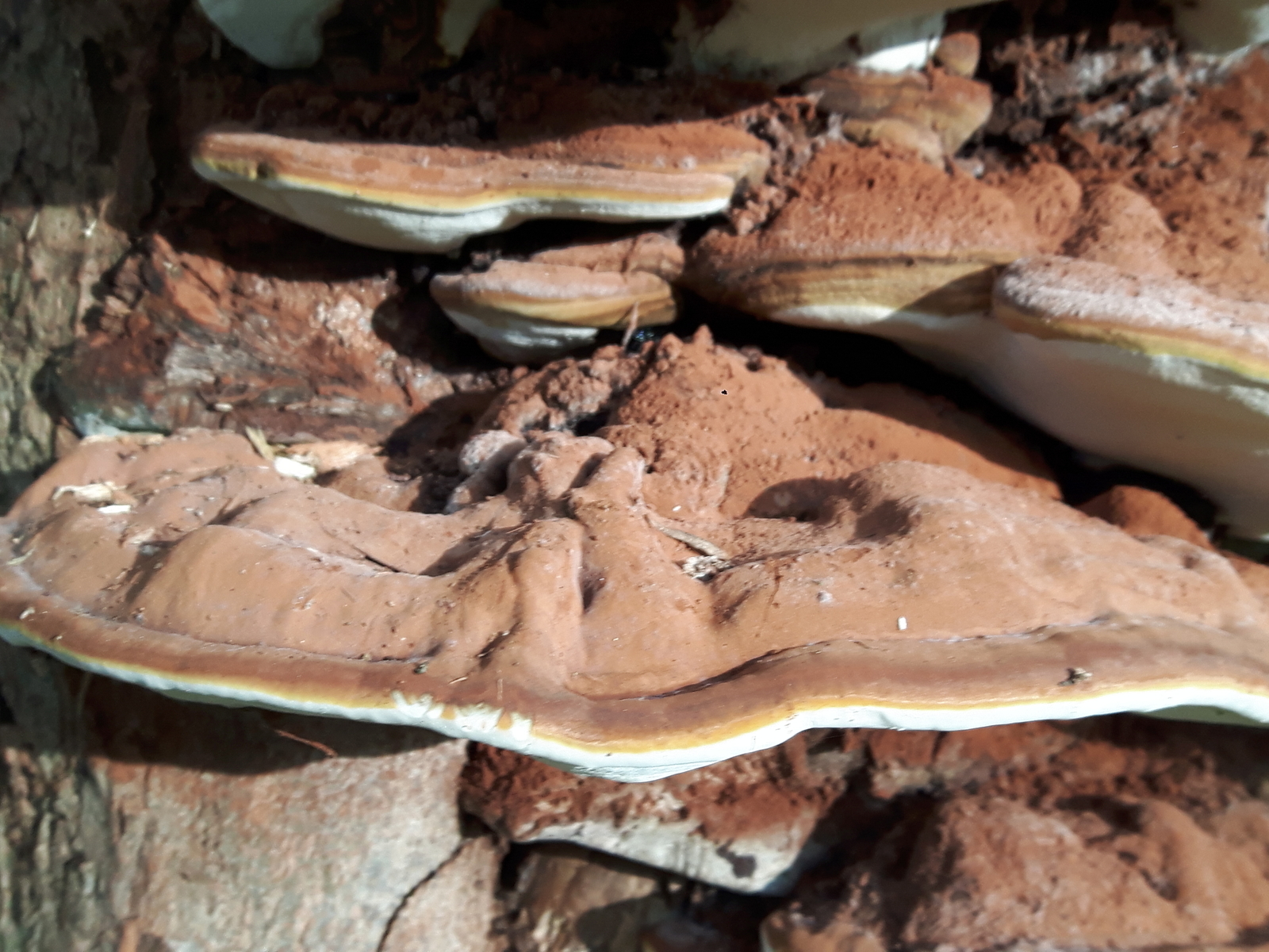 Die Fruchtkörper von Ganoderma resinaceum sind übrigens immer einjährig. Die von Ganoderma applanatum nur im ersten Jahr. Anschließend wird immer wieder eine weitere Lage / Röhrenschicht gebildet, der Fruchtkörper von Wuchsperiode zu Wuchsperiode ausgebaut.