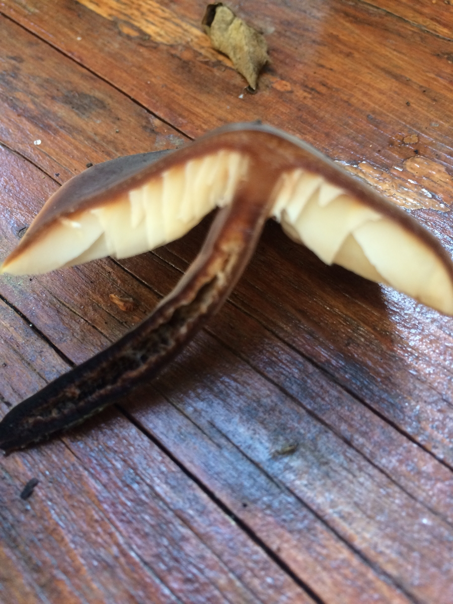 Sie wachsen also in der Erde, der Hut schaut samtig aus, wird aber bei Berührung fettig-glänzend und fühlt sich auch fettig an. Die dunkelbraune Farbe scheint im Alter/bei Trockenheit auszublassen. Den Geruch würde ich als gurkig-tranig beschreiben, mit der Gurke im Hintergrund, und genauso schmeckt er auch. Fleisch und Stiel sind sehr elastisch, aber die Sporen passen mit ihrer langovalen Form zu keiner meiner Ideen.