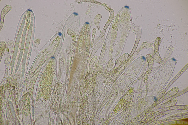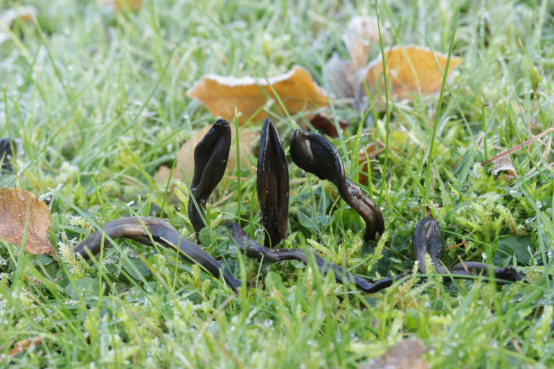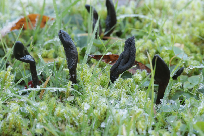nachdem wir ja am letzten Wochenende Erdzungen in allen Formen und Farben hatten (na gut, alle zungenförmig und alle schwarz), kam von gdno81 der Hinweis, daß er vor 4 Wochen in Bottrop auf einem Friedhof nicht nur Trichoglossum hirsutum sondern sogar Trichoglossum walteri gefunden habe. Also habe ich dem Friedhof dann am Mittwoch mal direkt einen Besuch abgestattet. Auch wenn es in der Nacht Frost gab, waren schnell Erdzungen gefunden. Schon im Feld wirkten die aber nicht wie Trichoglossum, sondern eher wie Geoglossum. Der Blick unters Mikroskop hat das dann schnell bestätigt: Unseptierte Sporen im Abwurf mit einer Länge zwischen 70-90 µm, also Geoglossum fallax. Der Vorteil ist, daß man dann bei der Zuordnung von Makro- und Mikrofotos weniger Probleme hat :D