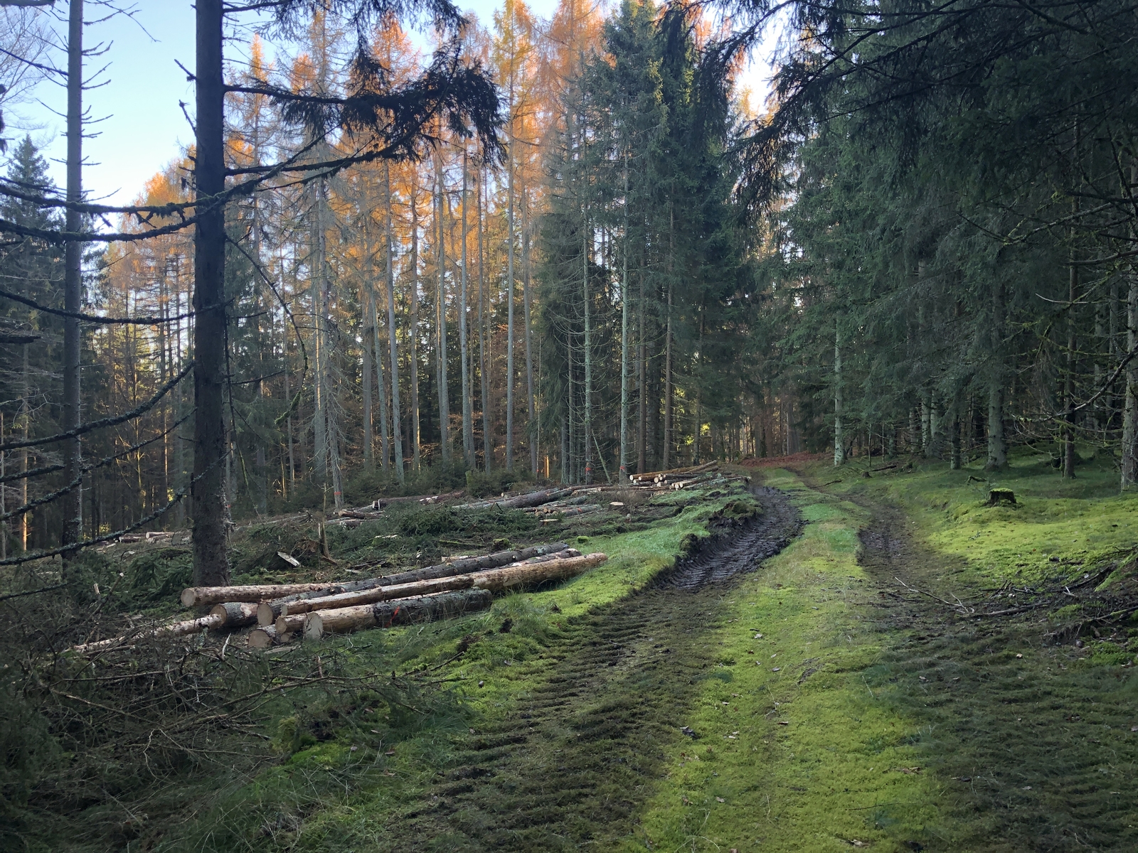 23. Das Leuchten der Lärchen lenkt ein bisschen davon ab, dass ständig neue Löcher in den Fichtenplantagen entstehen und Wege verwüstet werden. .