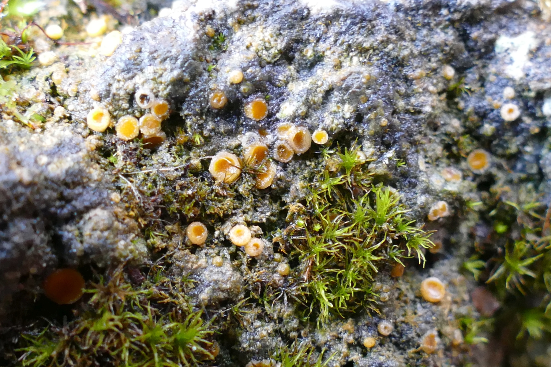 Gut erkenntlich an ihren schüsselförmigen orangenen Apothecien mit hellen Rand. Teilweise ist sogar das orangefarbene Lager zu erkennen!