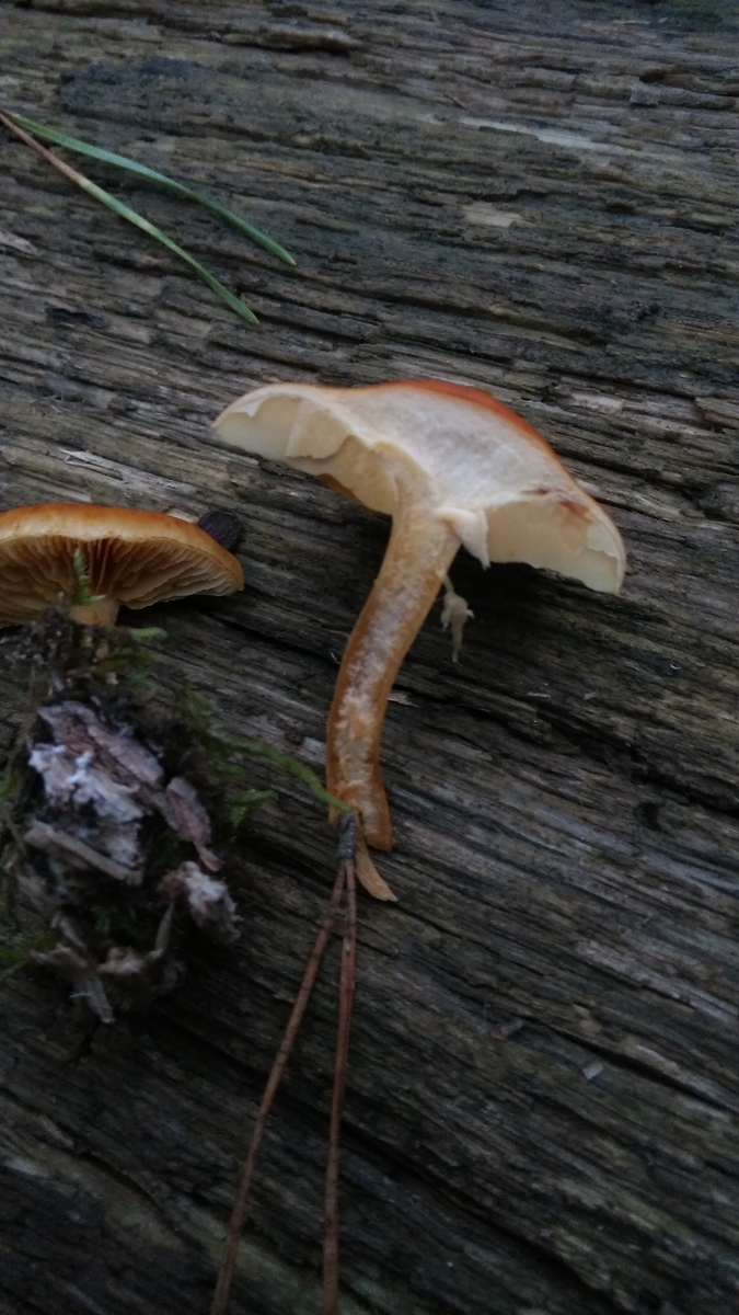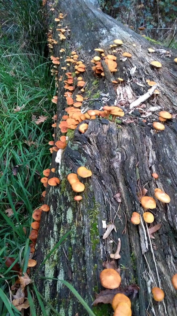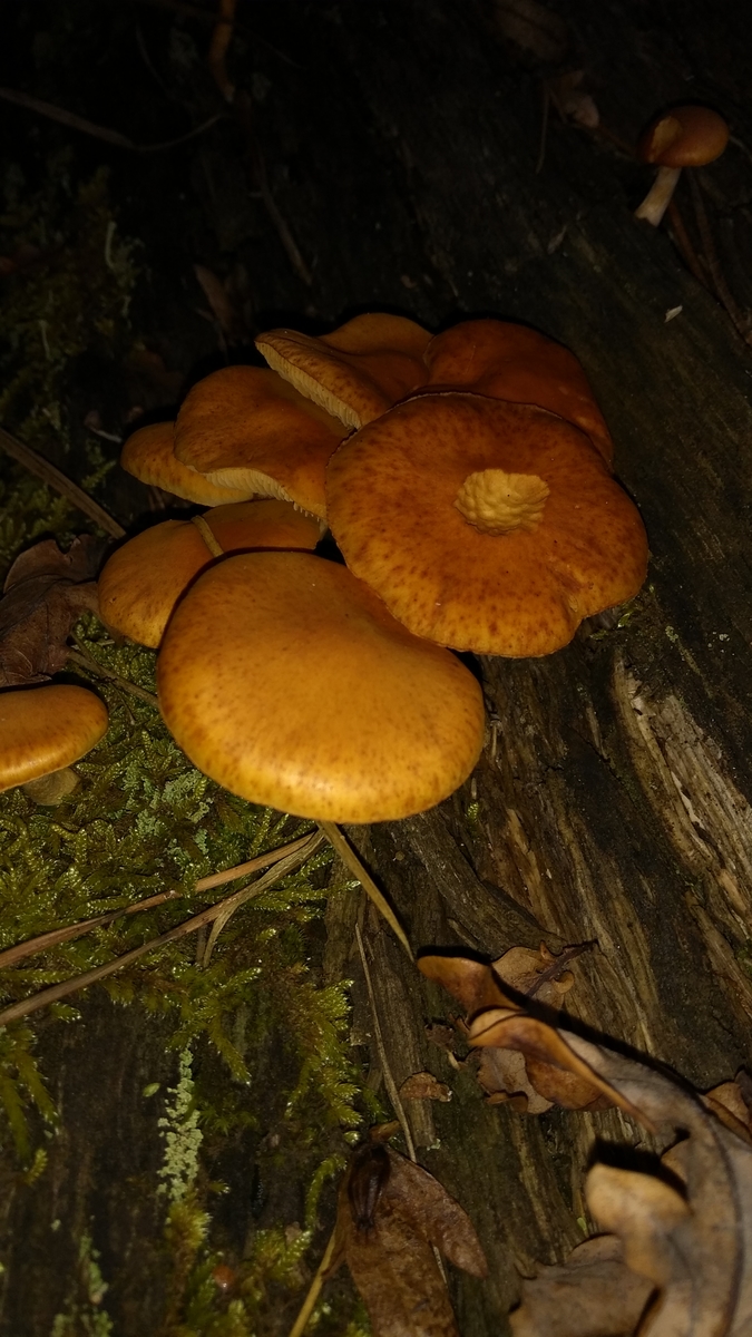 Ende Oktober fand ich am Ende einer Waldtour diesen Baumstamm mit etlichen Fruchtkörpern. Auf den ersten Blick leuchteten die in der Dämmerung auffällig orange. Bei dem Stamm vermute ich Nadelholz, vor allem wegen umstehender Kiefern. Das ist also nicht belastbar. Die Bilder sind leider mies, weil es schon dunkel wurde. Die Farben sind auf den ersten Foto noch am ehesten authentisch. Nachdem ich vorher den Beringten Flämmling fand, dachte ich zunächst daran. Das ließ sich aber allein wegen der Größe nicht aufrecht erhalten. Jetzt meine ich eher, dass es sich vielleicht um den Gefleckten Flämmling (Gymnopilus penetras) handeln könnte. Leider sind meine Infos spärlich, kein gescheites Bild von unten, mitgenommen habe ich nichts. Ich war im Kopf schon zu Hause...