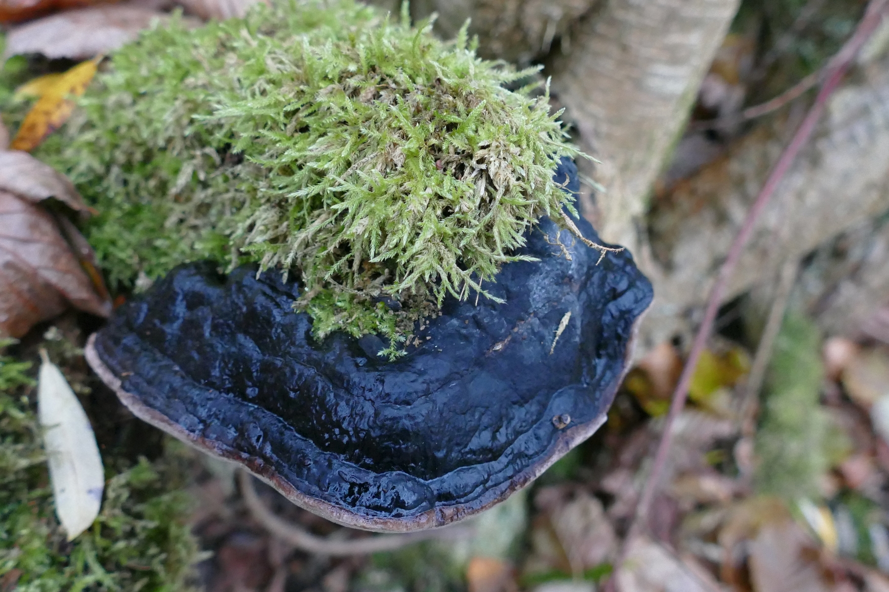 Die Oberfläche ist glänzend schwarz und von Moos bewachsen, das Hymenium beige und feinporig.