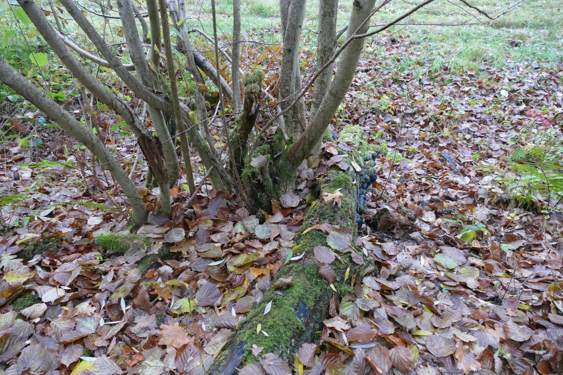 an einem unter einem Haselbusch liegenden Stamm (Hasel?) wächst ein über einen Meter breiter Porling.