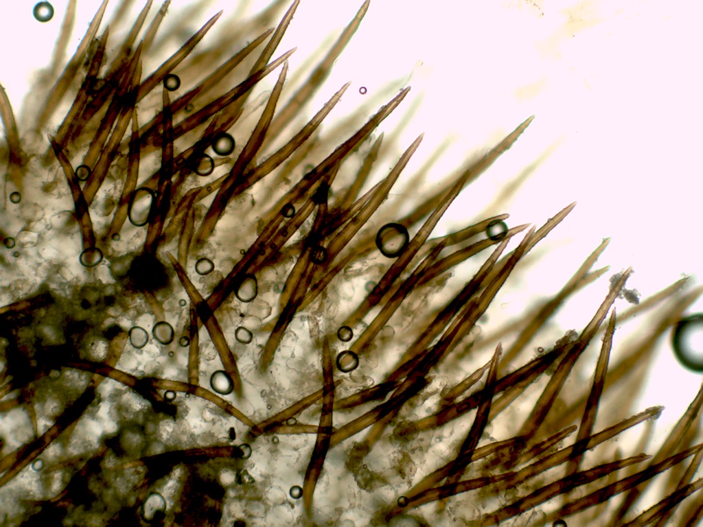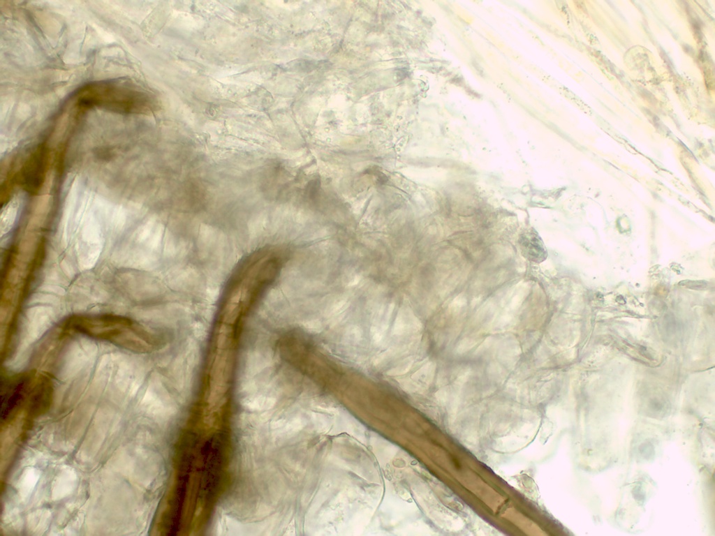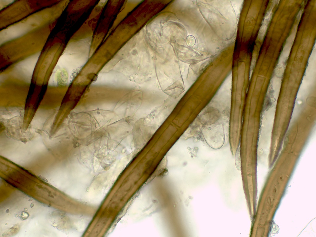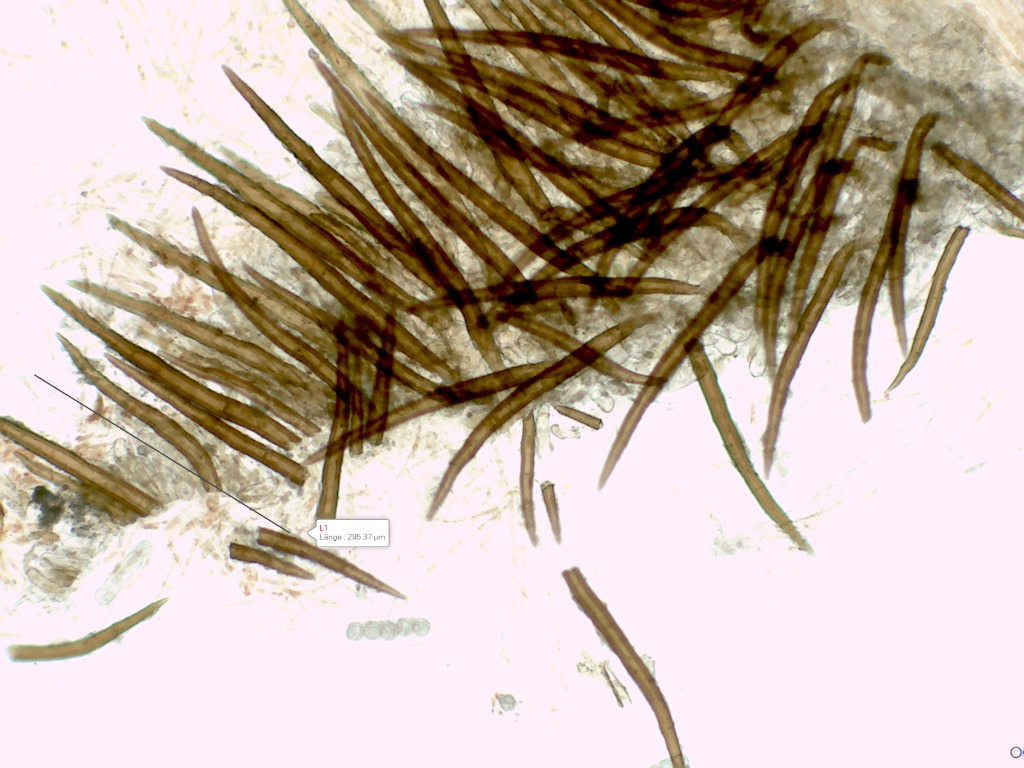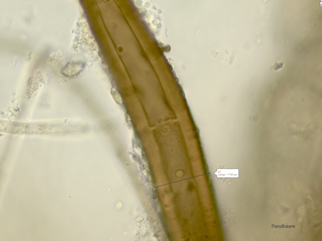 Die Randhaare 240-370µ lang, 2-3fach septiert, die Wand ca.5,5µ dick, die Basis überwiegend einfach wurzelnd