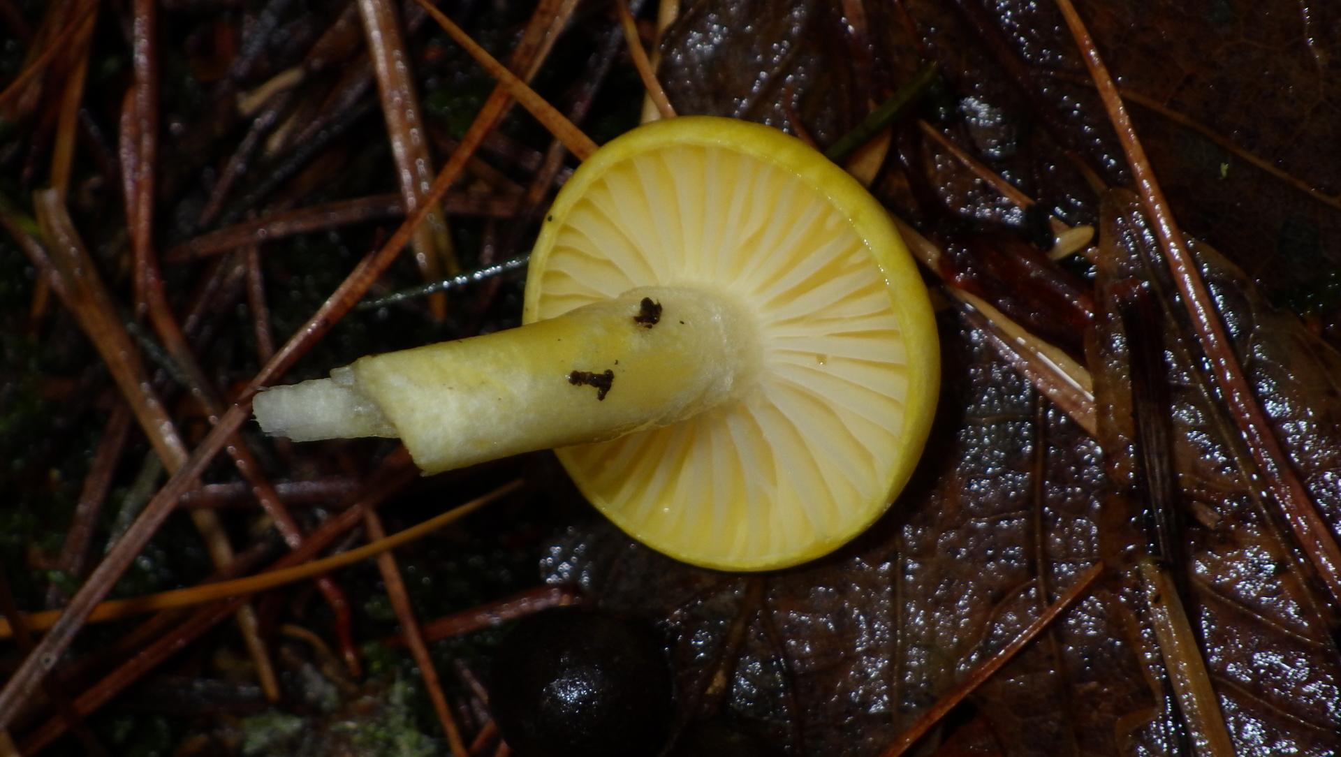 Diese Pilzgruppe habe ich heute im Maiengrün Wald 580m unter einem Nadelbaum entdeckt. Die kleinen Pilzchen bis 1cm hatten gelben Hut, Stiel und auch die Lamellen waren gelb. Die grösseren Exemplare (Hut bis 4-5cm) waren hell gelb und hatten auch helle fast weisse Lamellen und auch der Stiel war fast weisslich. Die Lamellen hatten grosse Abstände, also entfernt. Ist es ein Saftling? Welcher?