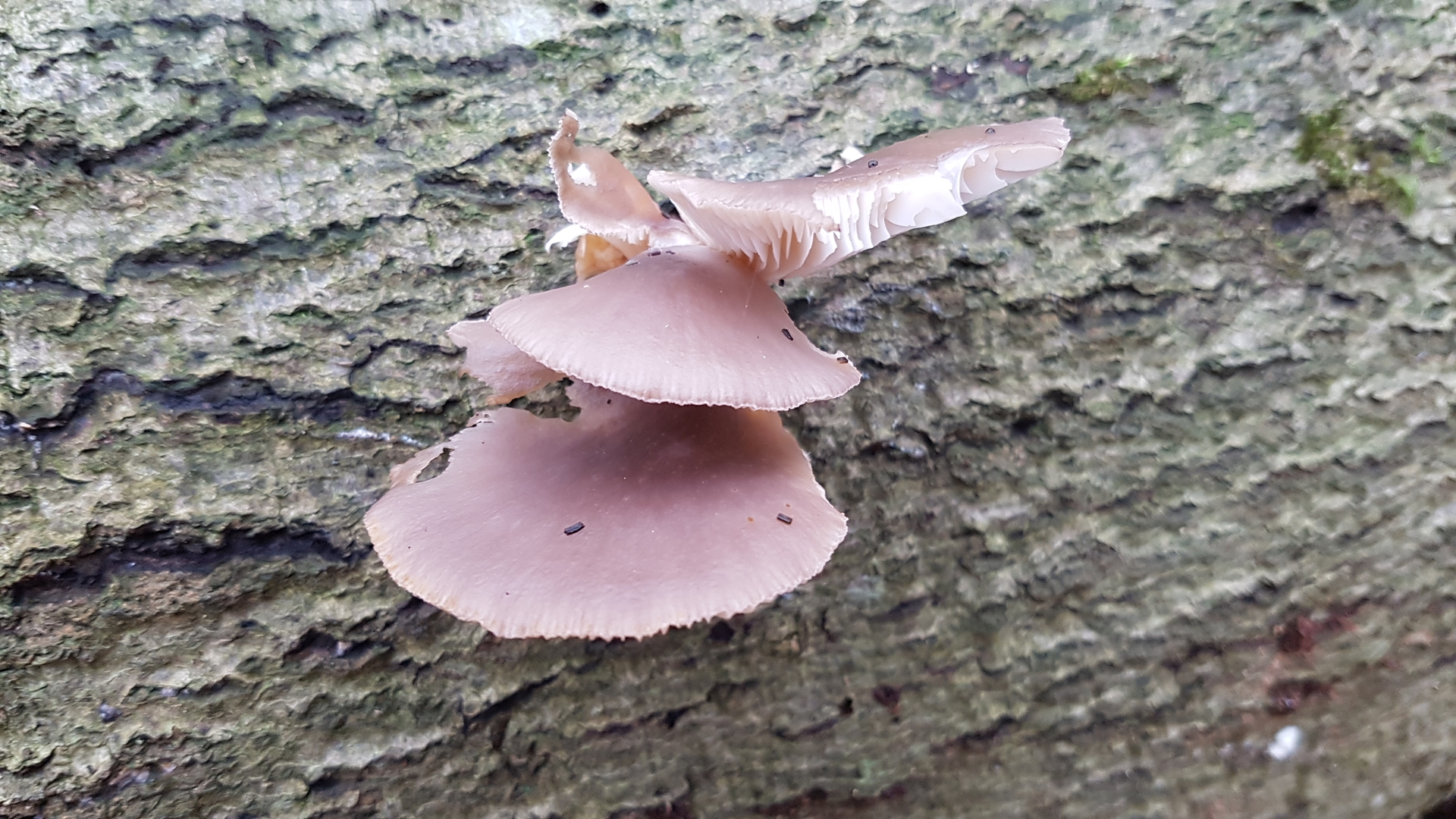 Das Holz ist Buche, denke ich. Farbe des Hutes war grau mit leichtem Ockerbraun. Die Lamellen waren weiß und gingen am seitlichen Stiel herab. Das Fleisch war auch weiß. Größe des Hutes zwischen fingernagelgroß bei den ganz kleinen und um die zehn Zentimeter bei den großen angefressenen Exemplaren.