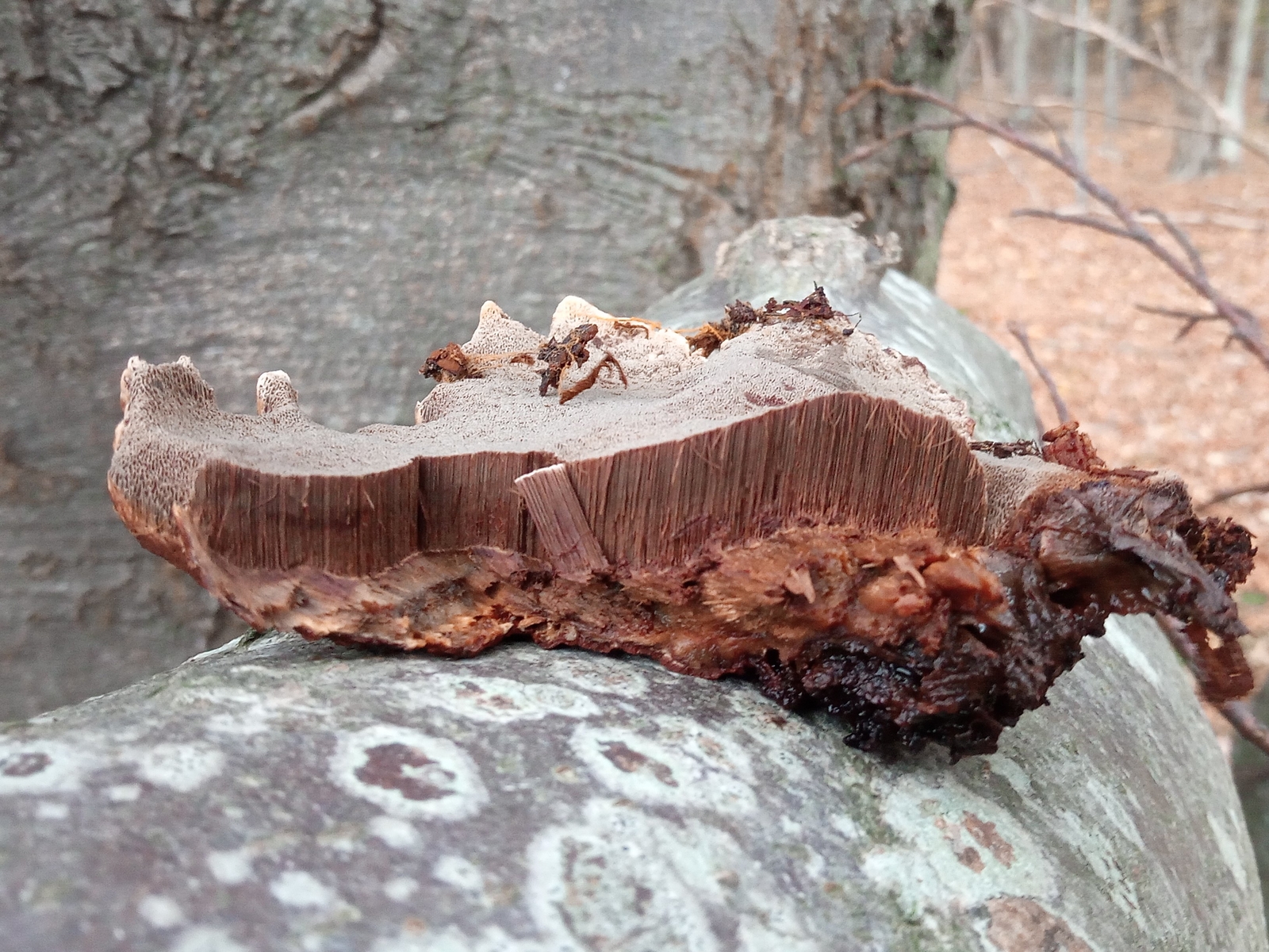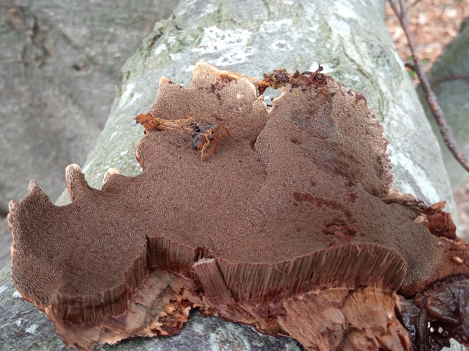 Die Poren sind nur von der Seite weiß, sonst sind sie braun. Der Pilz ist extrem weich und brüchig. Die Oberseite ist total schmierig, meine Finger waren gleich braun gefärbt