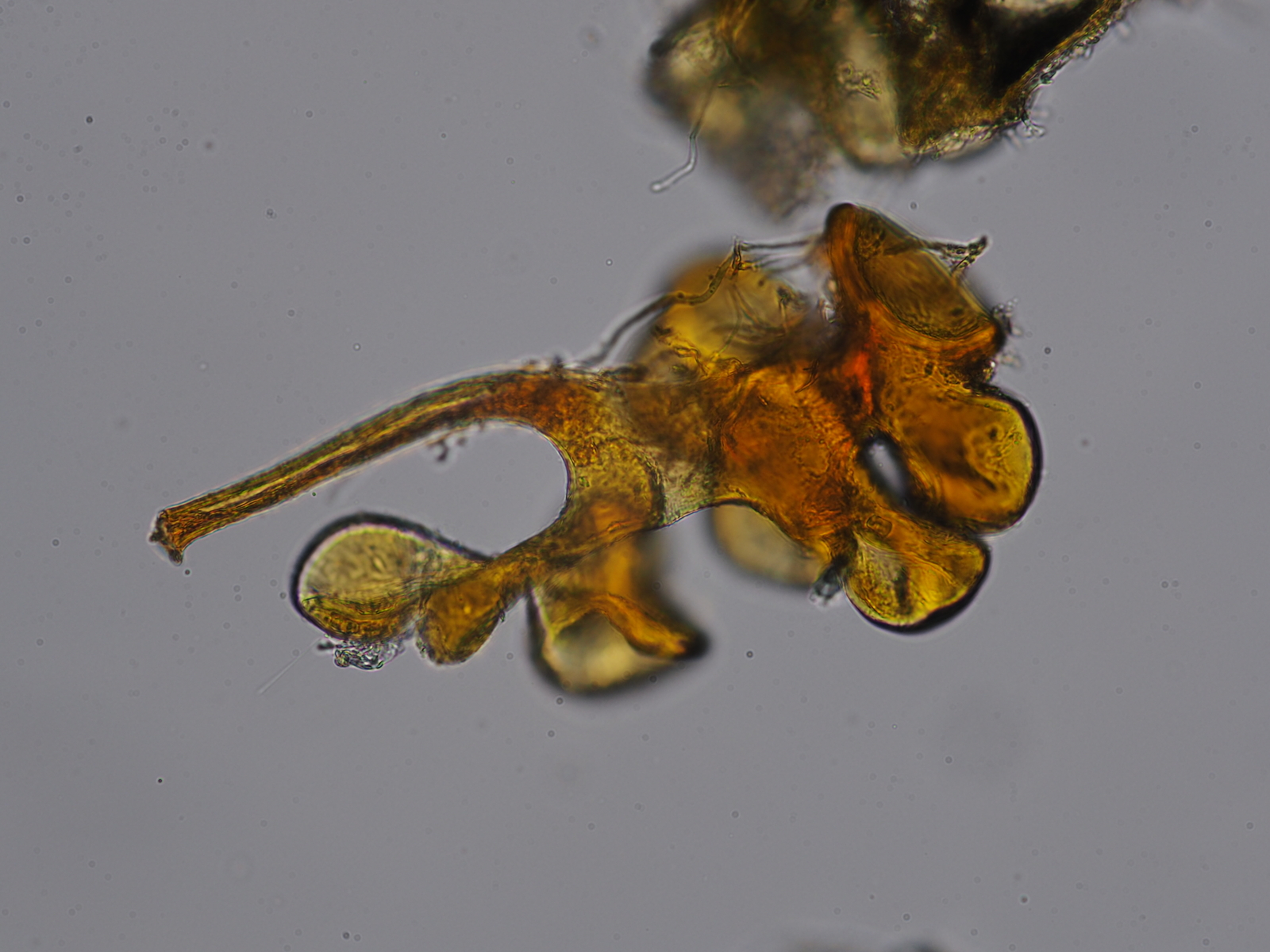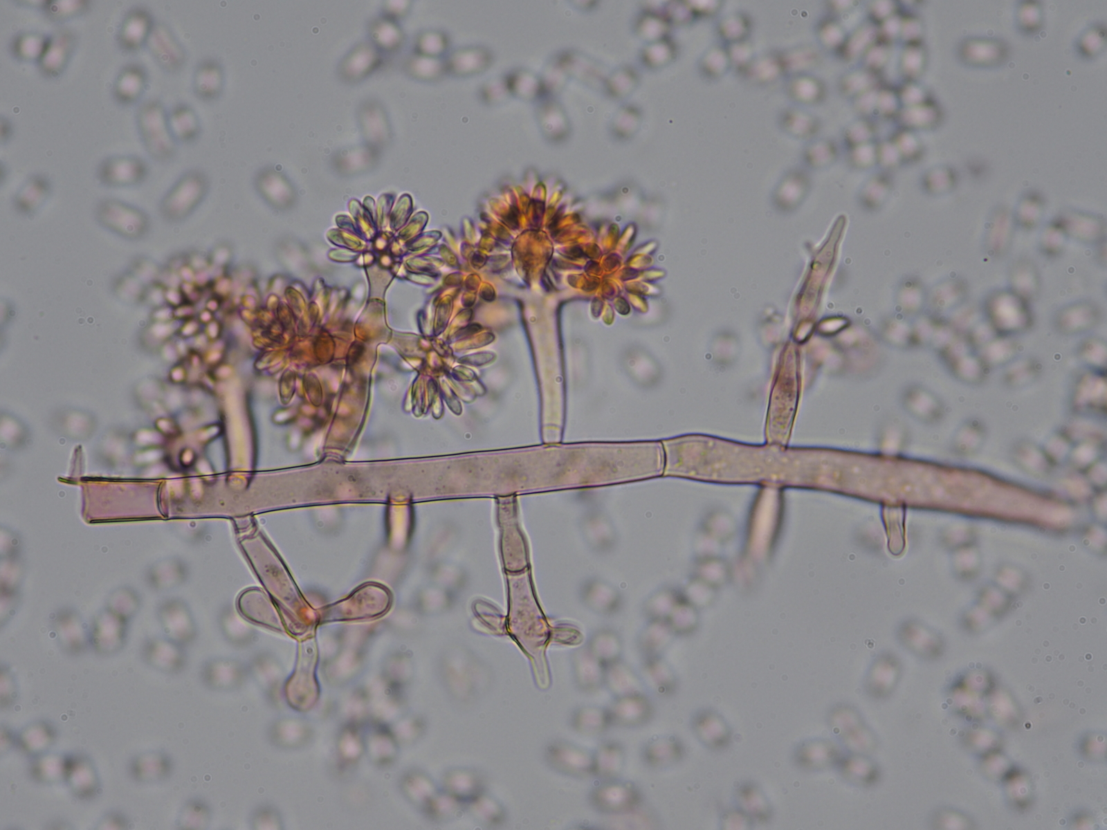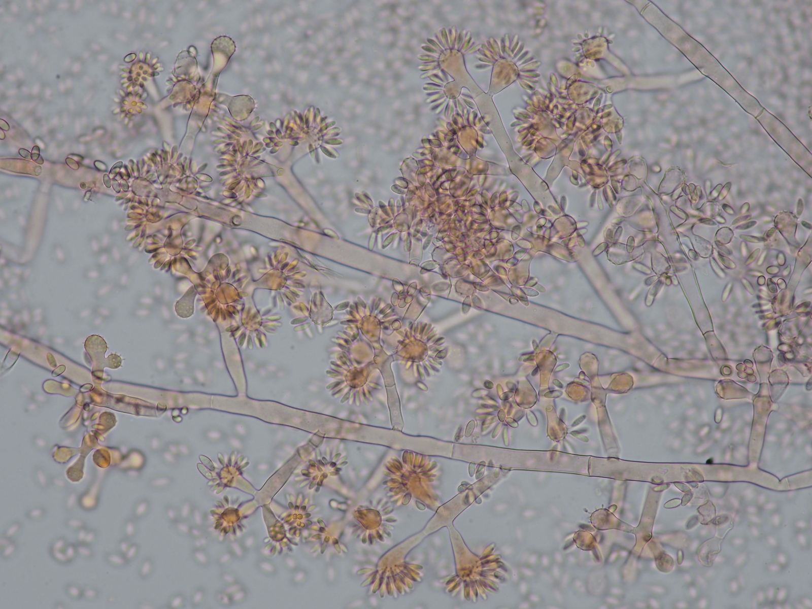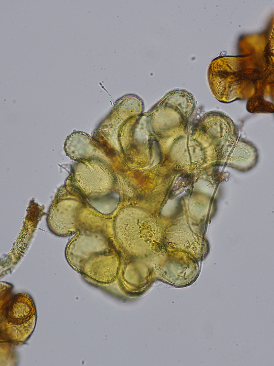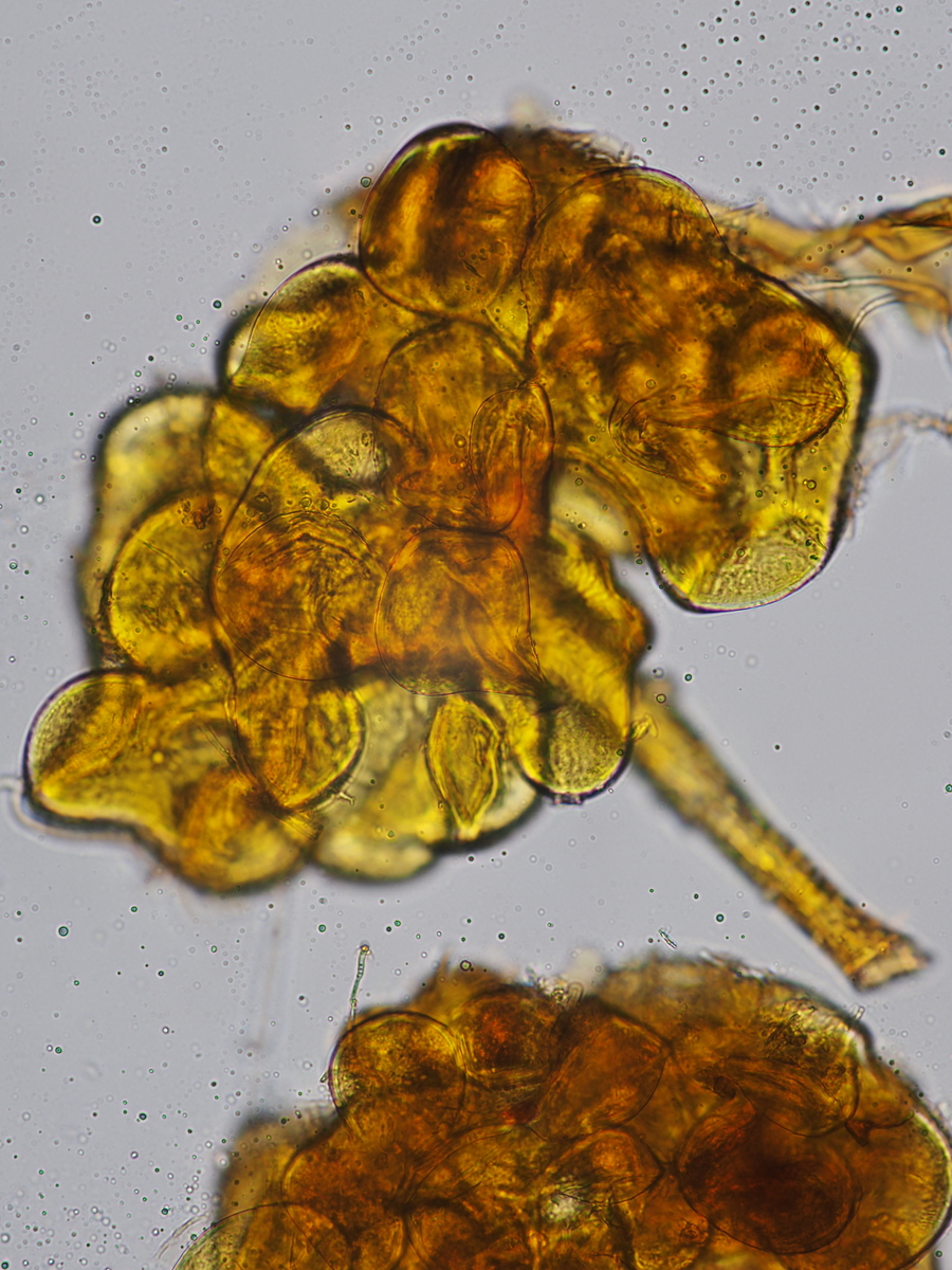 Servus zusammen, angeregt durch Thorben's Empfehlung bin ich gestern mal an die Pegnitz um Bestände von Japanknöterich, Springkraut, Brennessel und Goldrute nach Ascomyceten abzusuchen. Nach drei Stunden im Nieselregen und exakt 0 Bechern bin etwas missmutig wieder nach Hause getrottet. Als Übersprungshandlung habe ich aus dem Erlenlaub an meinem Fahrradparkplatz noch einen Rost und einen verschimmelten Springkrautstängel eingepackt. Mehr aus Trotz und weil ich eh die Calycina von letztens nochmal mikroskopieren wollte damit sichs ein bischen lohnt alles aufzubauen (ich habe leider keinen Platz wo ich das Teil stehen lassen könnte und muss immer alles auf und abbauen, was mit der Fotoausrüstung doch schon ein rechter Auffwand ist). Na aber es hat sich gelohnt, die Vergrößerung hat meine Laune schlagartig verbessert, denn so vermodert und melancholisch wie die vergammelte Botanik daherkommt, so hübsch ist sie doch im Inneren. Eine Identifikation habe ich aufgrund fehlender Literatur erst gar nicht versucht, aber vielleicht gefallen sie euch ja auch ohne Namensschild an der Tür-