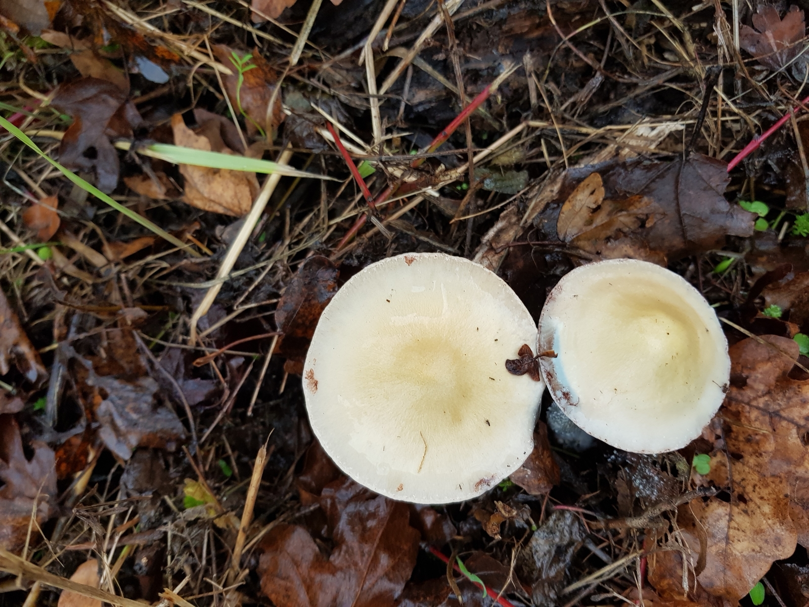 Der Hut ist 3–5 cm breit, flach ausgebreitet; blaugrün nur ein wenig; der Regen wird ihn "abgewaschen" haben (hygrophan); in der Hutmitte etwas gelblich gefärbt. Er besitzt eine abziehbare, schleimige Huthaut.