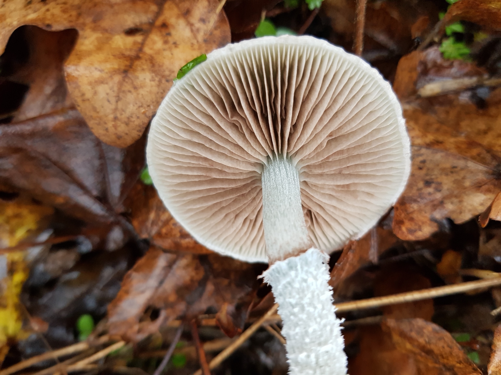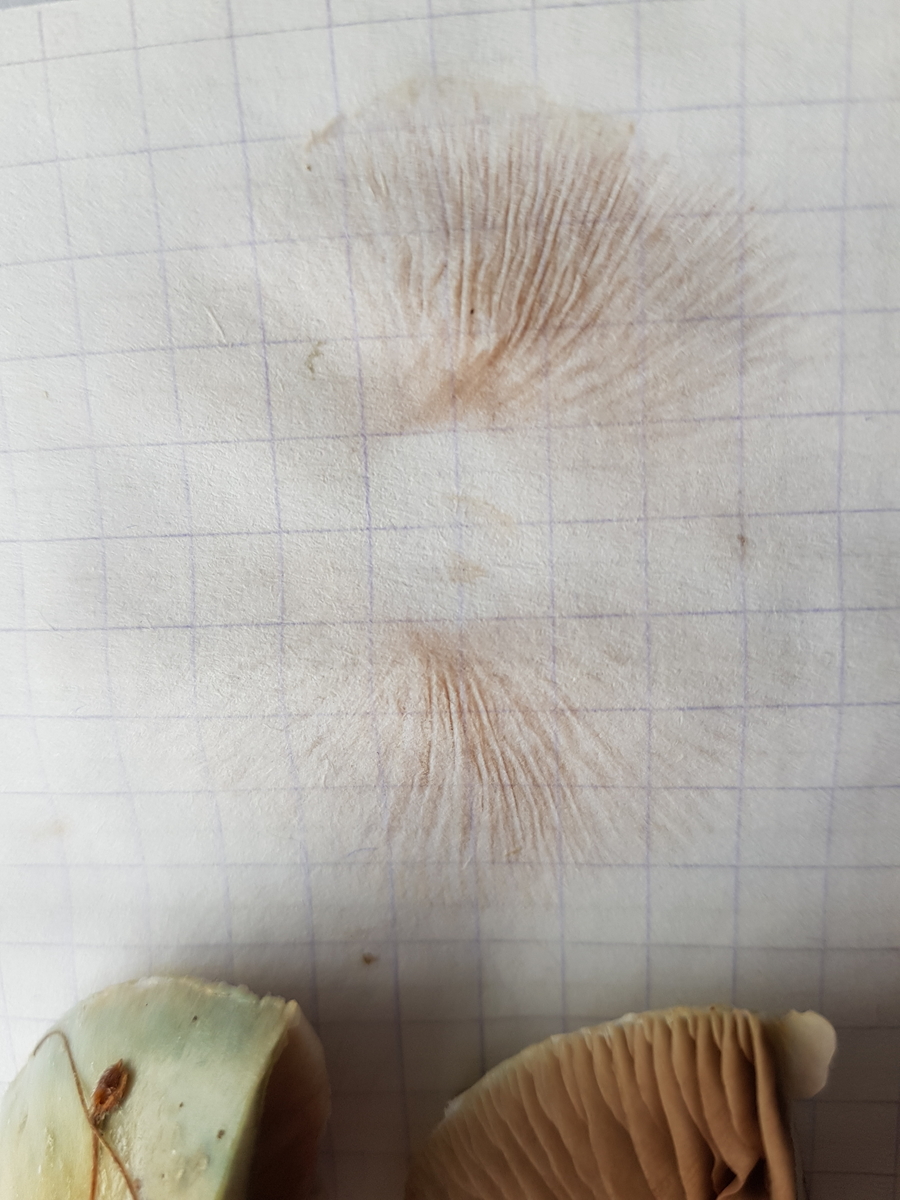 Die am Stiel leicht ausgebuchtet angewachsenen Lamellen sind braun-weiß.