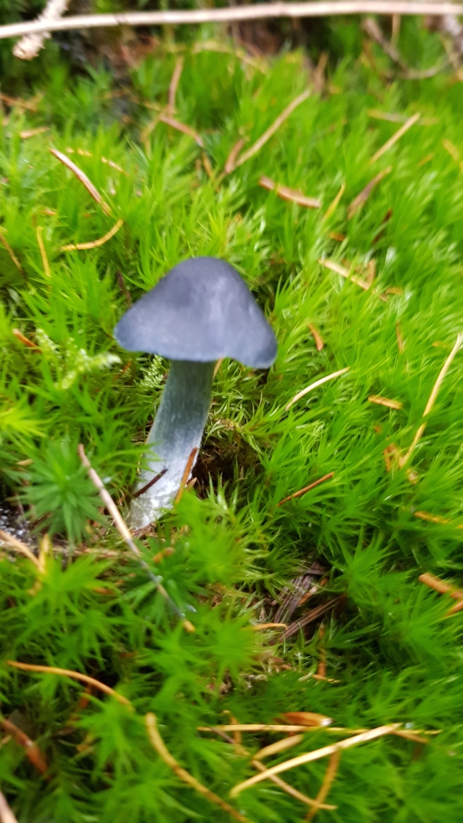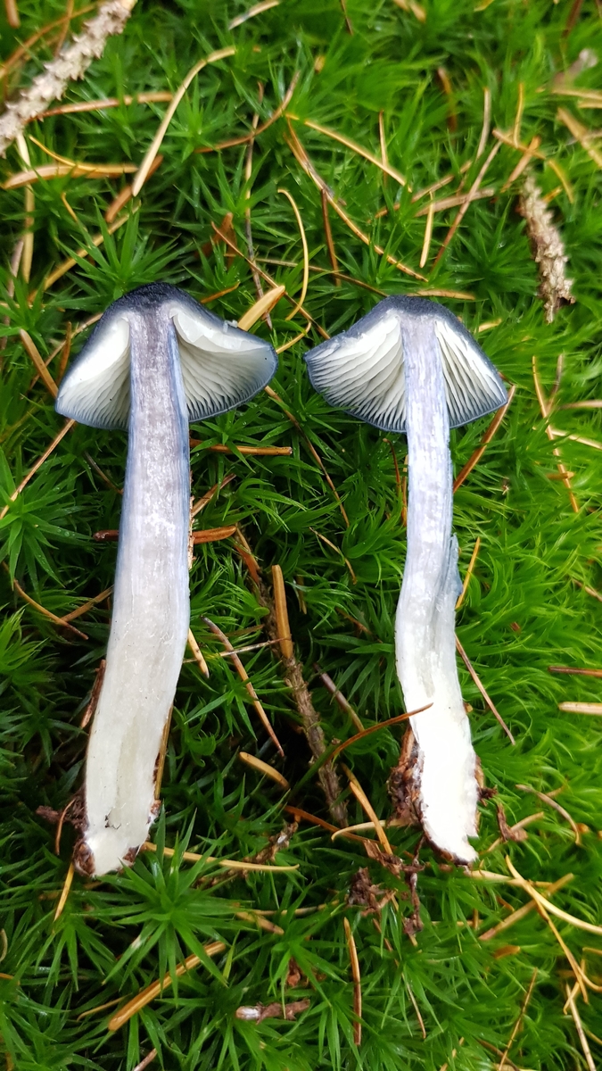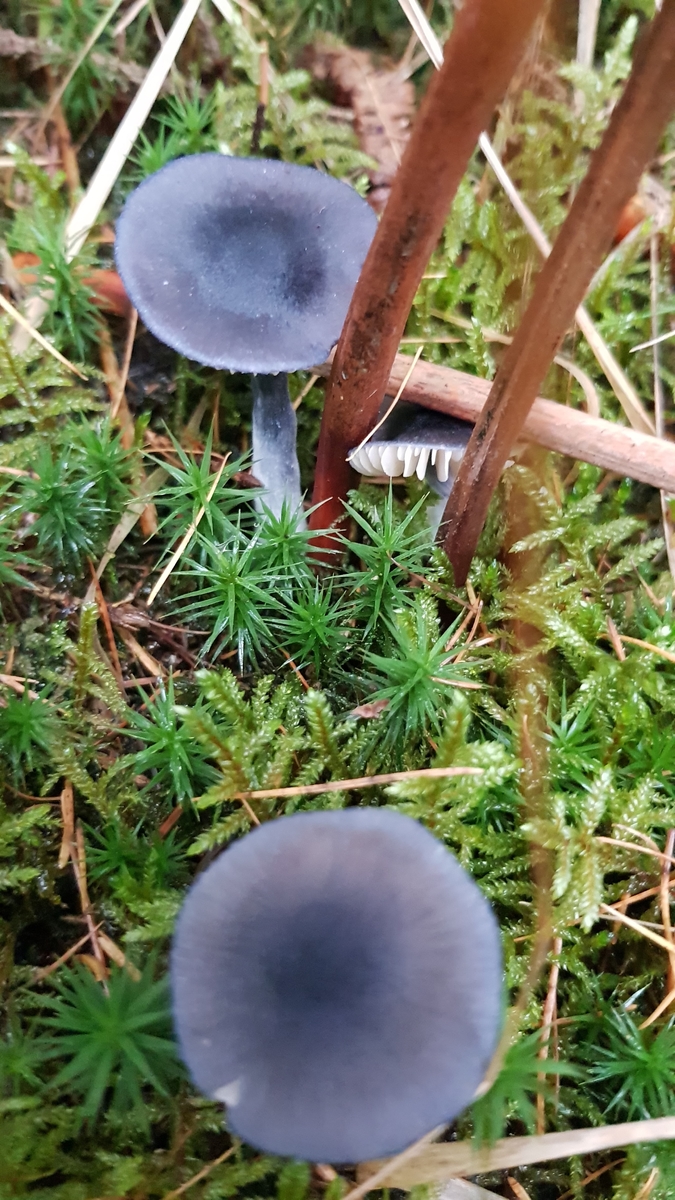 Hut: Die von mir gefundenen Exemplare hatten einen Hutdurchmesser von ca. 2 - 4 cm und waren tintenblau bzw. fast schwarz gefärbt. Lamellen: Die Lamellen sind weiß. Sporenpulverfarbe weiß ich noch nicht, aber ich hoffe rosa, wenn meine Vermutung richtig ist.