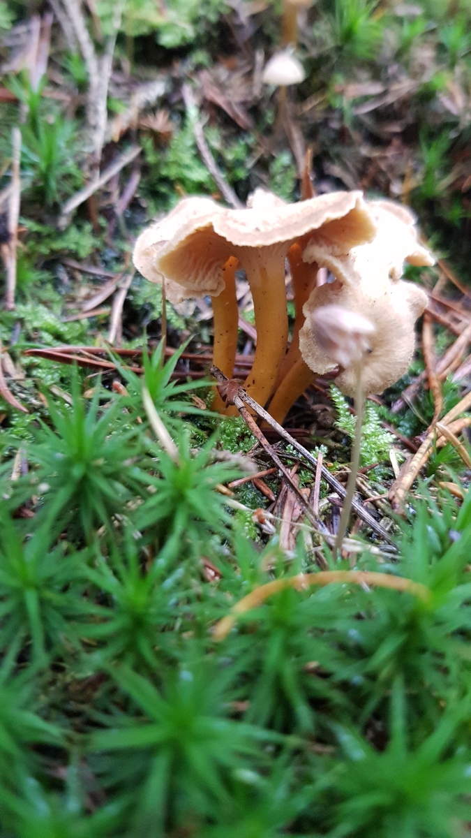 3) Dann hatte ich noch Trompetenpfifferlinge gefunden, wobei an mehreren Standorten gleichzeitig gelbstielige Exemplare und (meistens größere Exemplare) mit graubraunem Stiel vorkamen.Gibt es wirklich einen gelbstieligen und einen normalen Trompetenpfifferling? Mir scheint das an ein und demselben Standort beides vorzukommen. Habe leider nur Bilder von den Gelbstieligen.
