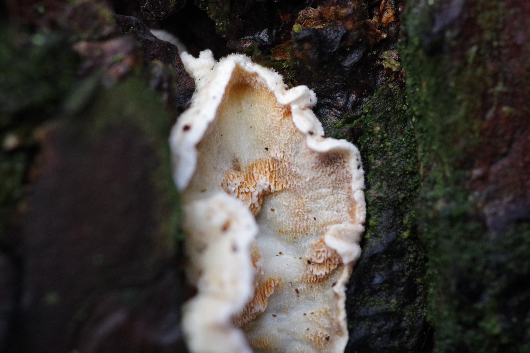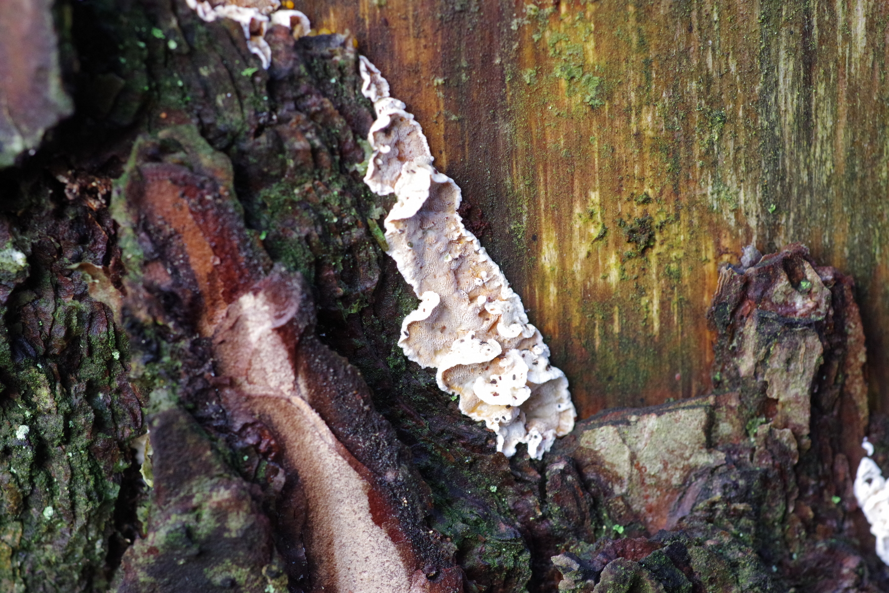 an einer seit max. 2 Jahren toten Kiefer (wahrscheinlich von Heterbasidion sp. ins Jenseits befördert), wo teilweise die Rinde abblättert, wächst ein Porling, der mir vermutlich noch nicht begegnet ist. Fotos vom Schnitt, mit Lineal und KOH-Reaktion liefere ich nach.