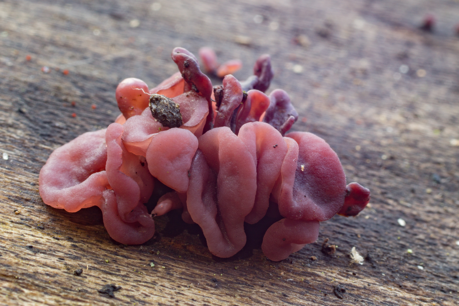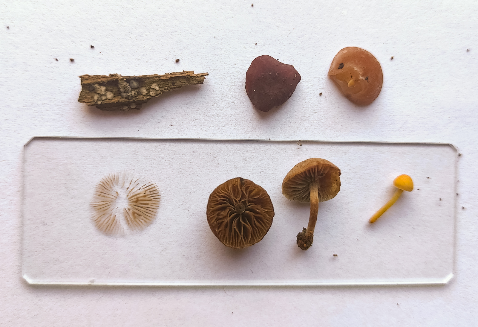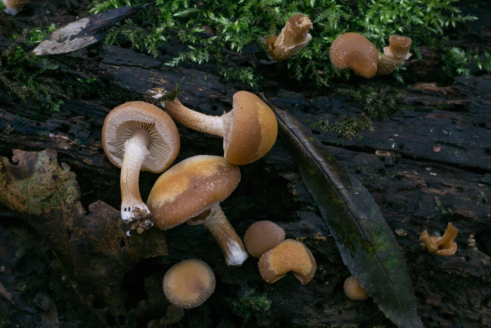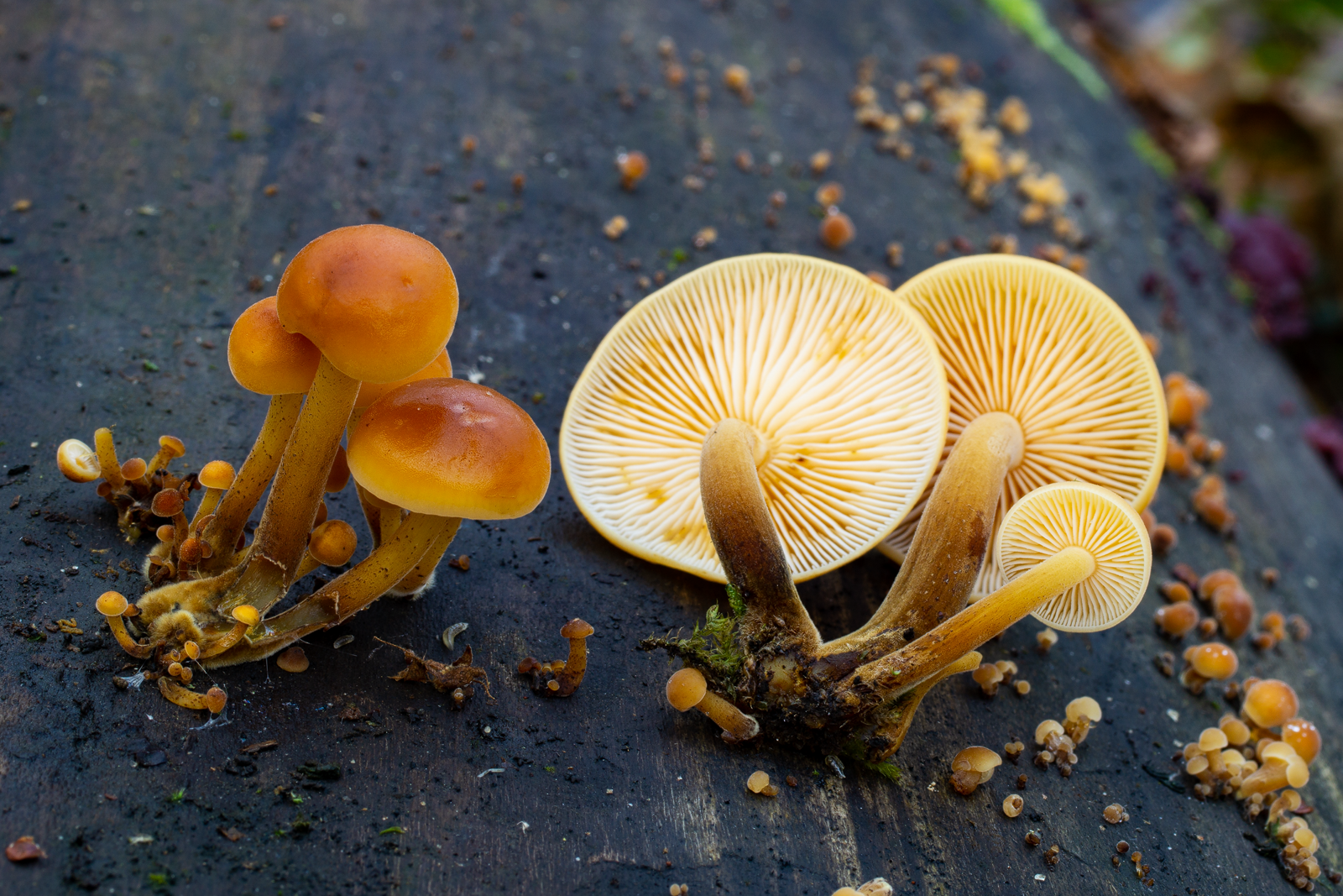 5. Einige Meter weiter erneut ein reichhaltiger Stumpf mit jeder Menge Babies. Flammulina velutipes und Ascocoryne sarcoides.