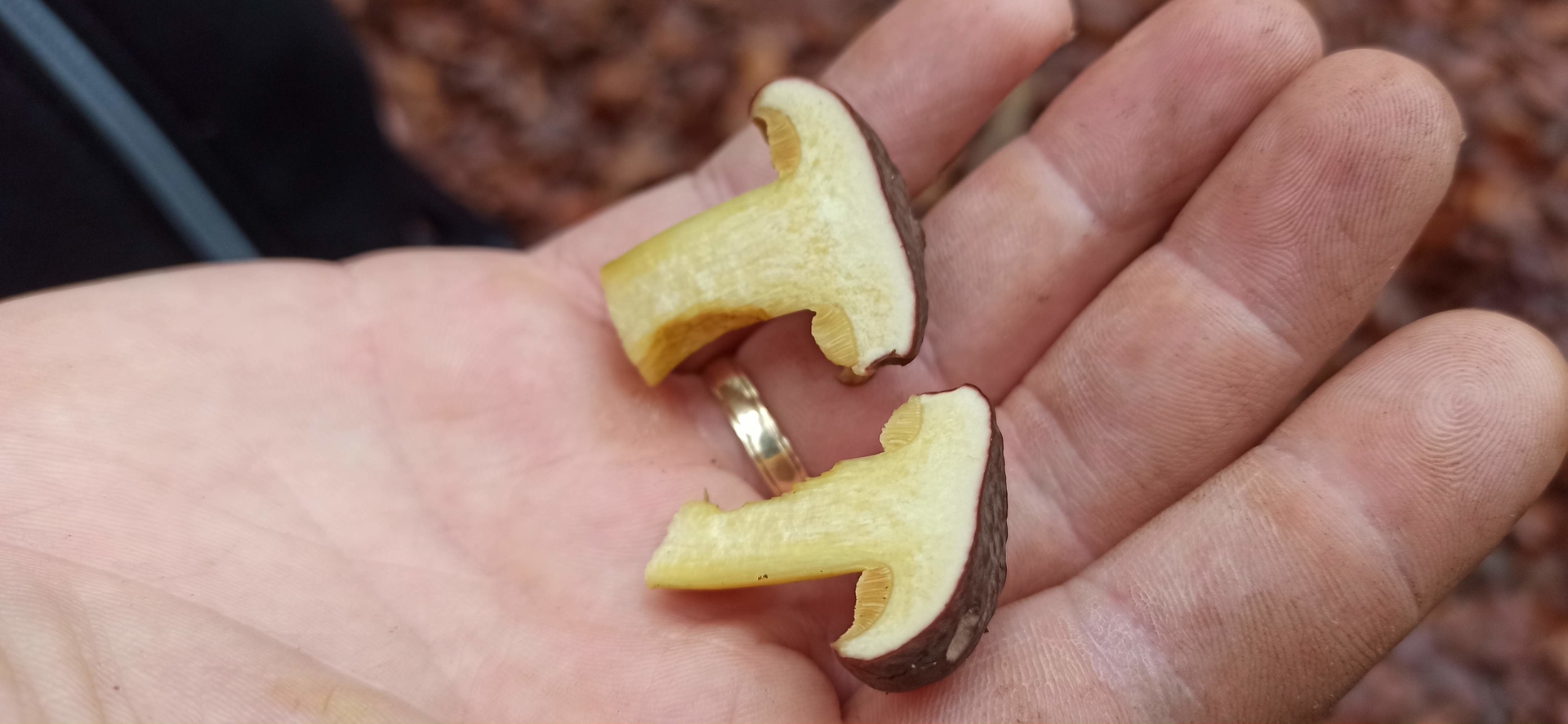 Bei dem Röhrling fehlt halt die Stielbasis, aber mit deinen weiteren Angaben wird Xerocomellus pruinatus noch ein kleines bisschen wahrscheinlicher.