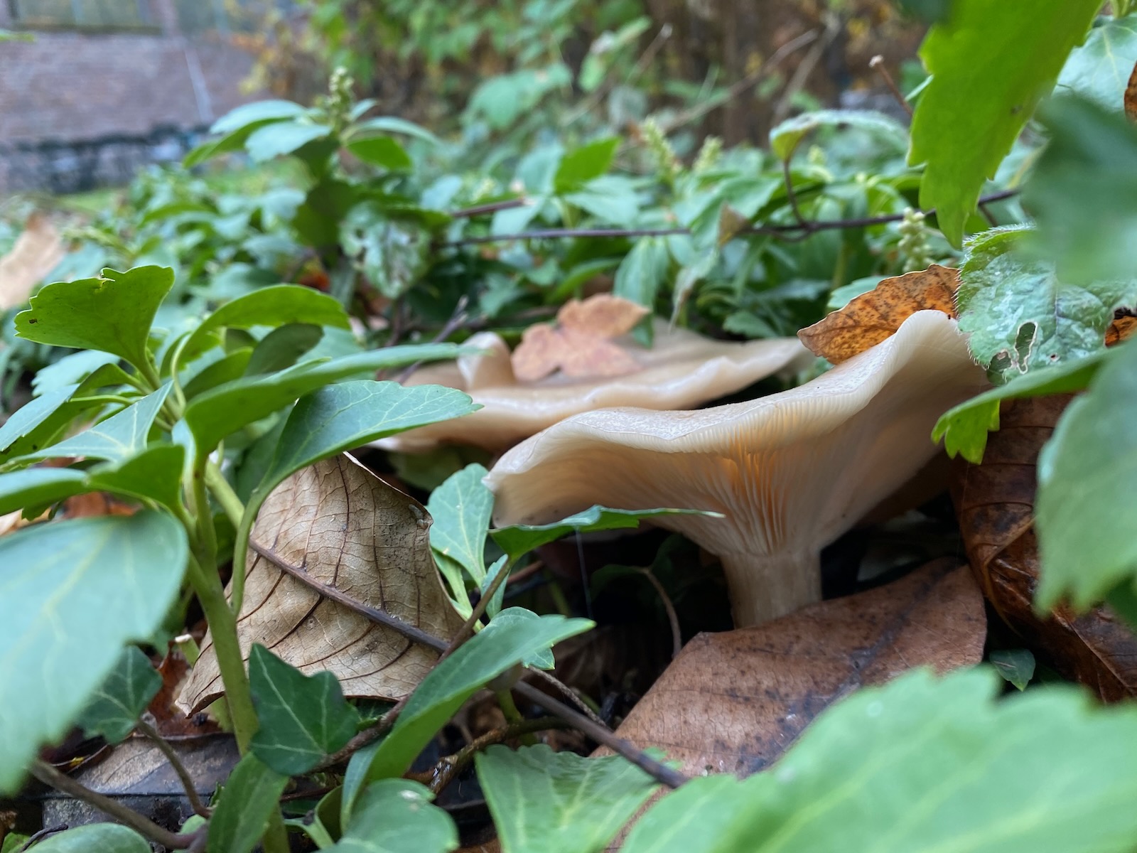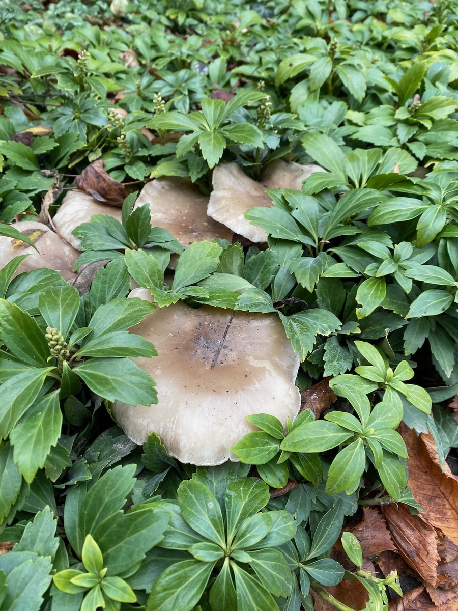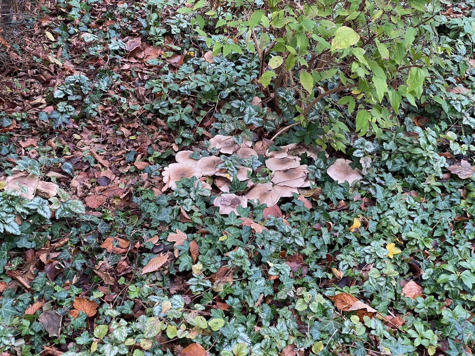 das könnten Nebelkappen sein. Ist natürlich schwierig, wenn man die Pilze nur halb verdeckt von Blättern und Zweigen sieht. Am besten mal einen aus der Gruppe rausnehmen und ganz zeigen.