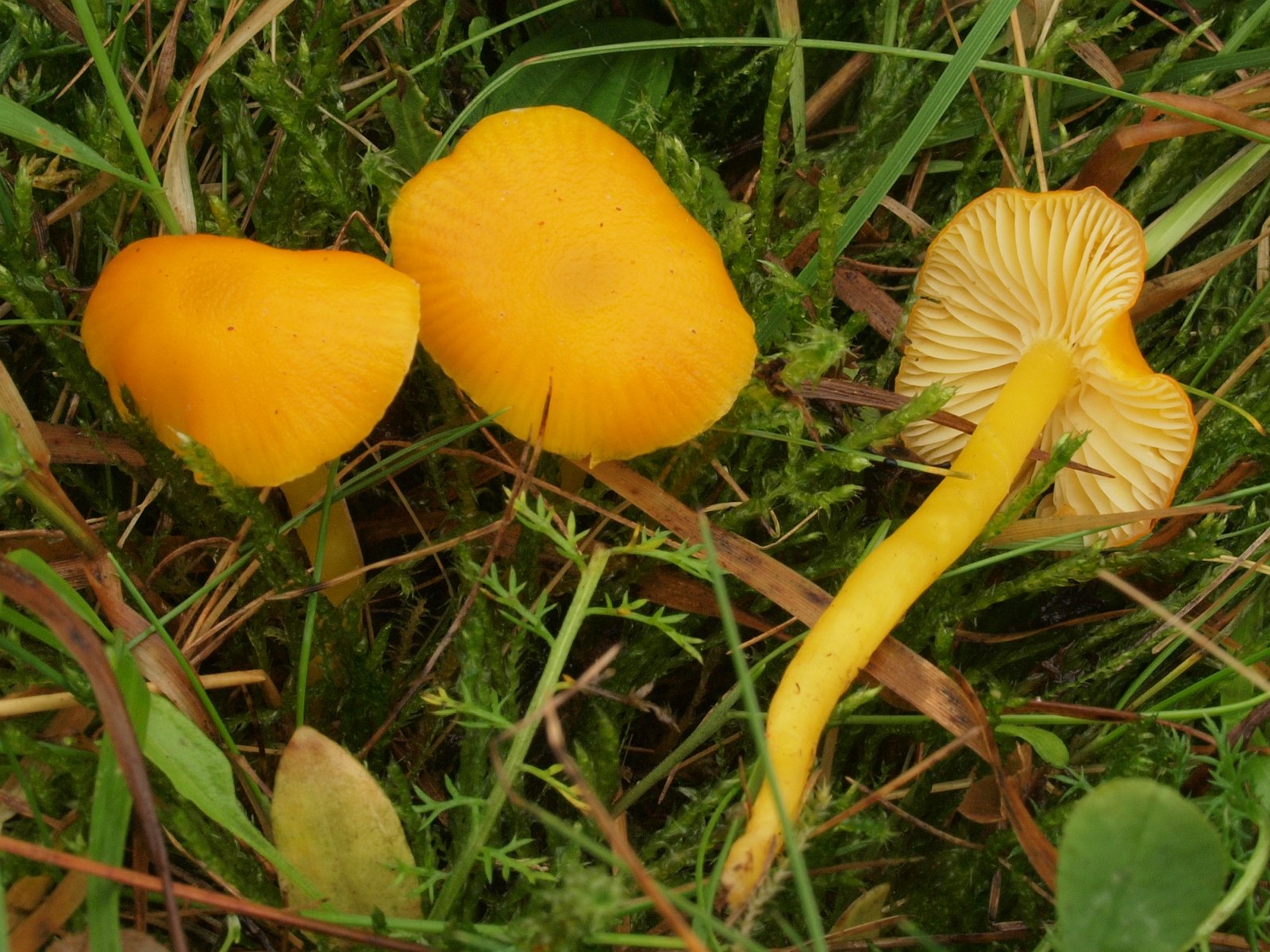 Der Gebrechliche Saftling (Hygrocybe ceracea) Hut etwas schmierig, Stiel trocken und Lamellen breit angewachsen, war neu für das Gebiet.