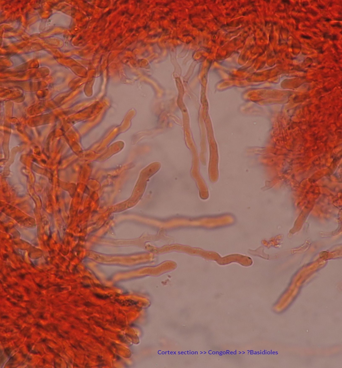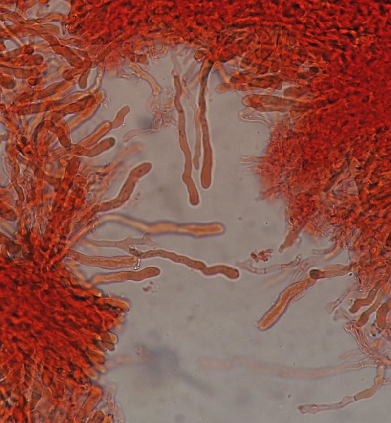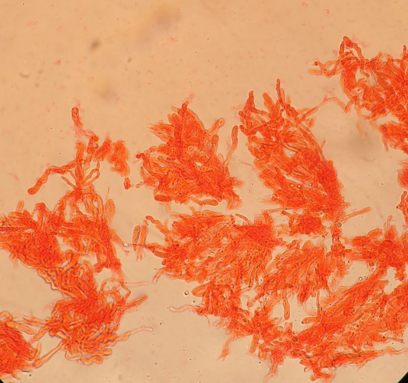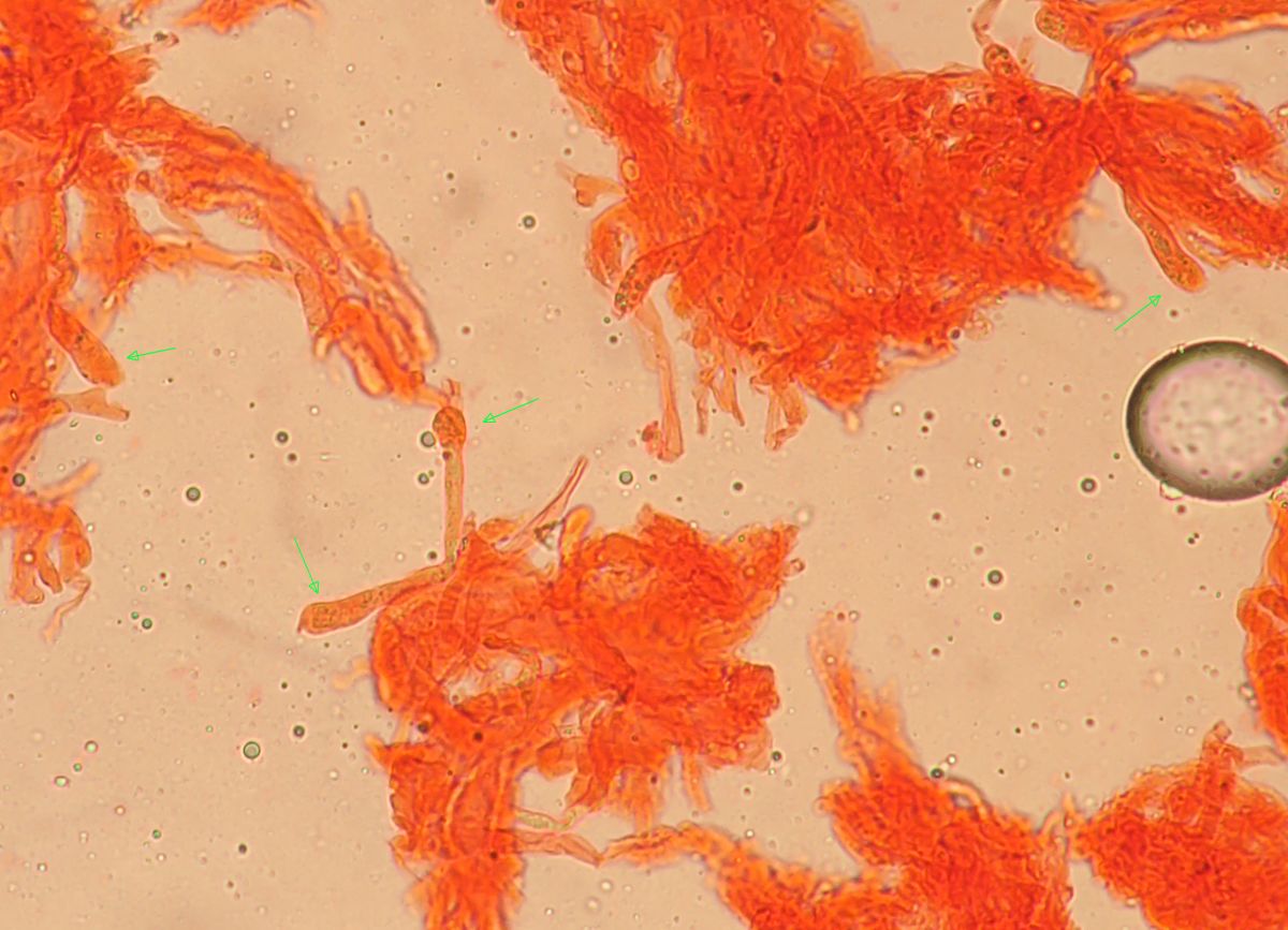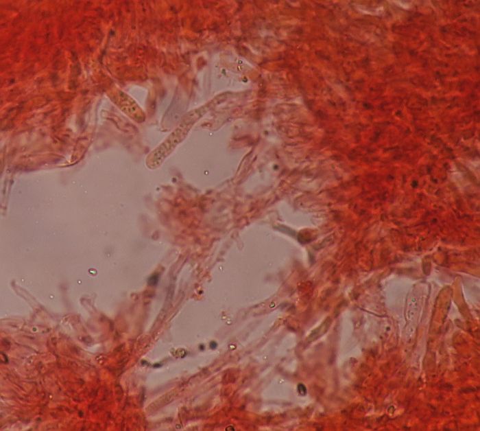 Under the microscope, there is more or less the same picture of before, but what we assume that are basidioles are more wriggly (curved/flexuose).