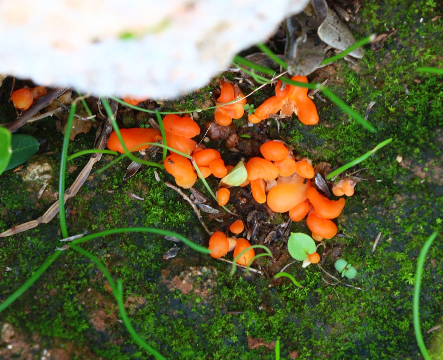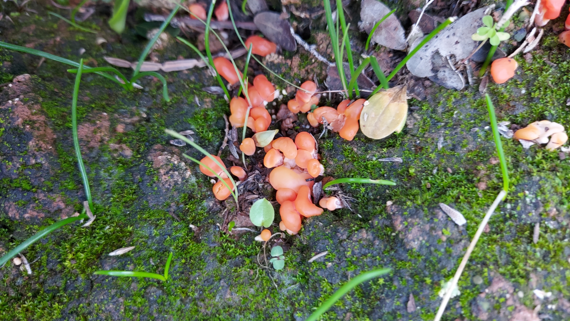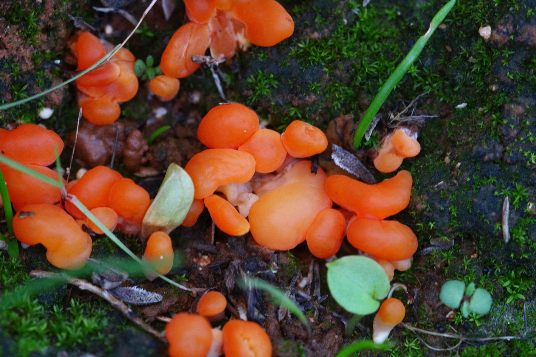 Orange Jellybaby (Clavaria-like) fungus, on moss - exciting!