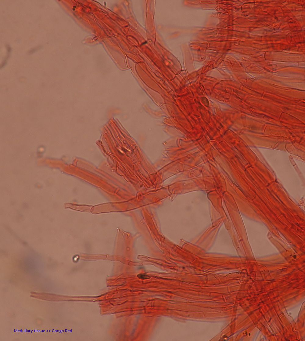 OK I have a small update. I re-examined the material which was in fridge for 3 days. They have not changed much physically, but the outer layer became slightly more developed and we can be sure that this is a Basidiomycete since I saw basidioles. None of them was mature. The medull became completely whitish-yellow now (central orange zone faded away) and there were some invaginations inside (like it is still shaping up). The medullary tissue remains undifferentiated, in parallel bundles, but they are elongated, more straight and still with perpendicular septae (- rectangular hyphae)