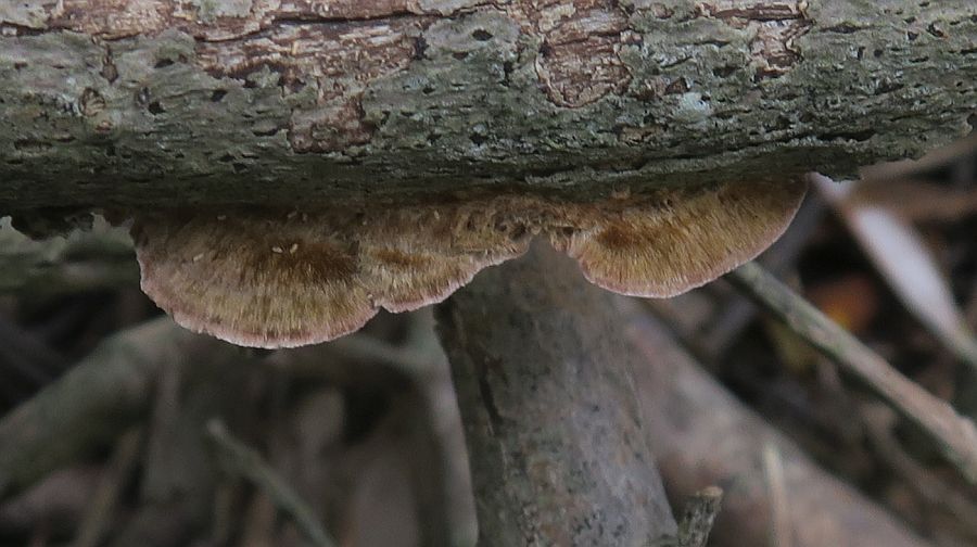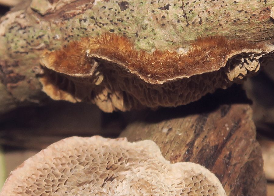 Is it Coriolopsis gallica please? I have a sample at home. The hispid upper surface, habitat and colours of the Hymenium suggest this species.