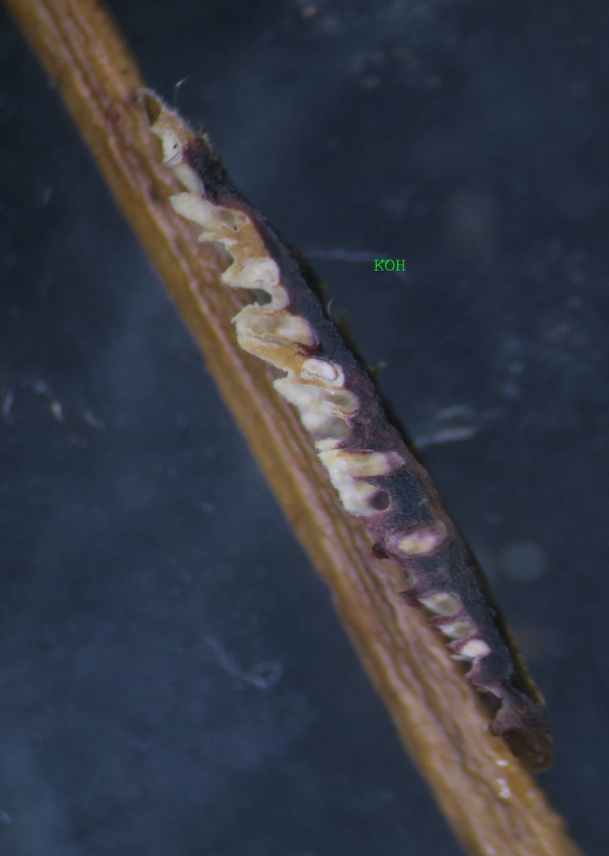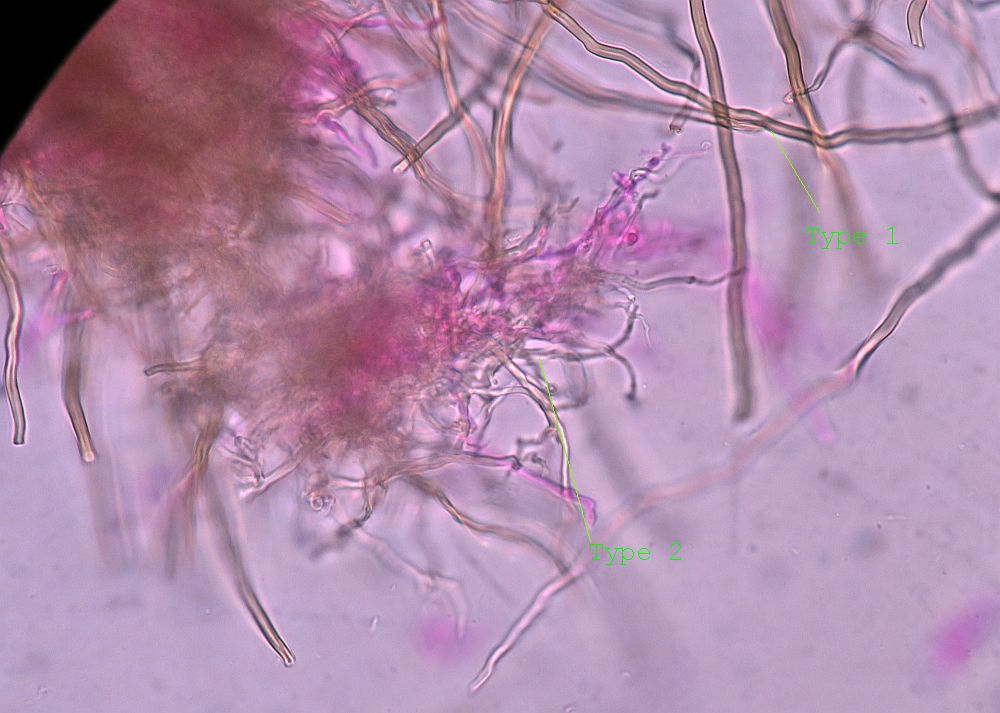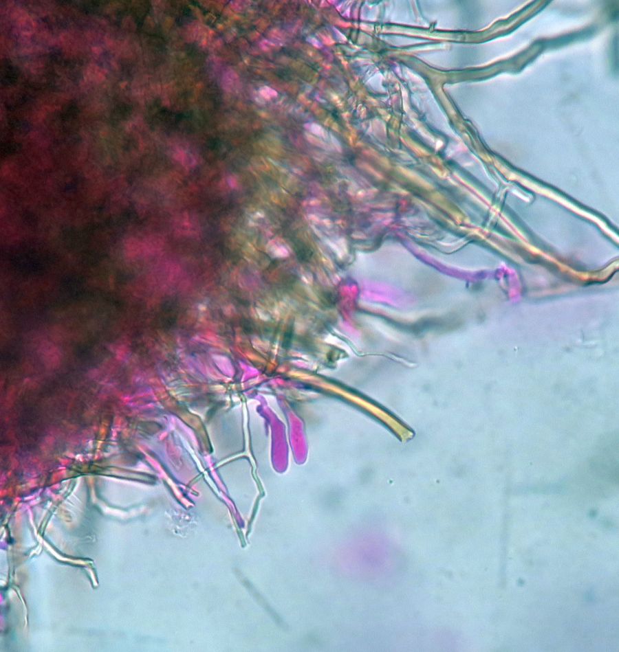 Yes, I did. I saw a tobacco brown trama which with 4% KOH it becomes wine-red, darkening to blackish-purple. I tried to mount the trauma and tubes and I am sure that there are two types of hyphae and maybe three (trimitic) if the basidiole baring hyphae are considered different from the generative. The hairs are two types, brown and dull brown (almost black). The hymenium have a lilac tinge at the border.