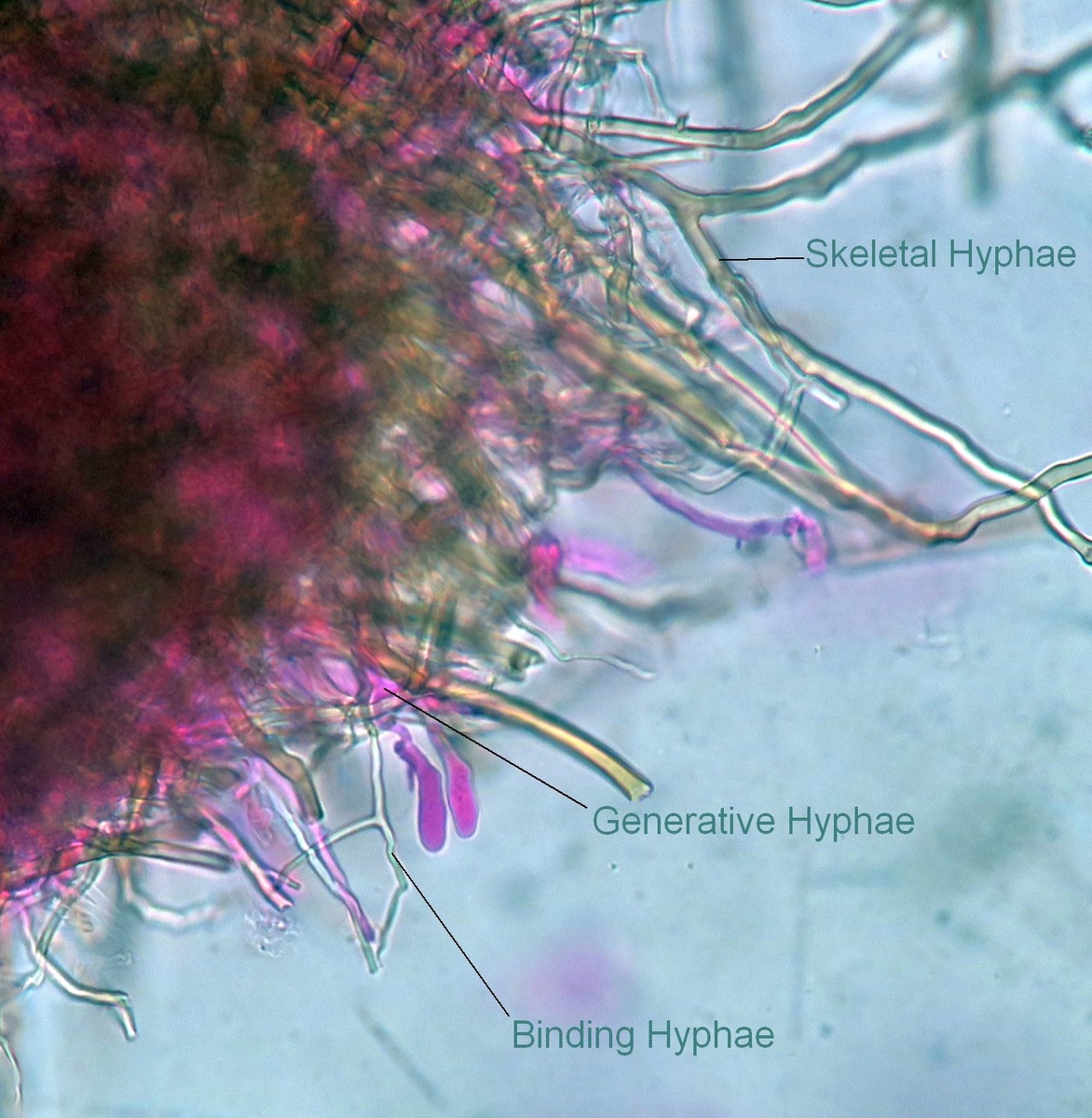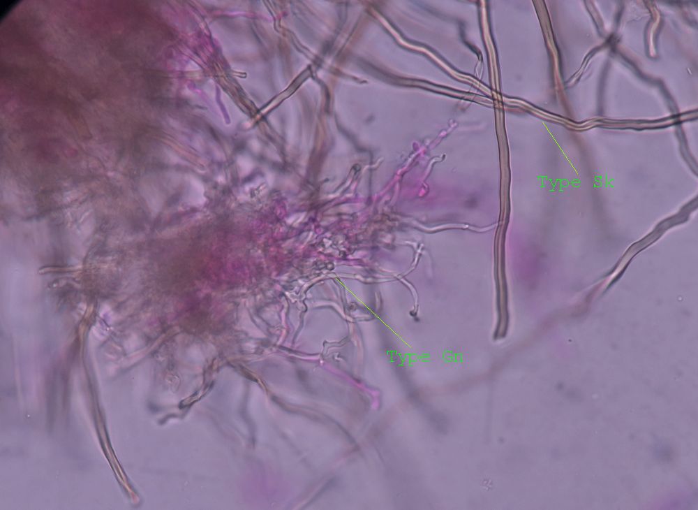 Like many trametoid funghi, it is considered to be trimitic. Besides the generative Hyphae (mostly thin-walled, septate with clamps, in Your preparations plasma bright pink in Phloxin) there are skeletal hyphae: The long and unseptate, thick walled and broad Hyphae which are unbranched, and the binding hyphae, which are the thin but thickwalled ones, also without septations but much branchings.
