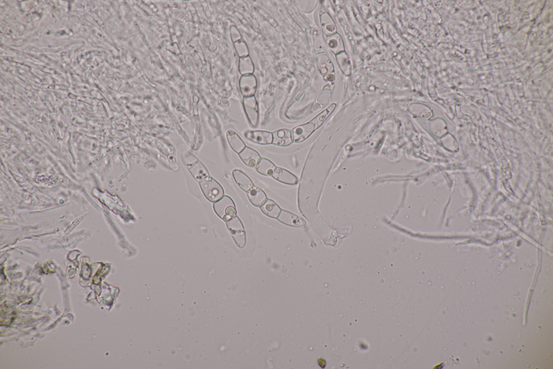 5. Im trockenen Zustand wirkte dieser Pilz auf Schilf erstmal wie Telien eines Rostpilzes, aber nach dem Einweichen war klar: Das ist Glibber! Richtig reif ist der Pilz leider noch nicht, aber es waren hier und da doch ein paar rundliche Sporen zu erkennen, die einen zusammen mit den Phragmobasidien mit Basalschnalle und Schnallen an allen anderen Septen zu Tremella bringen. Da würde dann Tremella spicifera ein heißer Kandidat sein, zumal der Befall an andere Stelle auch deutlich an länglichen Lagern eines Pyrenomyceten auftrat, der mal Massarina arundinacea gewesen sein könnte.