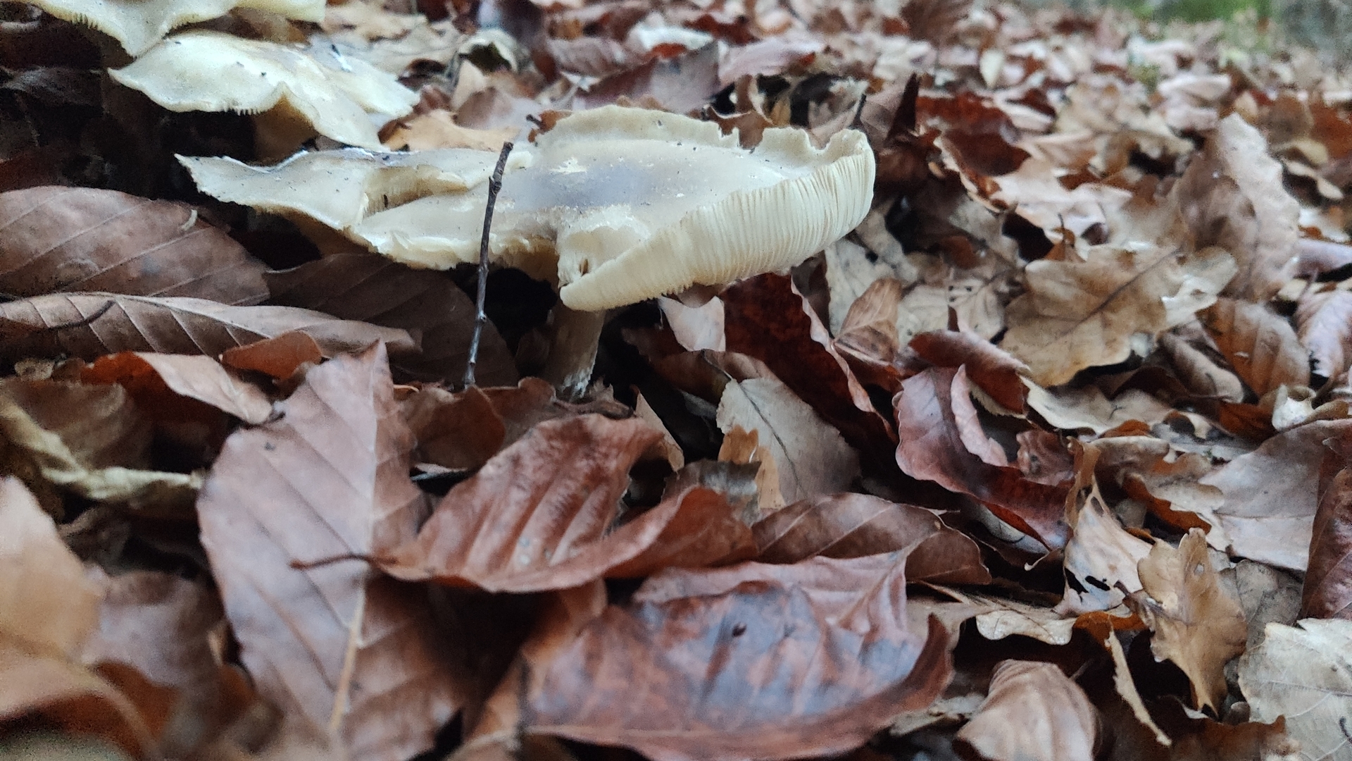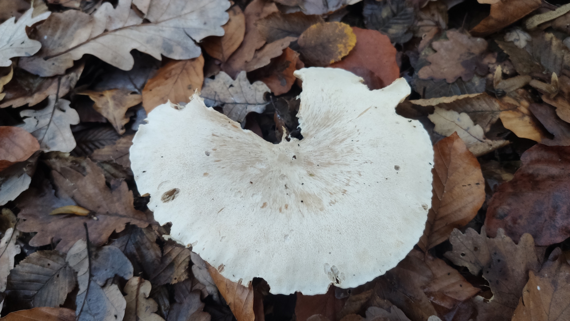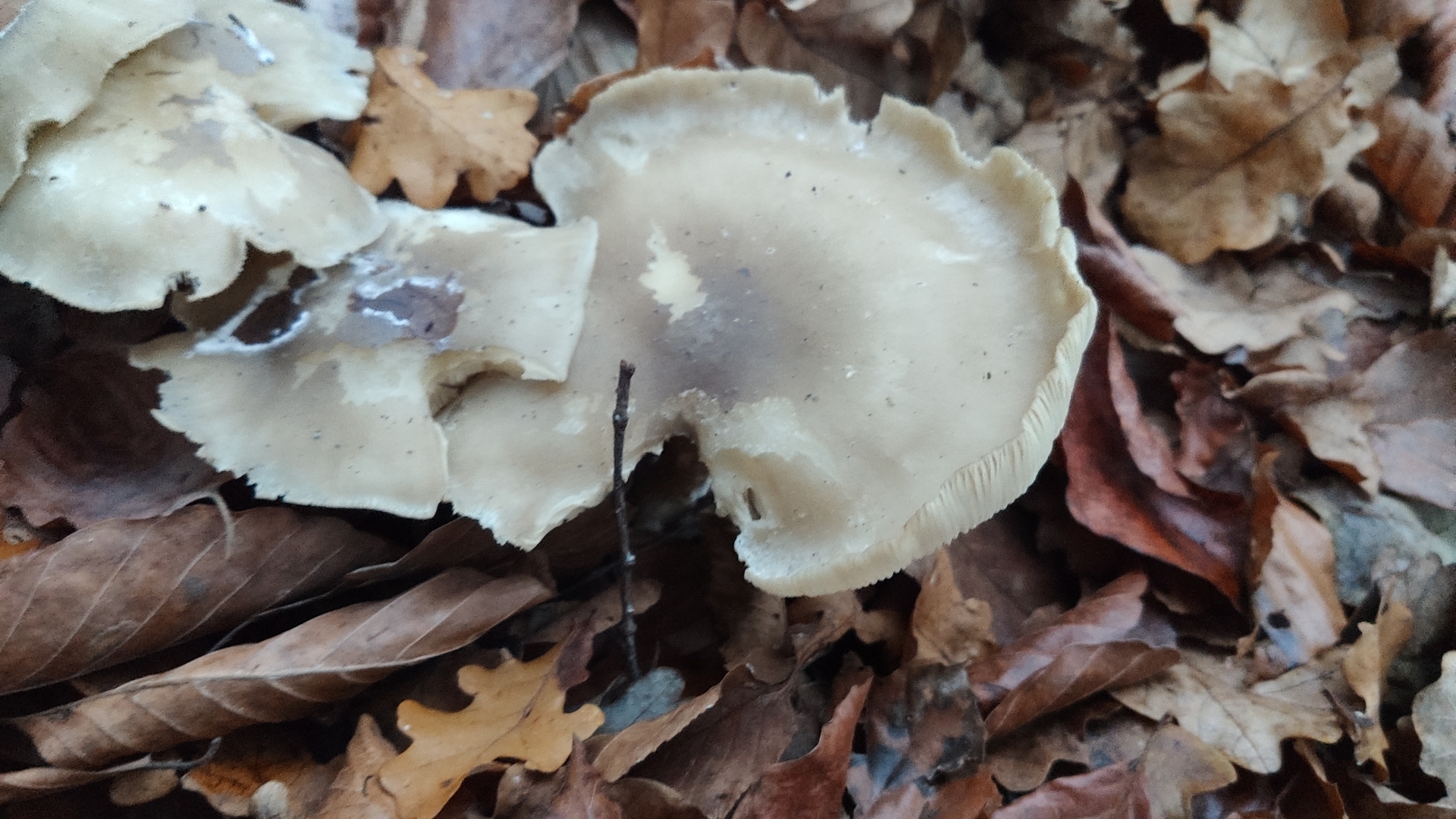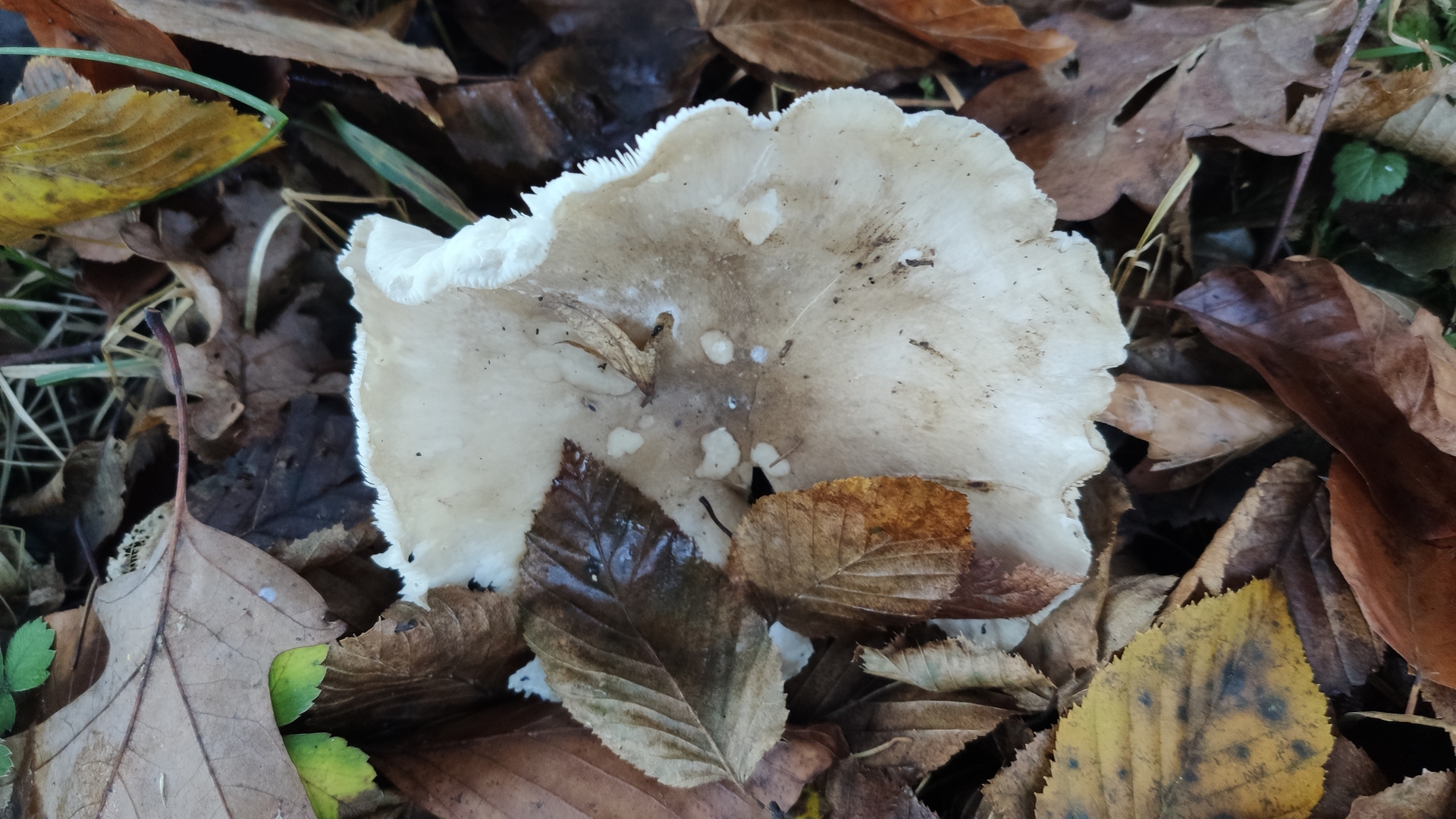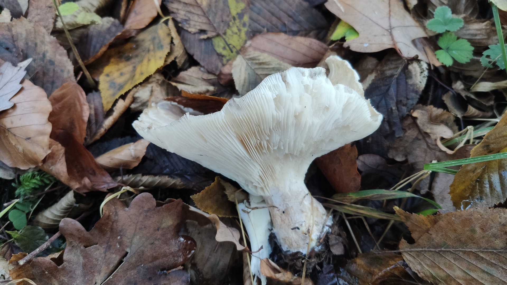 Eine gute Idee zu Anfang ist erst einmal zu versuchen selbst mit einem Pilzbuch oder (man möge mir verzeihen) einer App selbst zu bestimmen und die Merkmale zu vergleichen. Hier wärst du mit Auftreten im Spätherbst, nebelgrauer Hutfarbe, herablaufenden, weißen Lamellen und ausgeprägtem Geruch wohl recht schnell bei der Nebelkappe (Clitocybe nebularis) gelandet. Schau dir die Merkmale nochmal an und vergleiche, dann lernst den Pilz auch kennen und wenn du nochmal welche findest rieche auf jeden Fall mal dran.