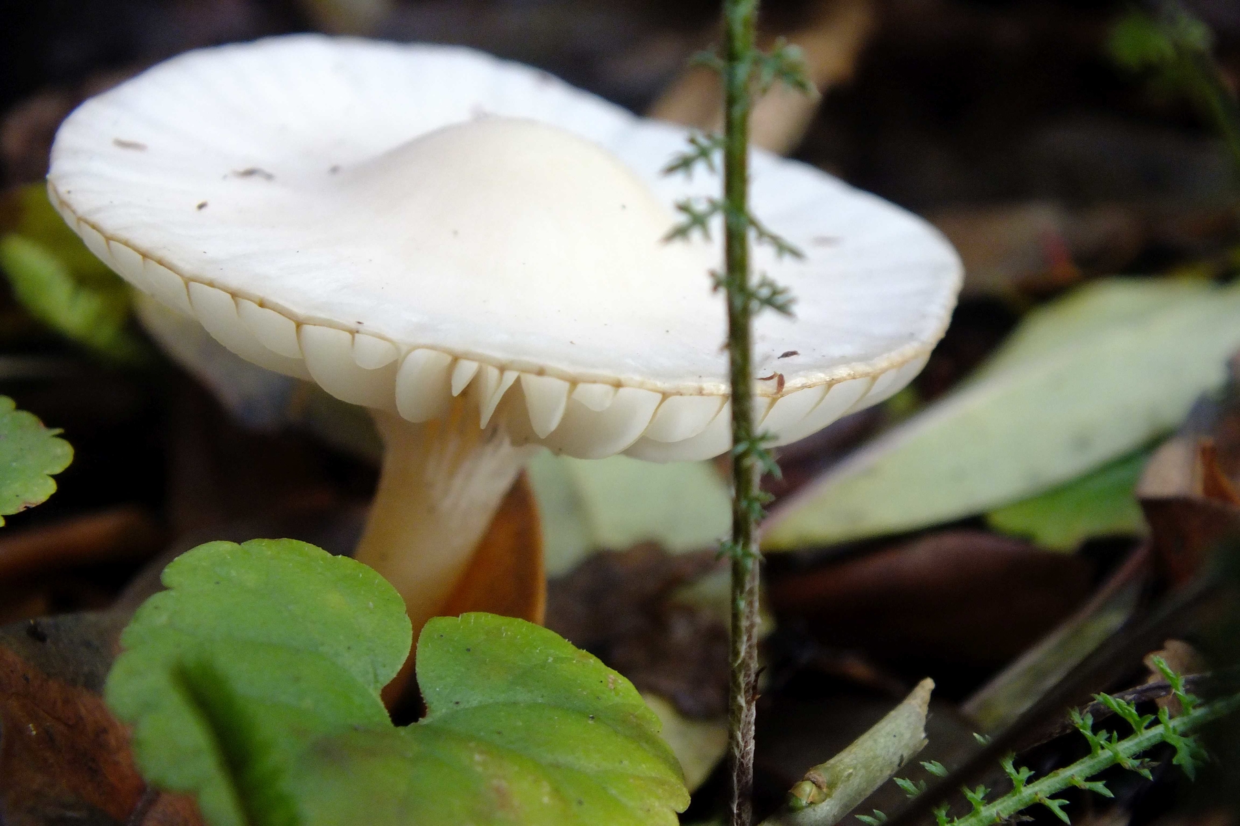 Huthaut, Lamellen und Stiel zeigen die gleiche crème-weiße Färbung, einige wenige Exemplare sind leicht gelblich gefärbt