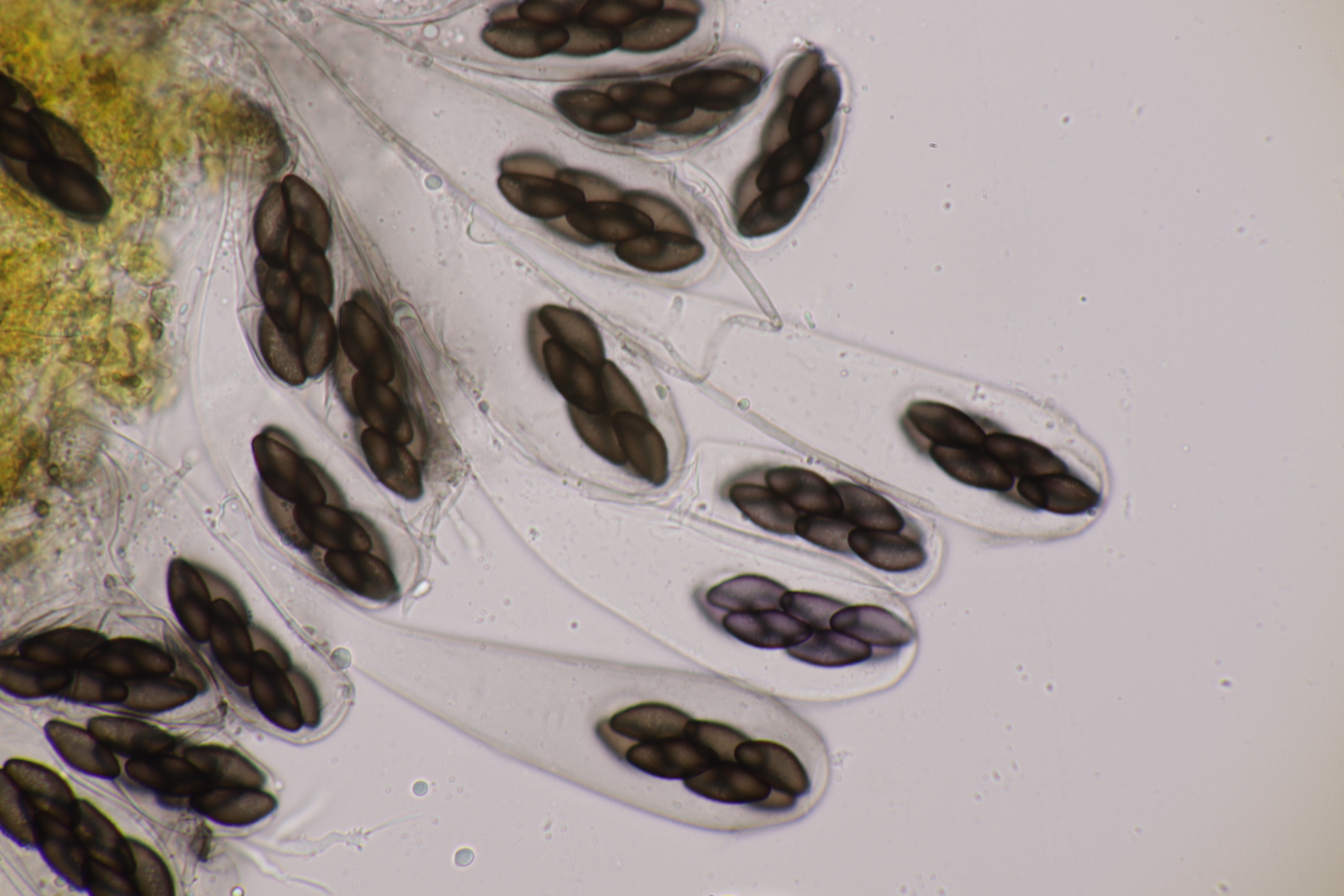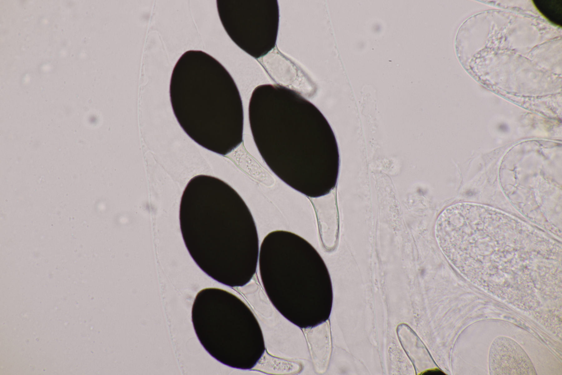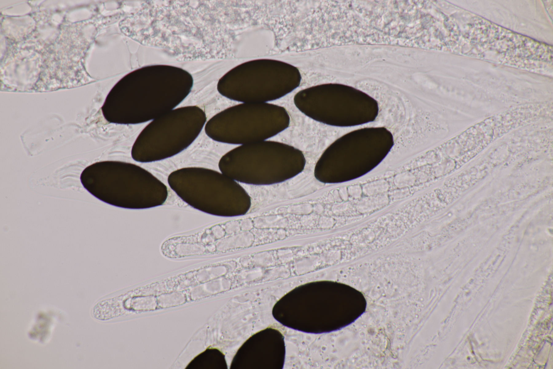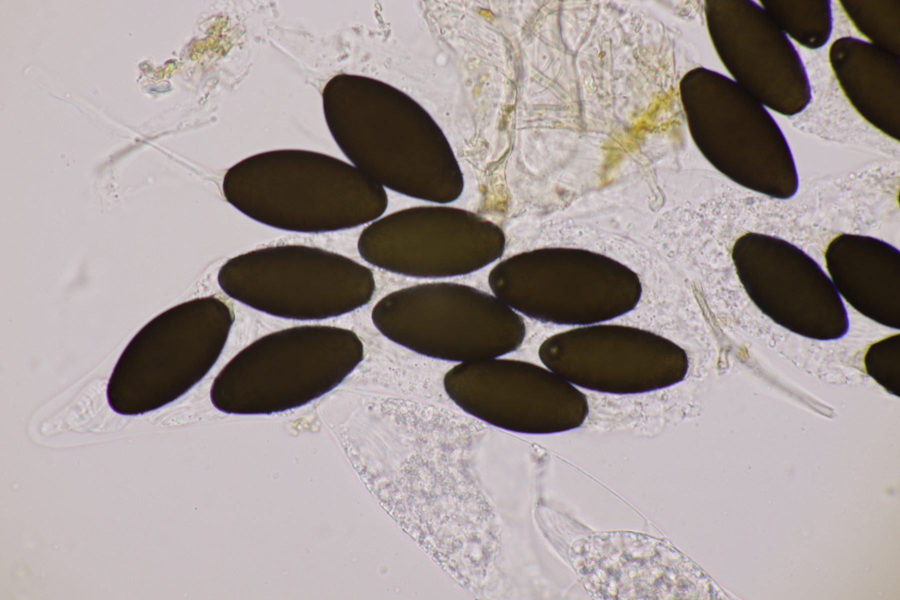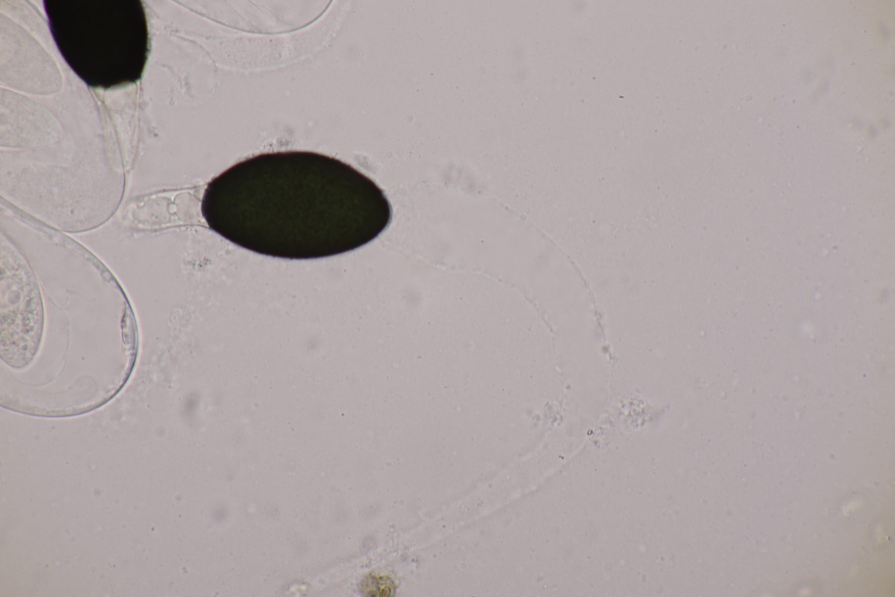 I.2 Leider nur ein Einzelexemplar: eine Podospora mit vielen Sporen im Ascus. Die Sporen messen 21-24 x 14-15 µm. Wie viele es genau waren, ließ sich leider nicht genau ermitteln, es liegt aber um die 100. Damit sind dann nur noch Podospora bifida und setosa im Rennen. Da das Pedicel um die 5 µm breit ist, geht meine Tendenz hier zu Podospora bifida.