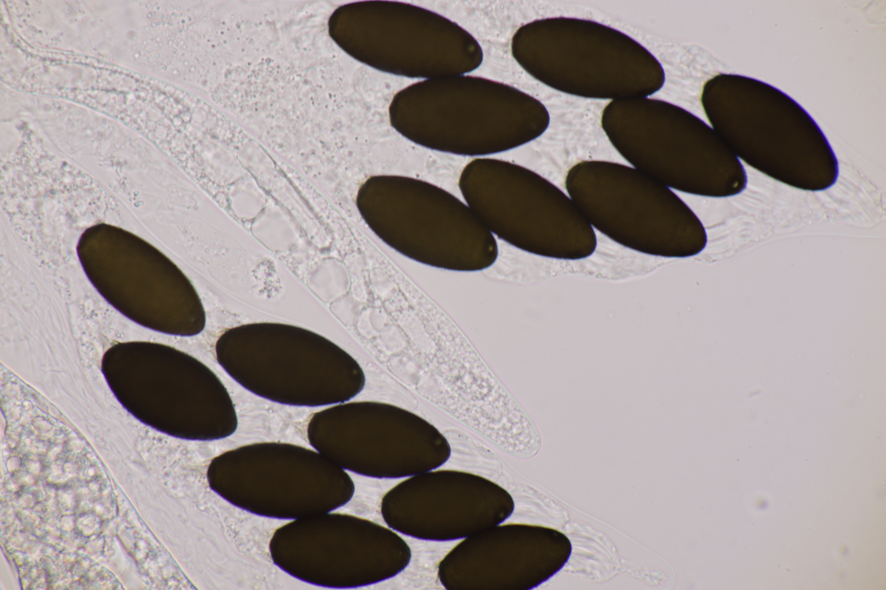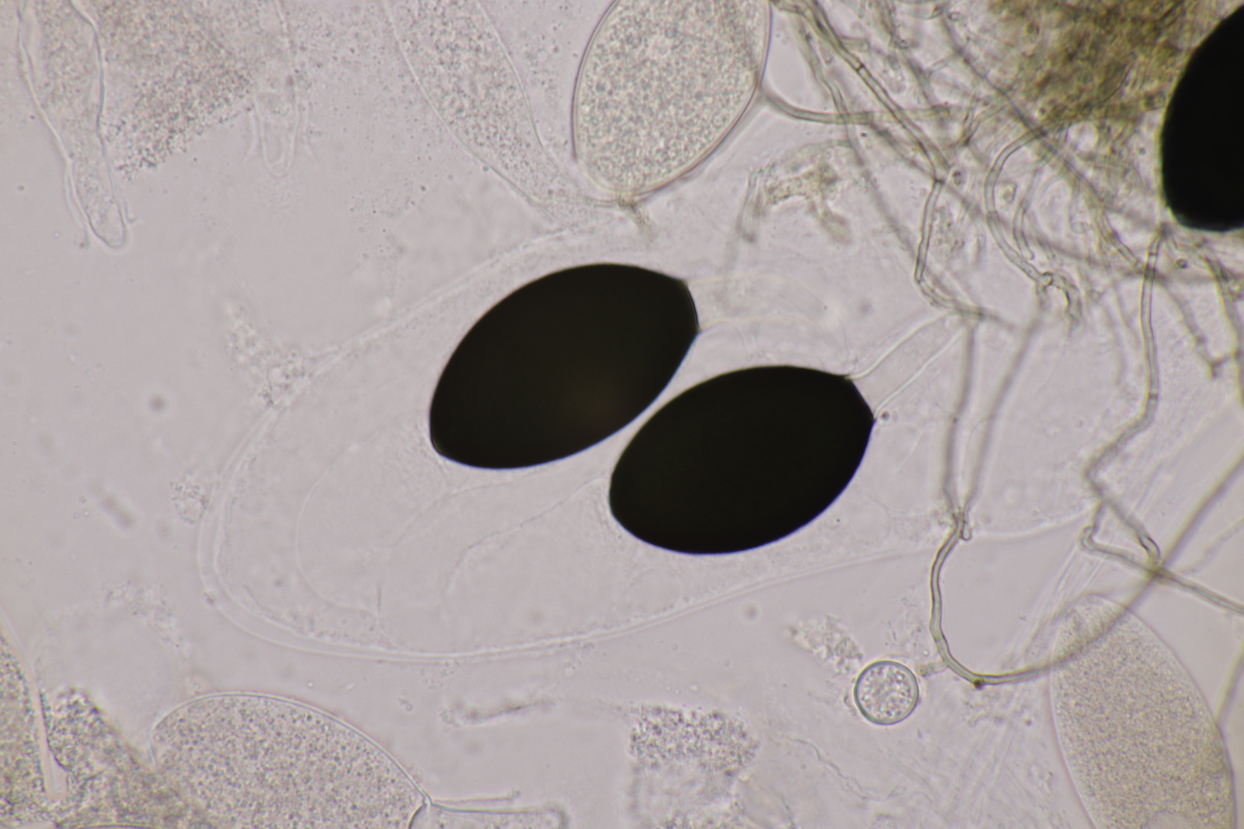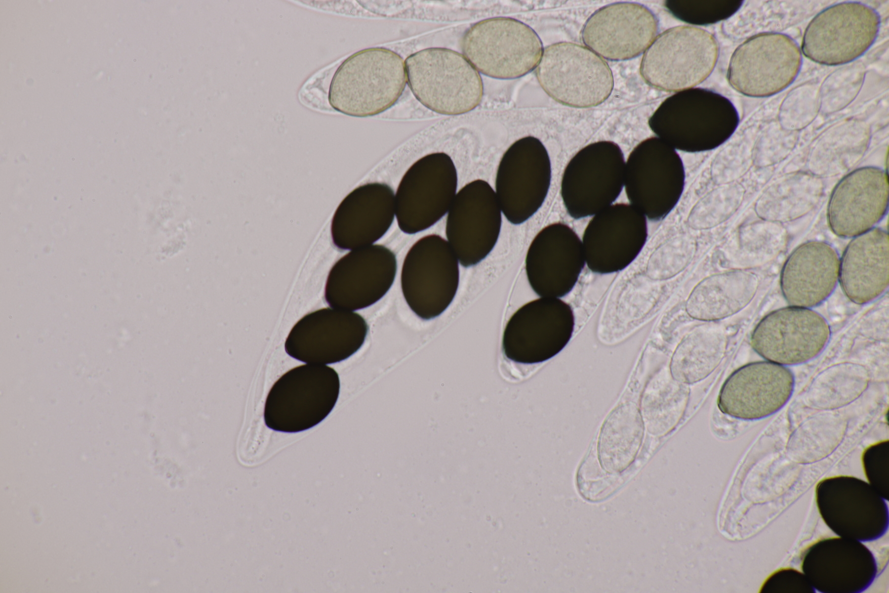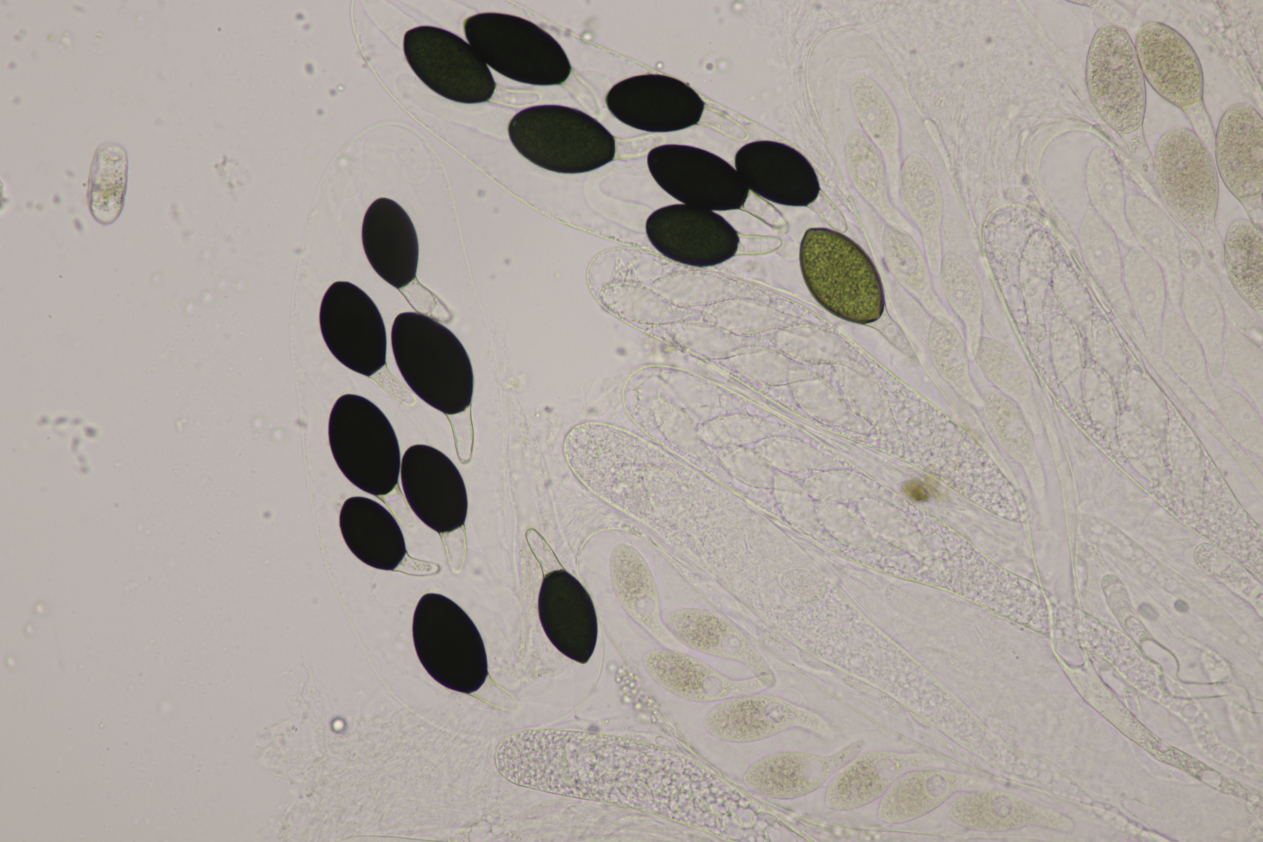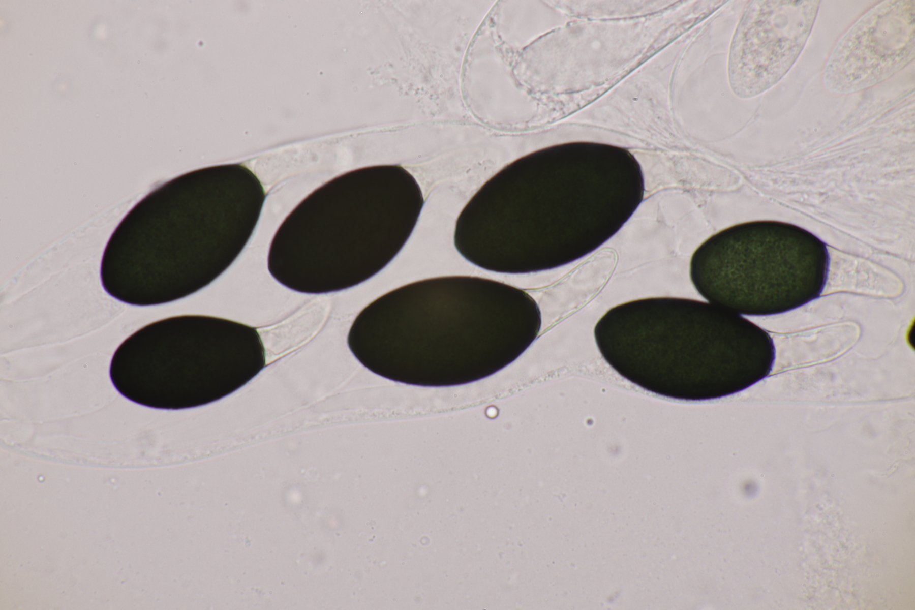 I.2 Leider nur ein Einzelexemplar: eine Podospora mit vielen Sporen im Ascus. Die Sporen messen 21-24 x 14-15 µm. Wie viele es genau waren, ließ sich leider nicht genau ermitteln, es liegt aber um die 100. Damit sind dann nur noch Podospora bifida und setosa im Rennen. Da das Pedicel um die 5 µm breit ist, geht meine Tendenz hier zu Podospora bifida.