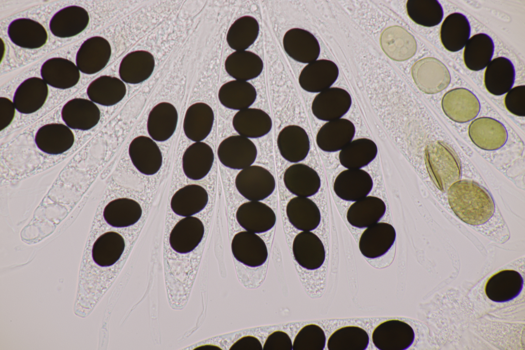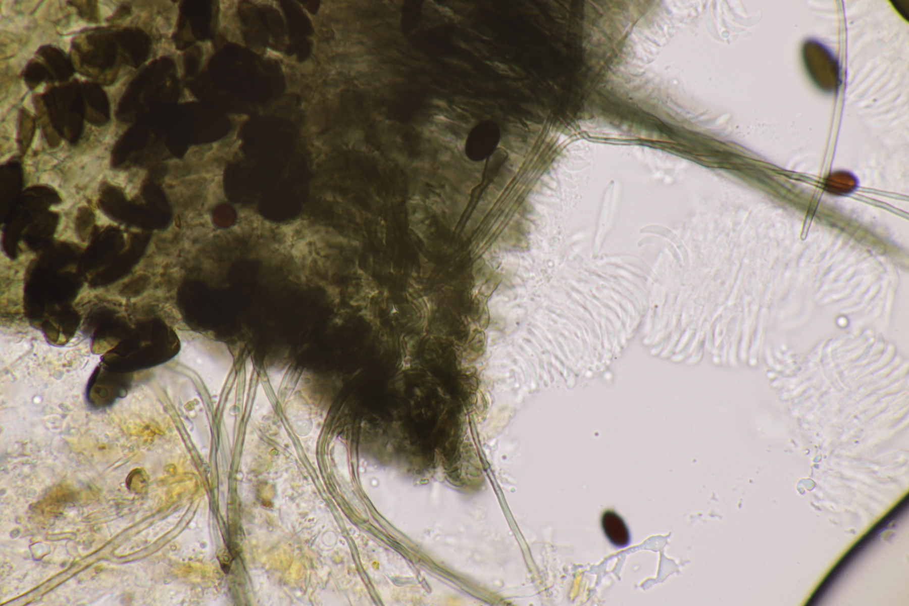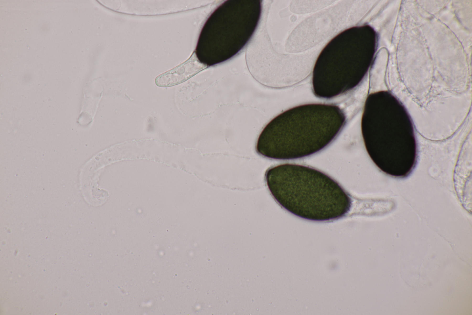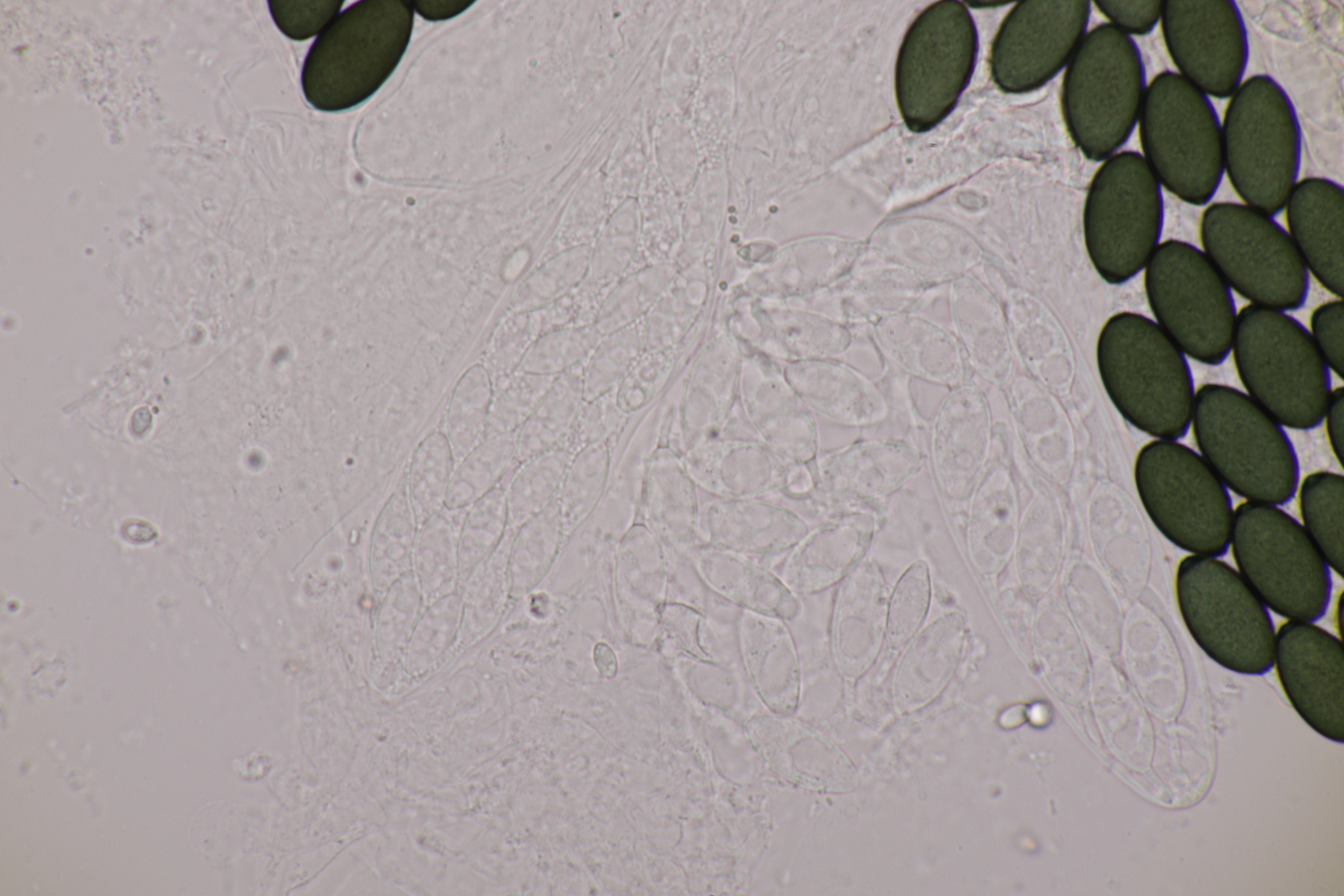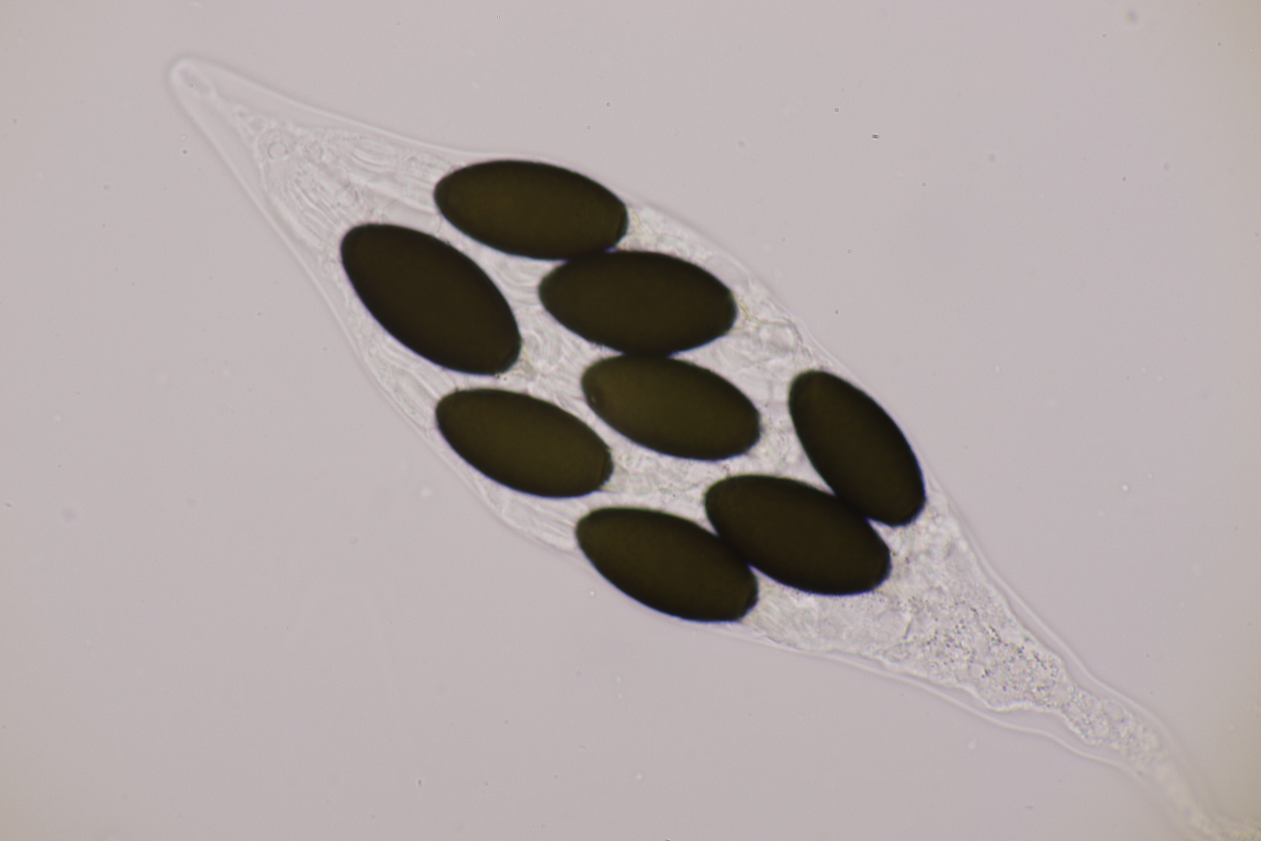 I.2 Leider nur ein Einzelexemplar: eine Podospora mit vielen Sporen im Ascus. Die Sporen messen 21-24 x 14-15 µm. Wie viele es genau waren, ließ sich leider nicht genau ermitteln, es liegt aber um die 100. Damit sind dann nur noch Podospora bifida und setosa im Rennen. Da das Pedicel um die 5 µm breit ist, geht meine Tendenz hier zu Podospora bifida.