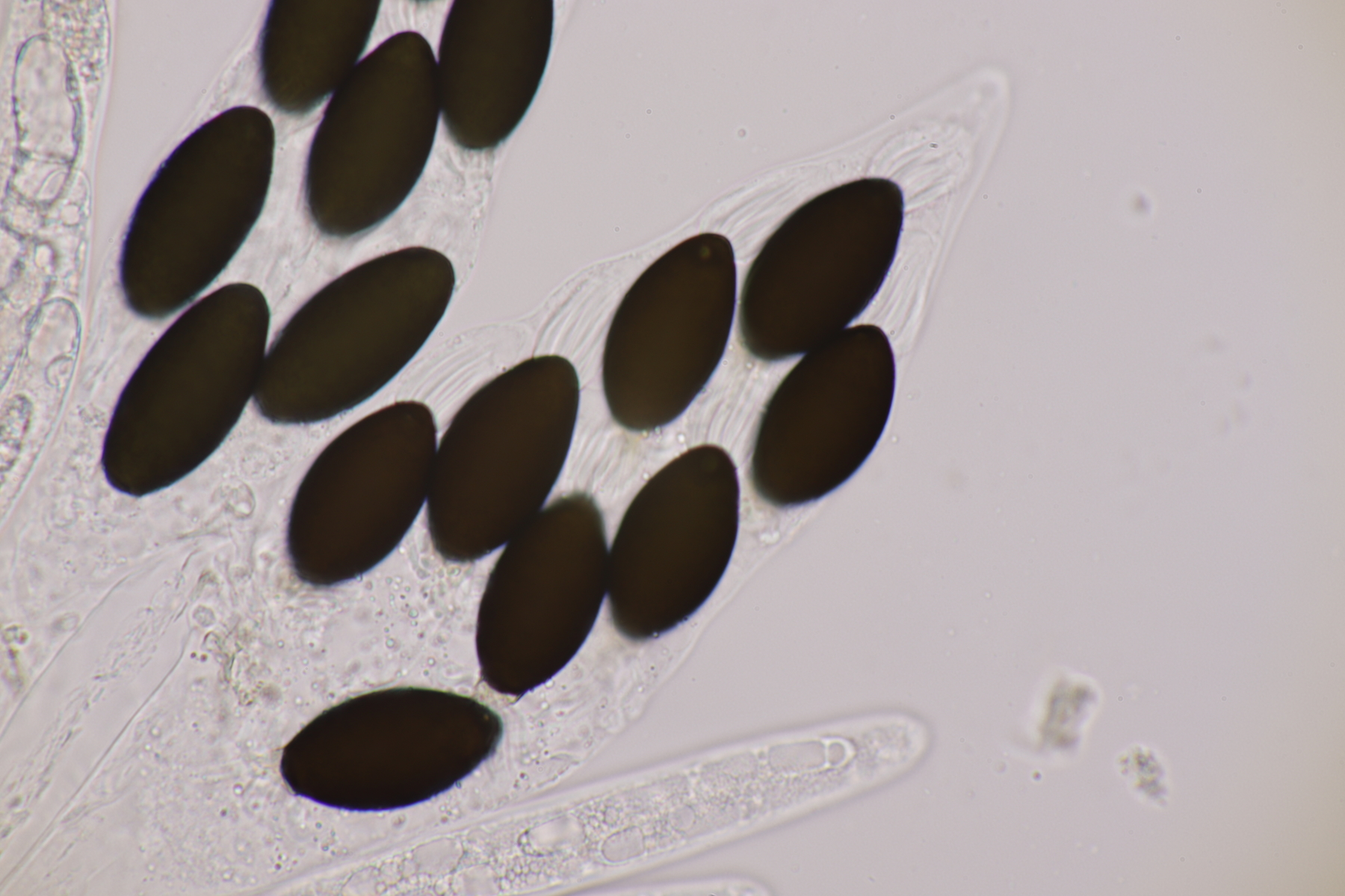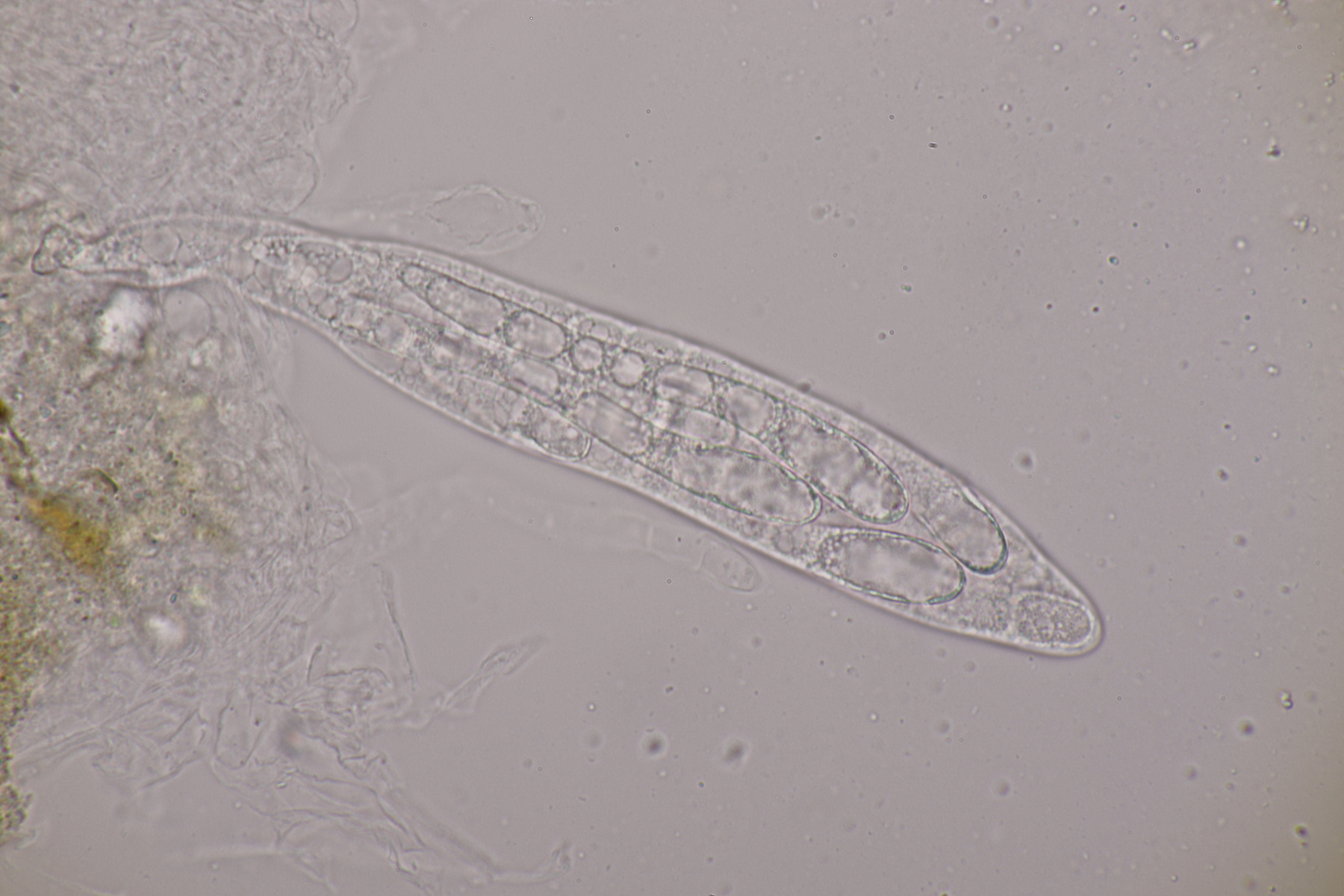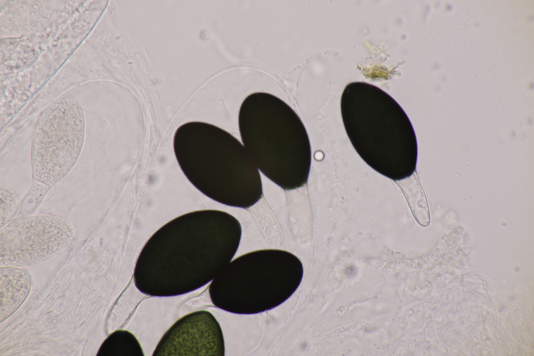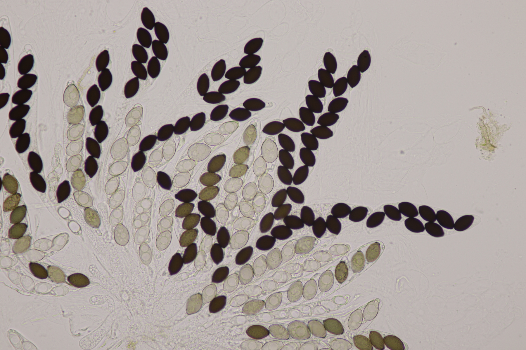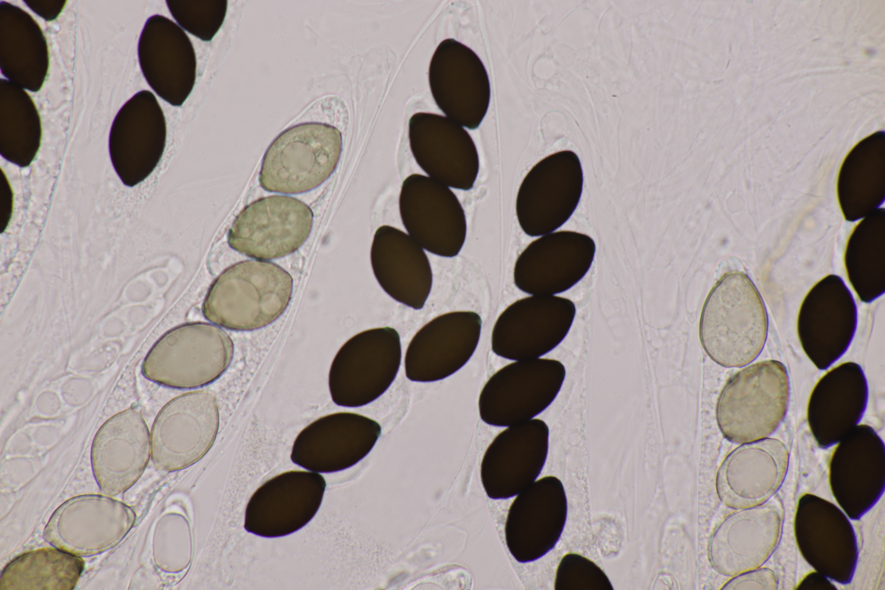 I.2 Leider nur ein Einzelexemplar: eine Podospora mit vielen Sporen im Ascus. Die Sporen messen 21-24 x 14-15 µm. Wie viele es genau waren, ließ sich leider nicht genau ermitteln, es liegt aber um die 100. Damit sind dann nur noch Podospora bifida und setosa im Rennen. Da das Pedicel um die 5 µm breit ist, geht meine Tendenz hier zu Podospora bifida.