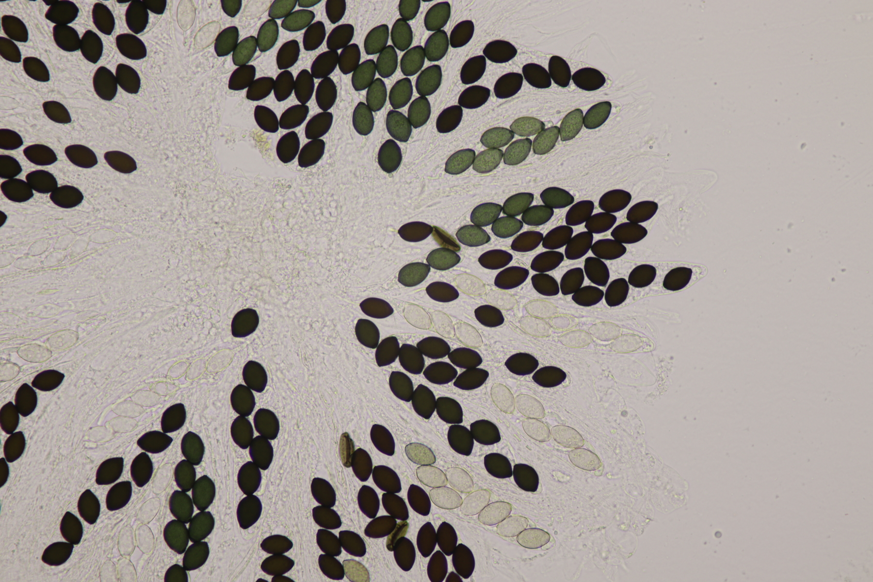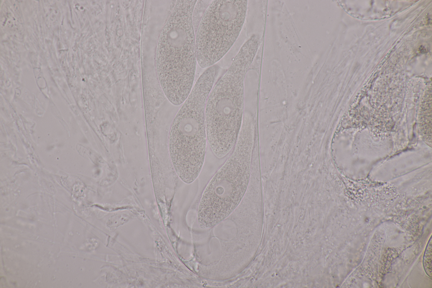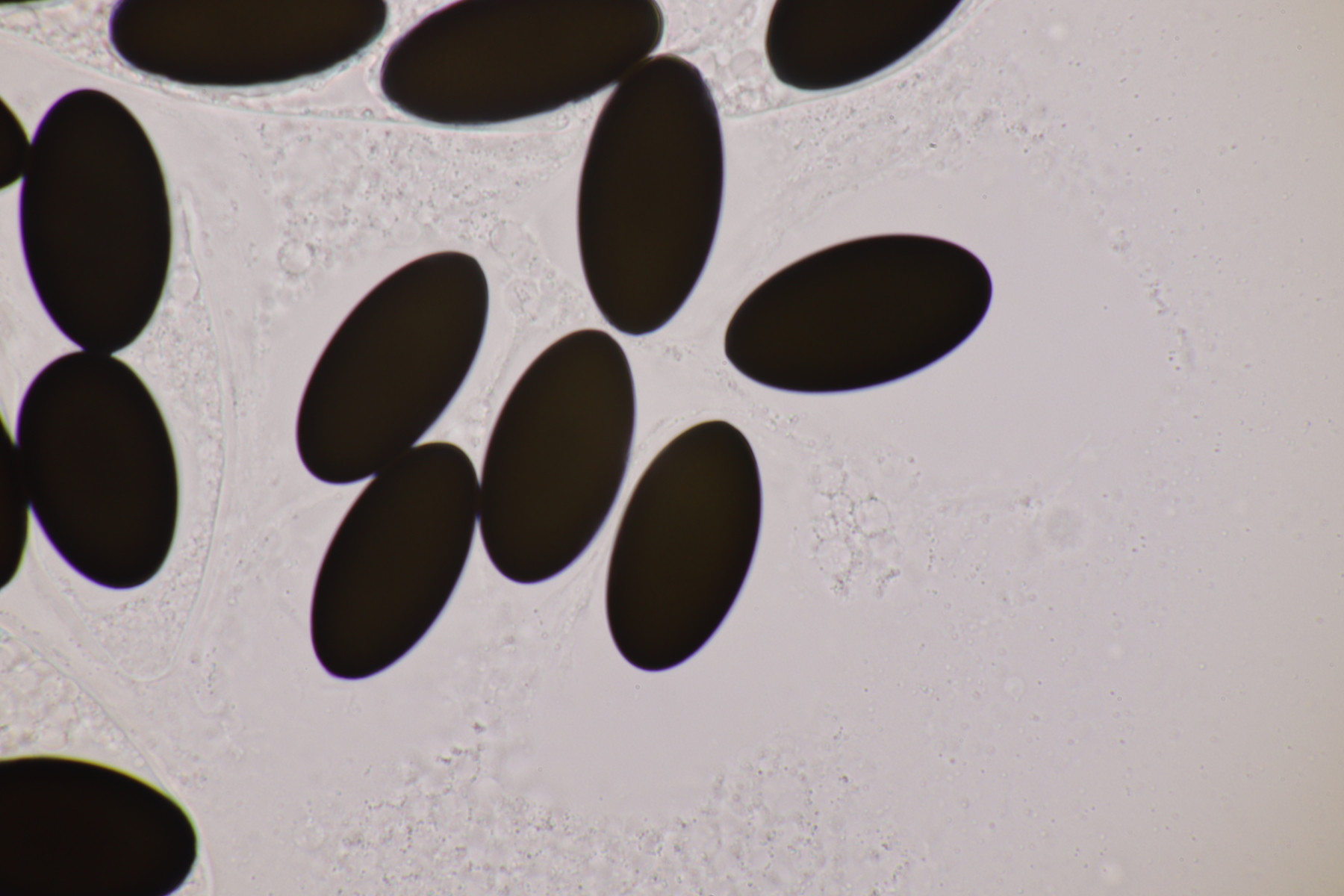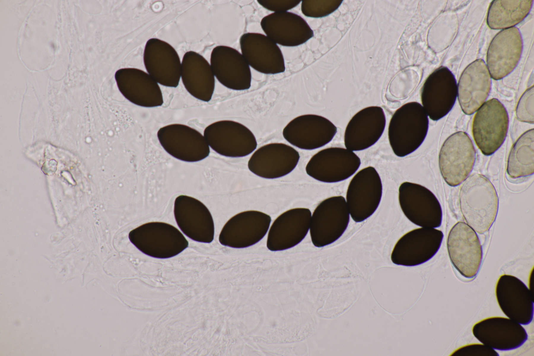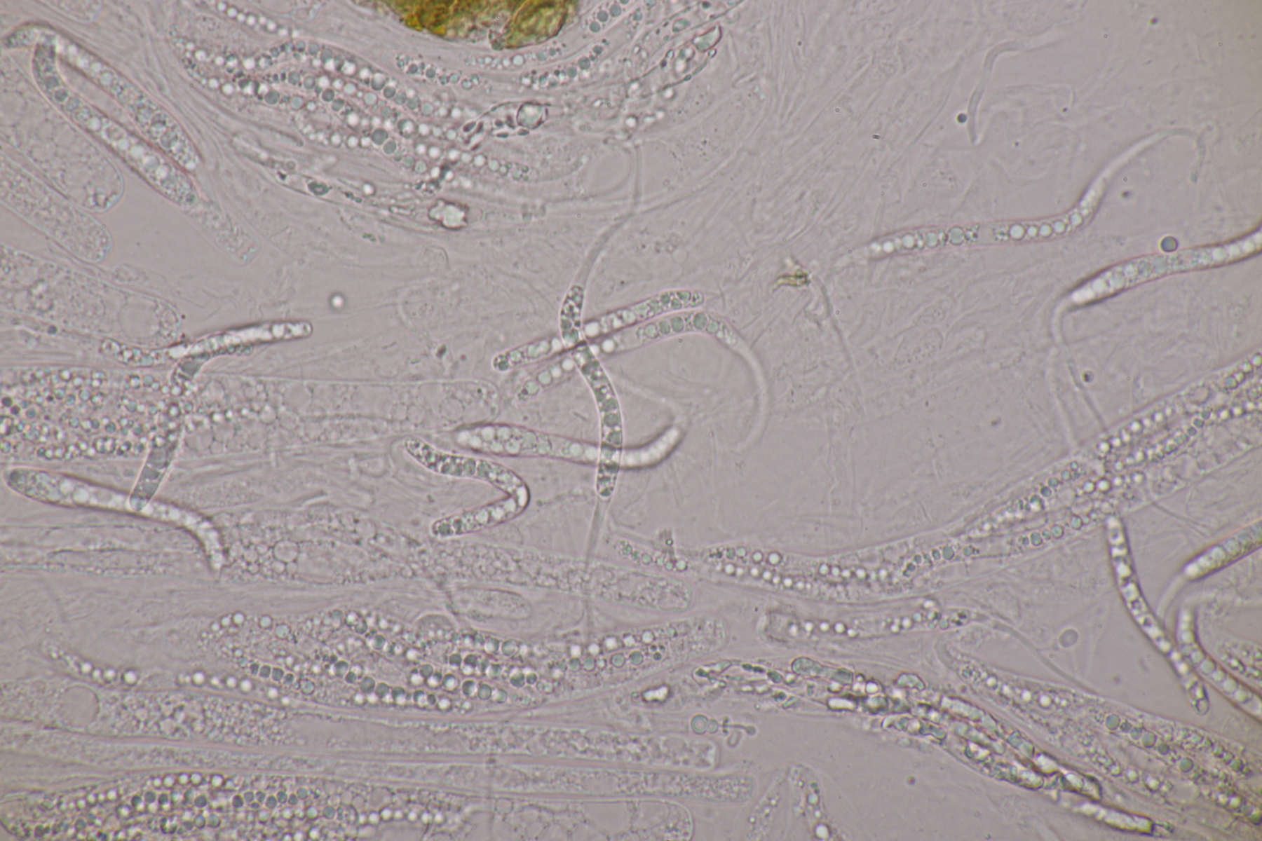 I.2 Leider nur ein Einzelexemplar: eine Podospora mit vielen Sporen im Ascus. Die Sporen messen 21-24 x 14-15 µm. Wie viele es genau waren, ließ sich leider nicht genau ermitteln, es liegt aber um die 100. Damit sind dann nur noch Podospora bifida und setosa im Rennen. Da das Pedicel um die 5 µm breit ist, geht meine Tendenz hier zu Podospora bifida.
