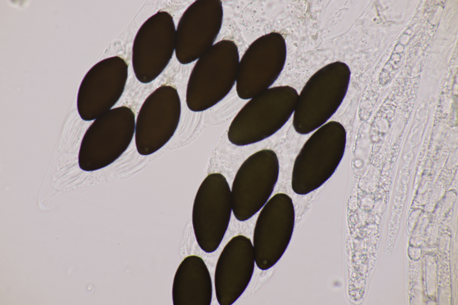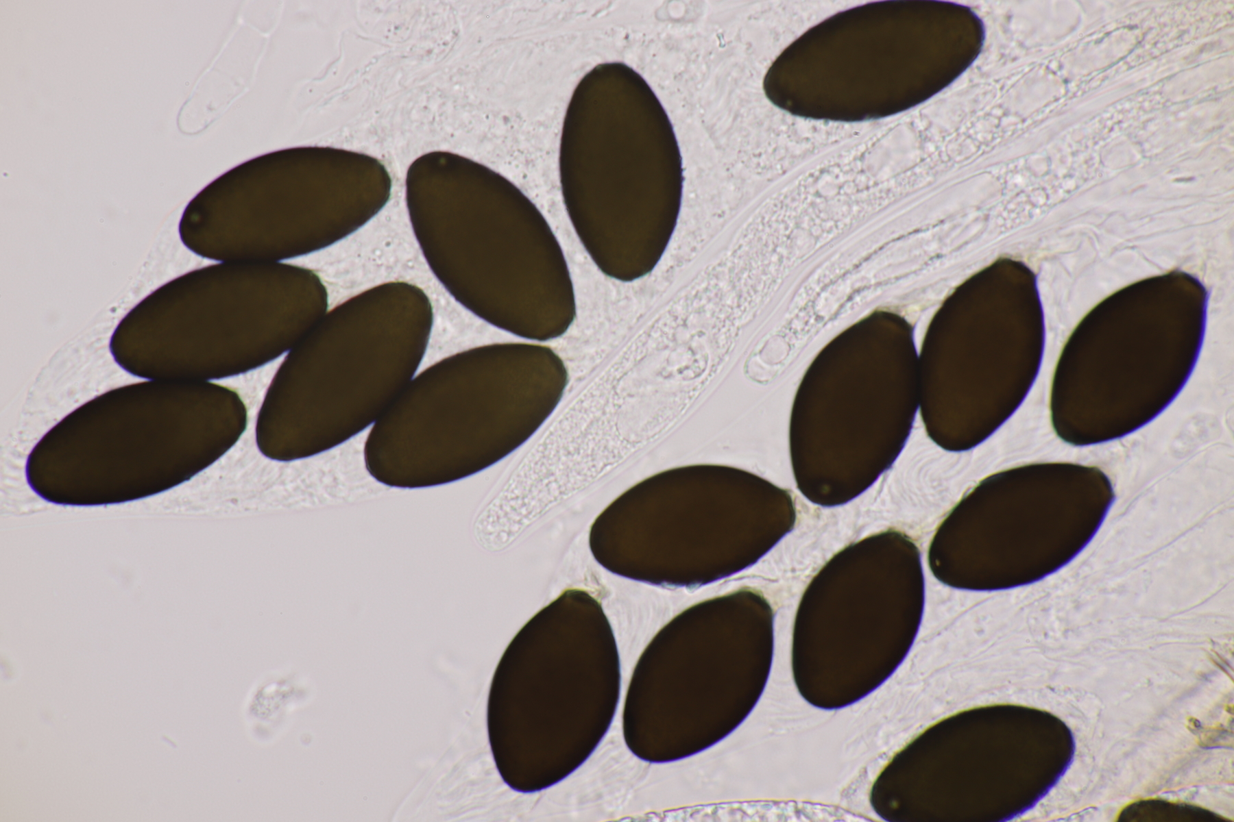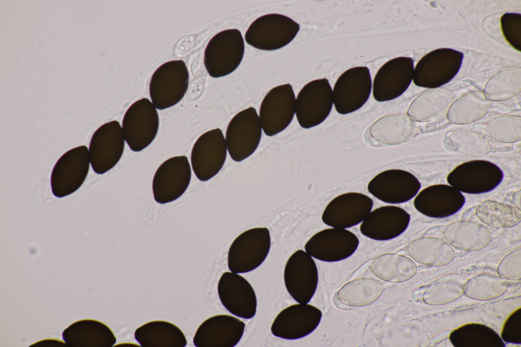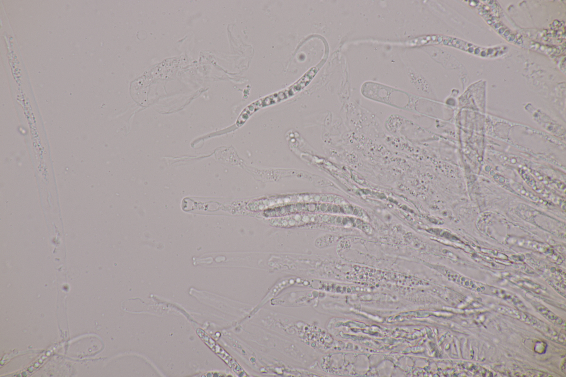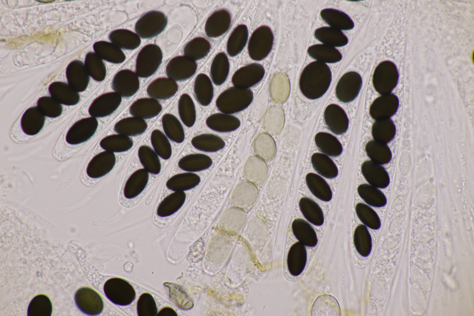 I.2 Leider nur ein Einzelexemplar: eine Podospora mit vielen Sporen im Ascus. Die Sporen messen 21-24 x 14-15 µm. Wie viele es genau waren, ließ sich leider nicht genau ermitteln, es liegt aber um die 100. Damit sind dann nur noch Podospora bifida und setosa im Rennen. Da das Pedicel um die 5 µm breit ist, geht meine Tendenz hier zu Podospora bifida.