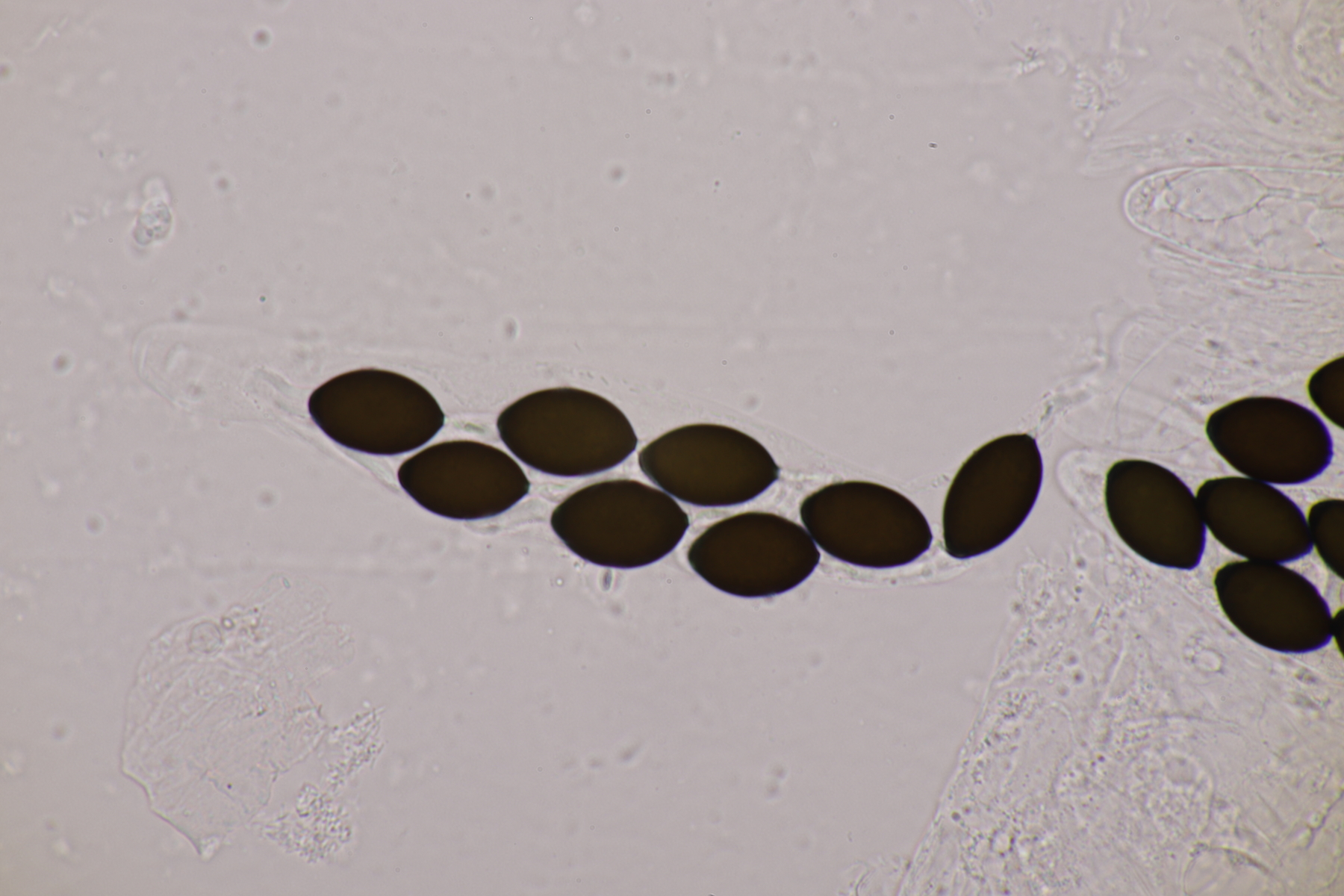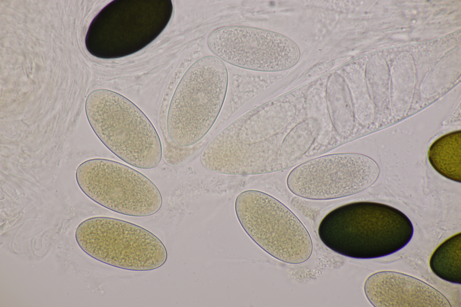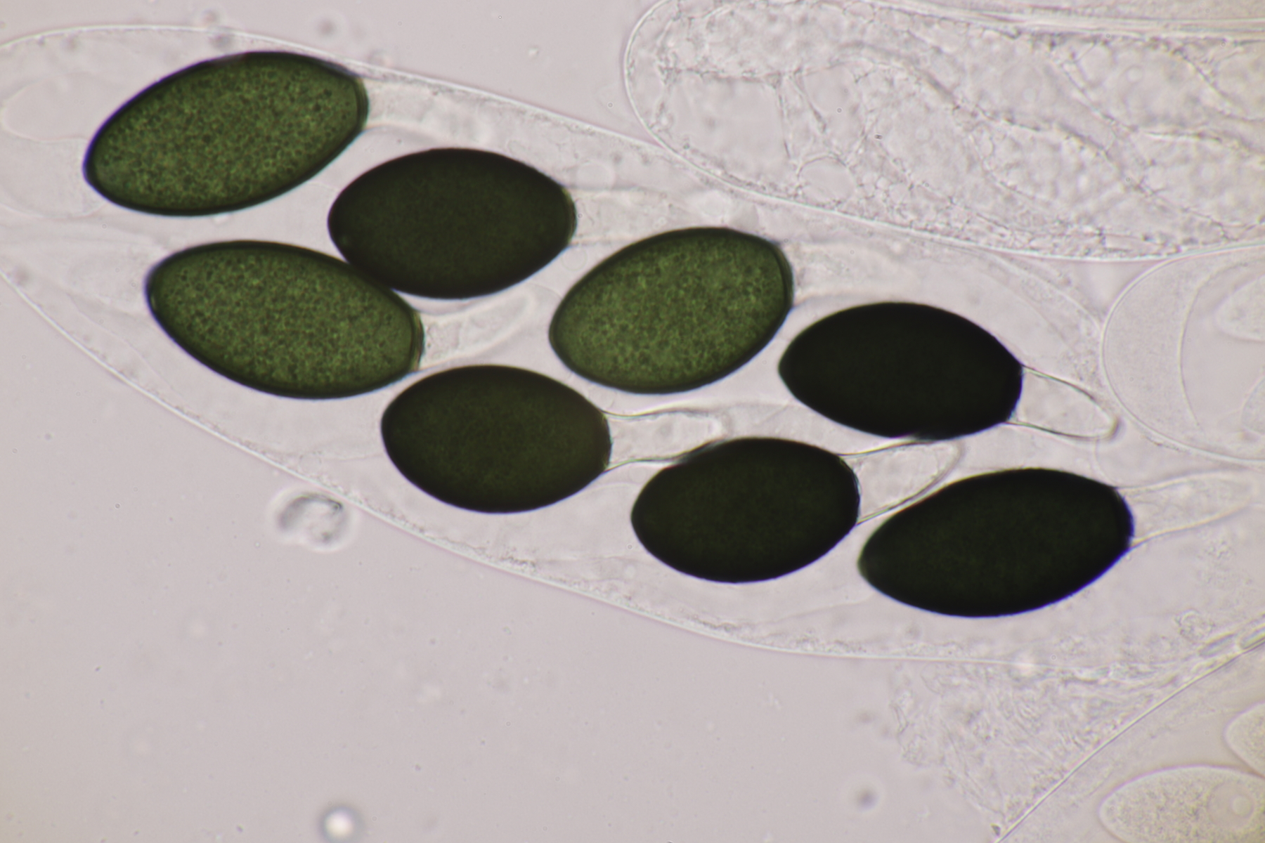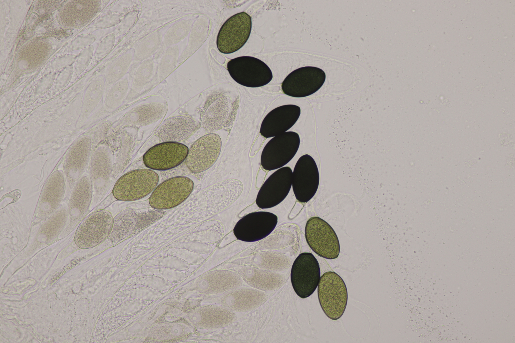 I.2 Leider nur ein Einzelexemplar: eine Podospora mit vielen Sporen im Ascus. Die Sporen messen 21-24 x 14-15 µm. Wie viele es genau waren, ließ sich leider nicht genau ermitteln, es liegt aber um die 100. Damit sind dann nur noch Podospora bifida und setosa im Rennen. Da das Pedicel um die 5 µm breit ist, geht meine Tendenz hier zu Podospora bifida.
