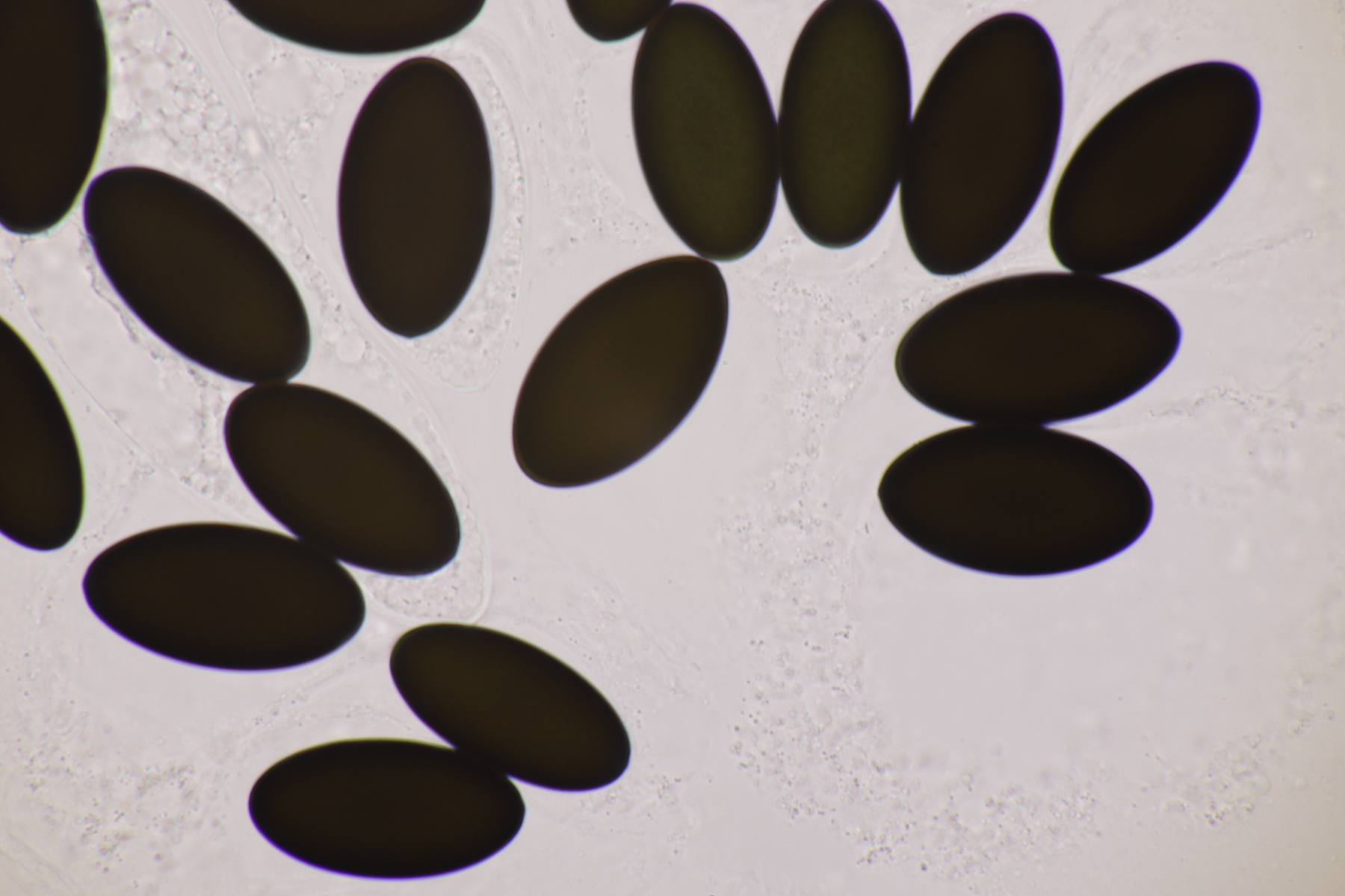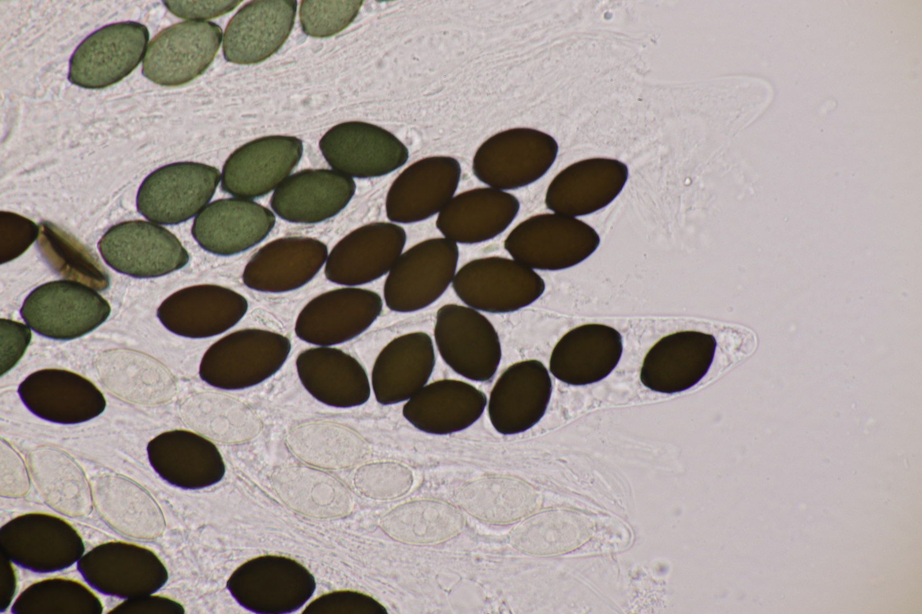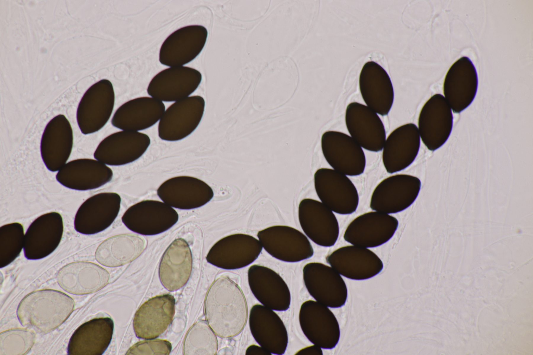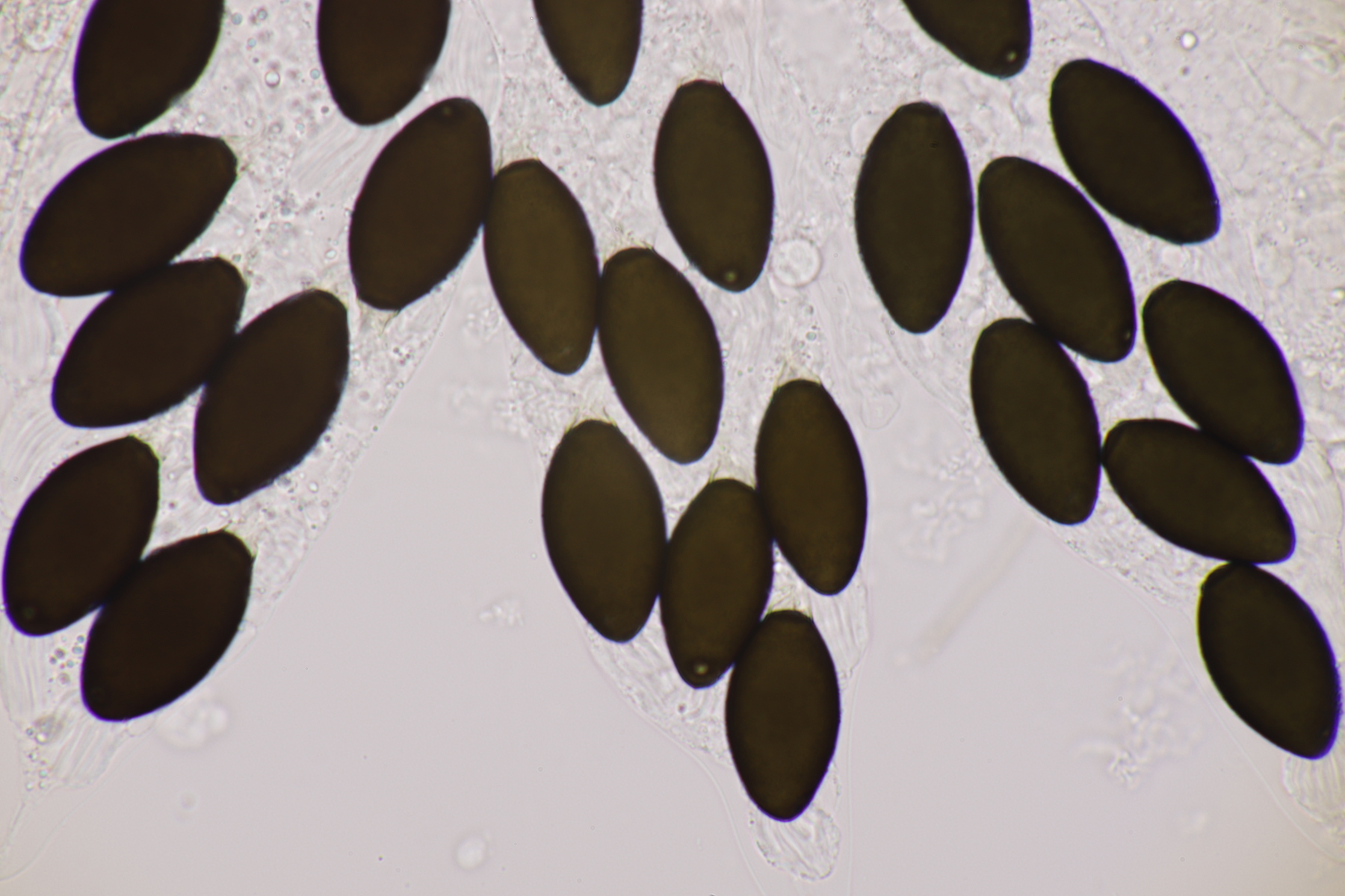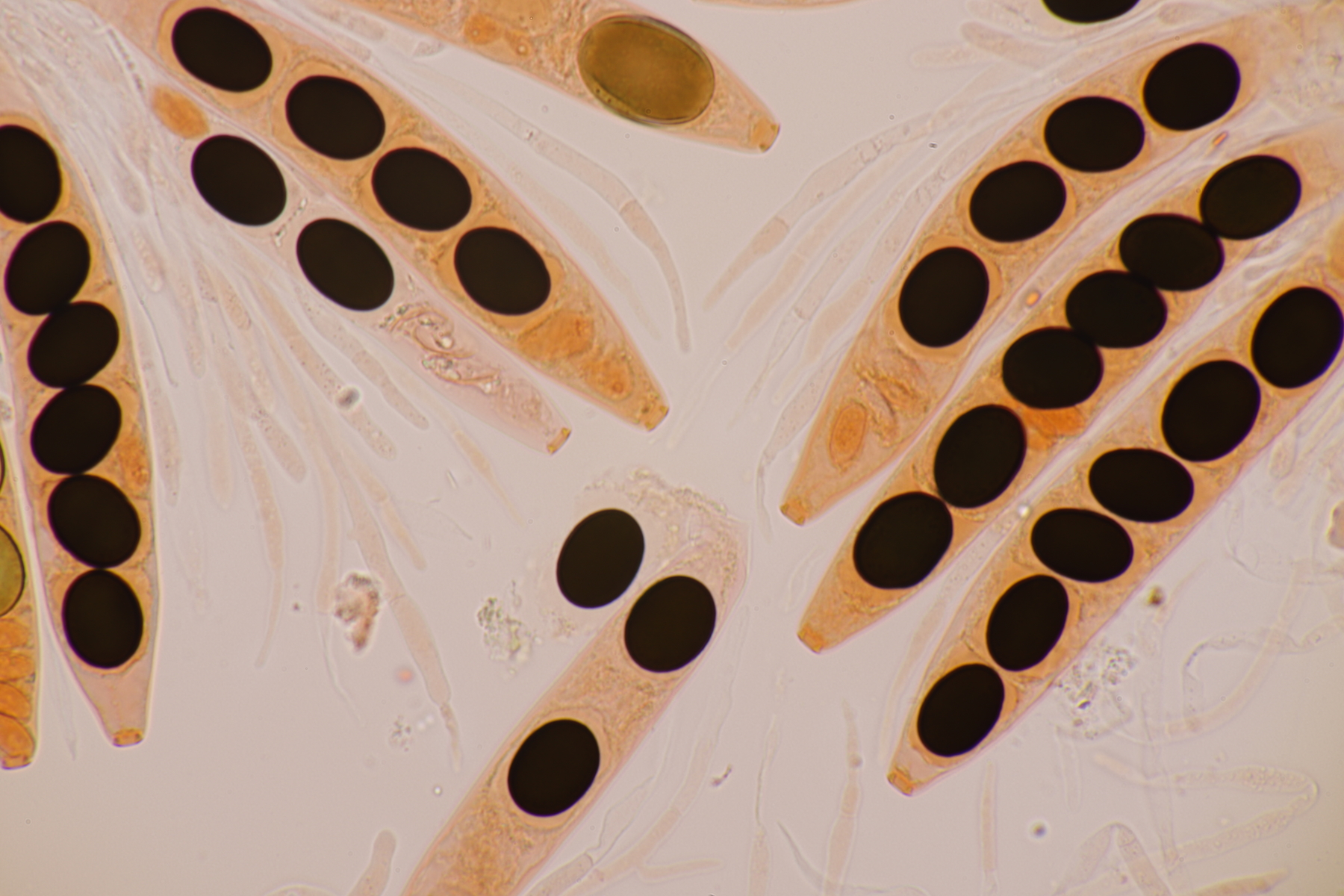 I.2 Leider nur ein Einzelexemplar: eine Podospora mit vielen Sporen im Ascus. Die Sporen messen 21-24 x 14-15 µm. Wie viele es genau waren, ließ sich leider nicht genau ermitteln, es liegt aber um die 100. Damit sind dann nur noch Podospora bifida und setosa im Rennen. Da das Pedicel um die 5 µm breit ist, geht meine Tendenz hier zu Podospora bifida.
