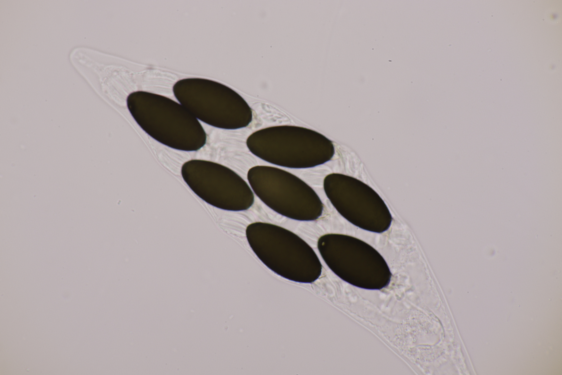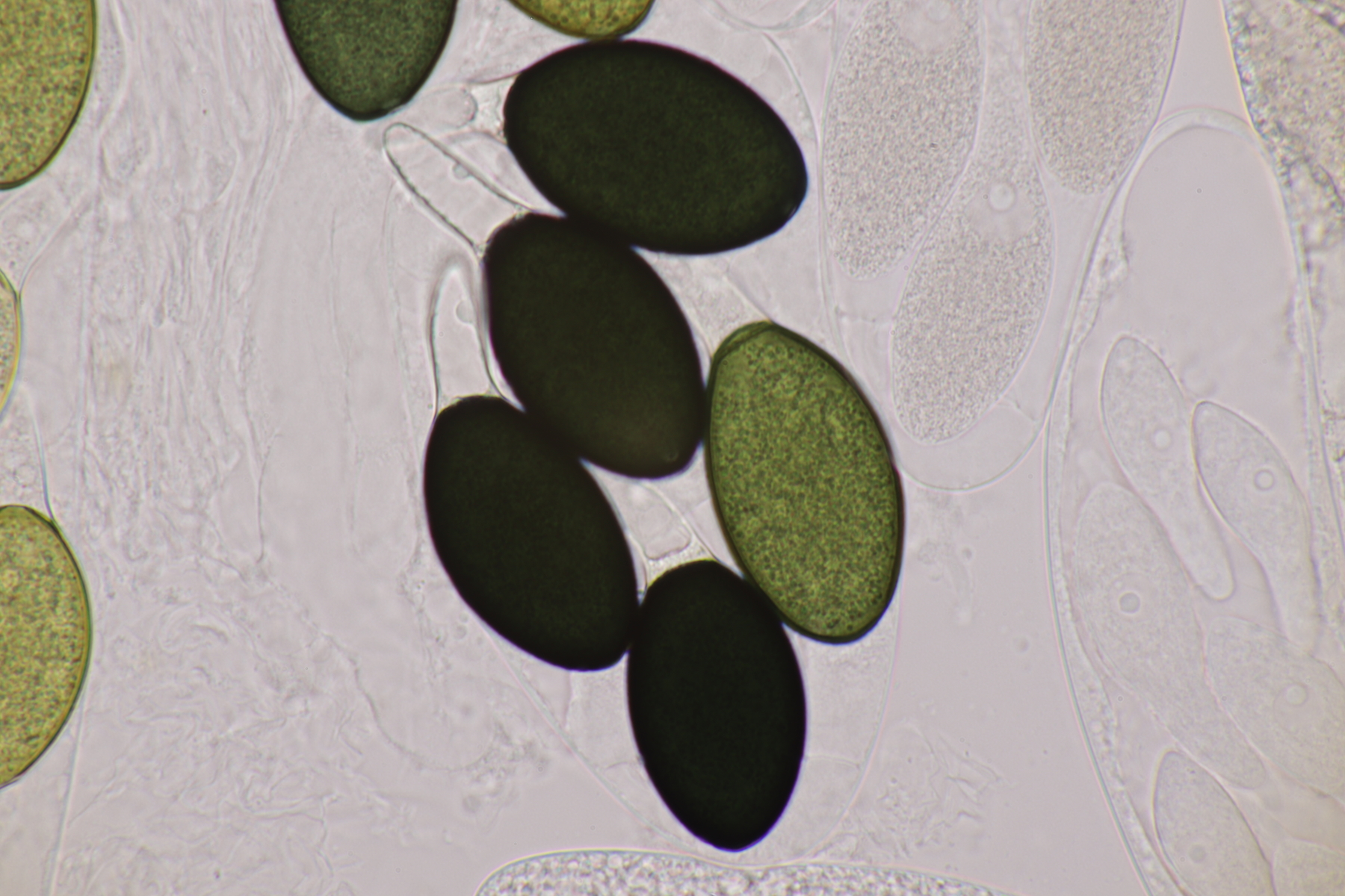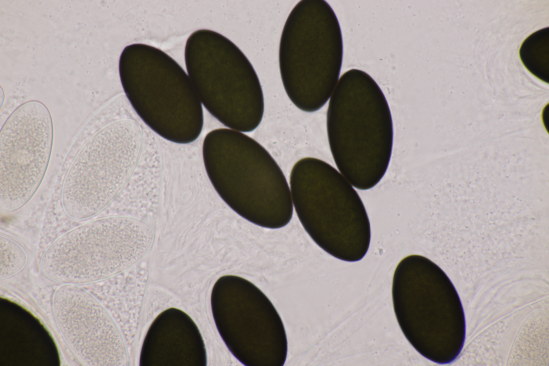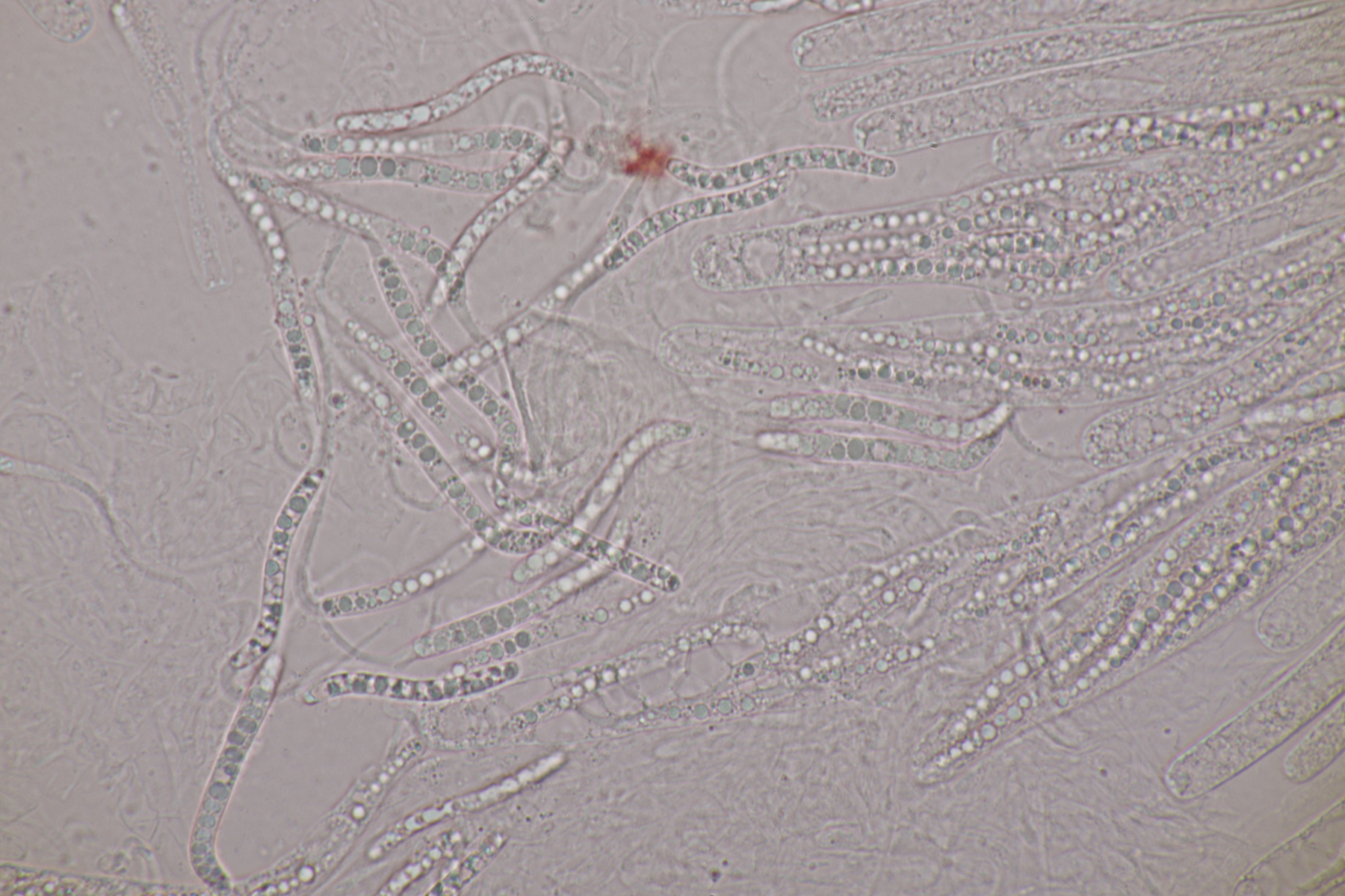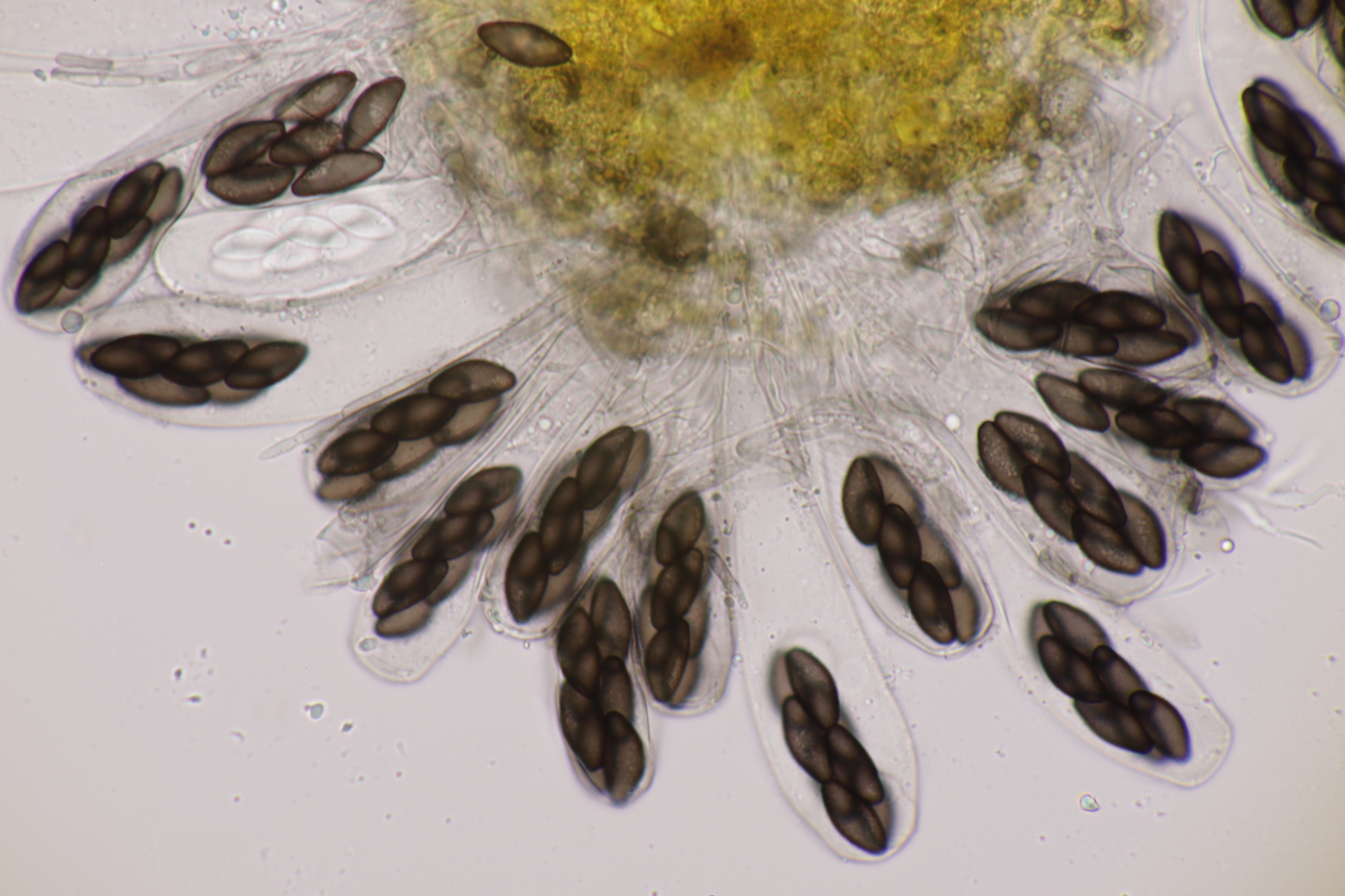 I.2 Leider nur ein Einzelexemplar: eine Podospora mit vielen Sporen im Ascus. Die Sporen messen 21-24 x 14-15 µm. Wie viele es genau waren, ließ sich leider nicht genau ermitteln, es liegt aber um die 100. Damit sind dann nur noch Podospora bifida und setosa im Rennen. Da das Pedicel um die 5 µm breit ist, geht meine Tendenz hier zu Podospora bifida.