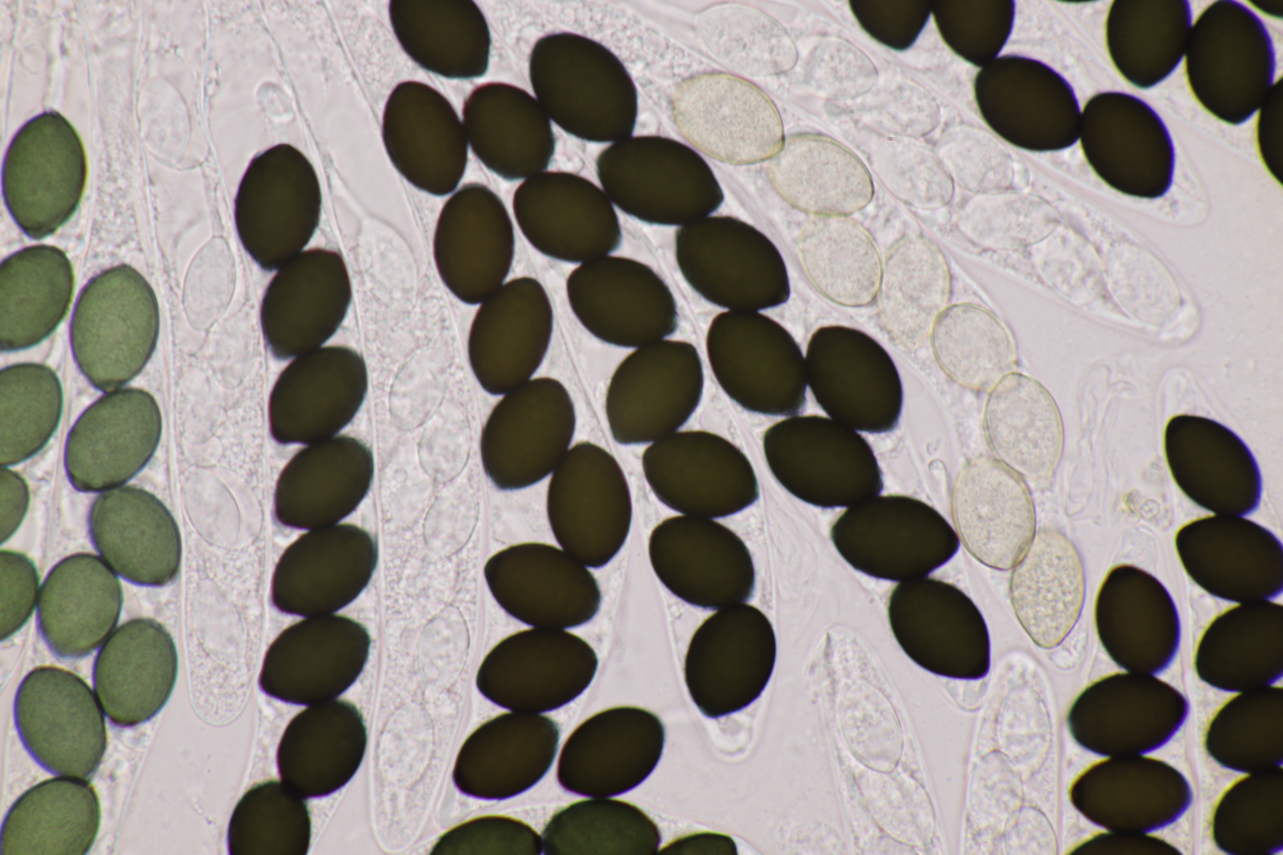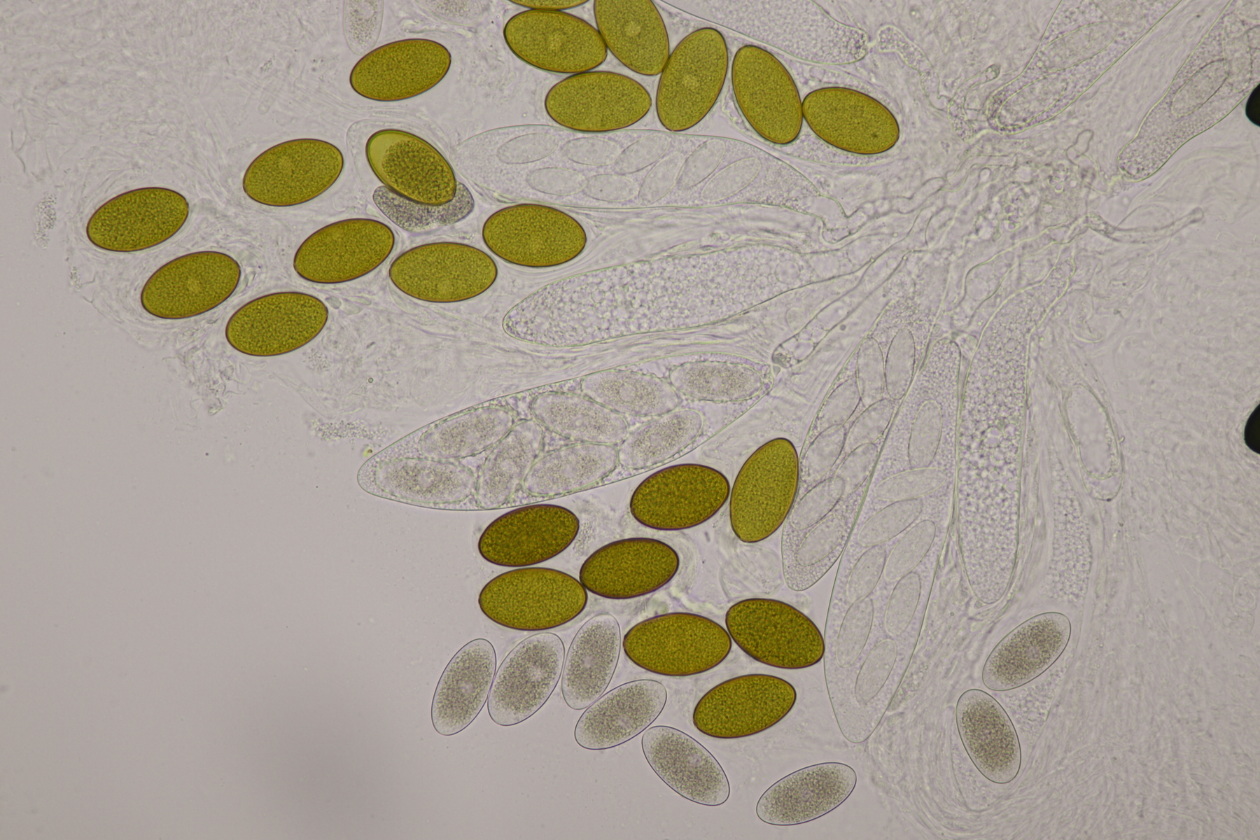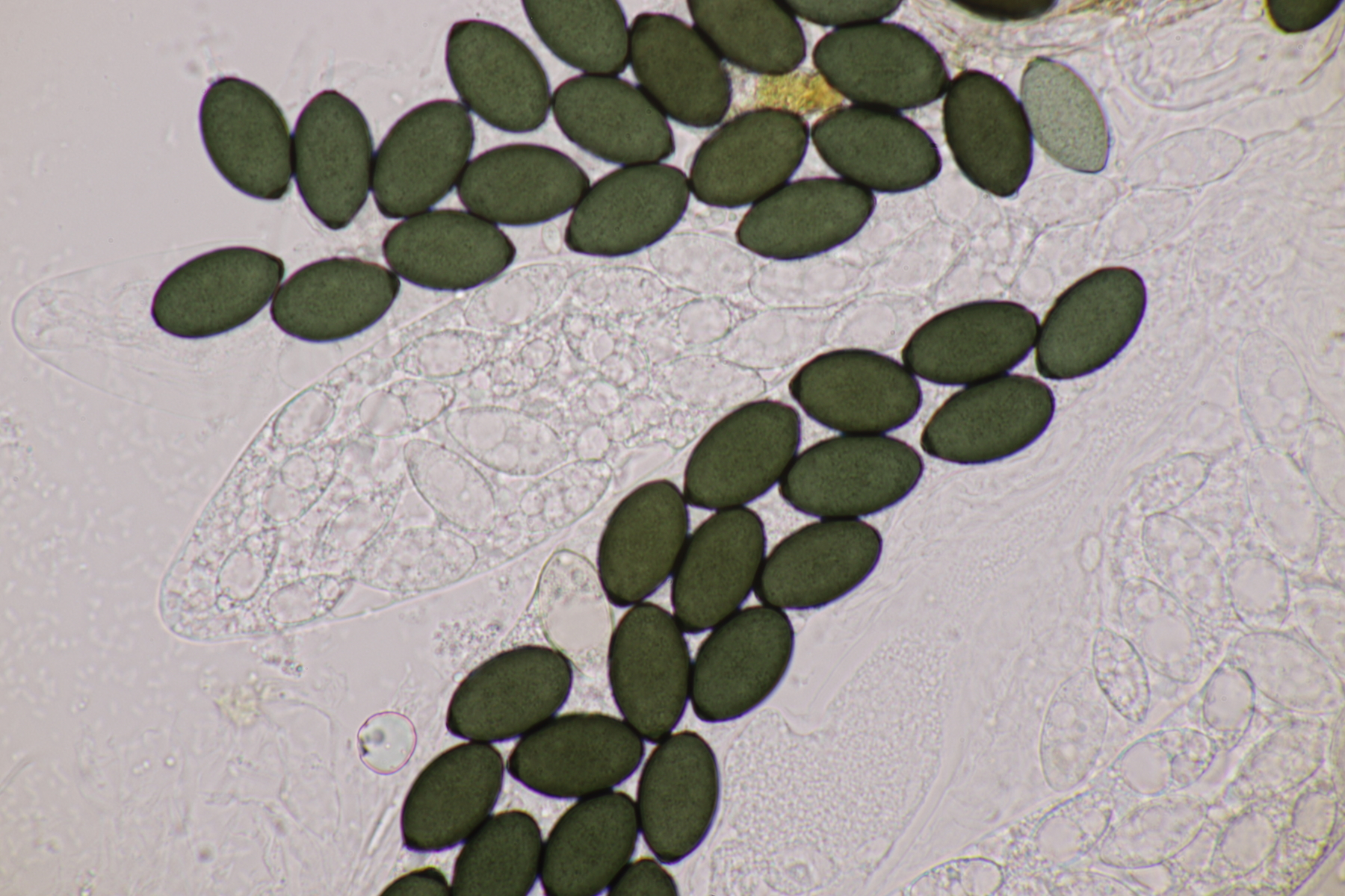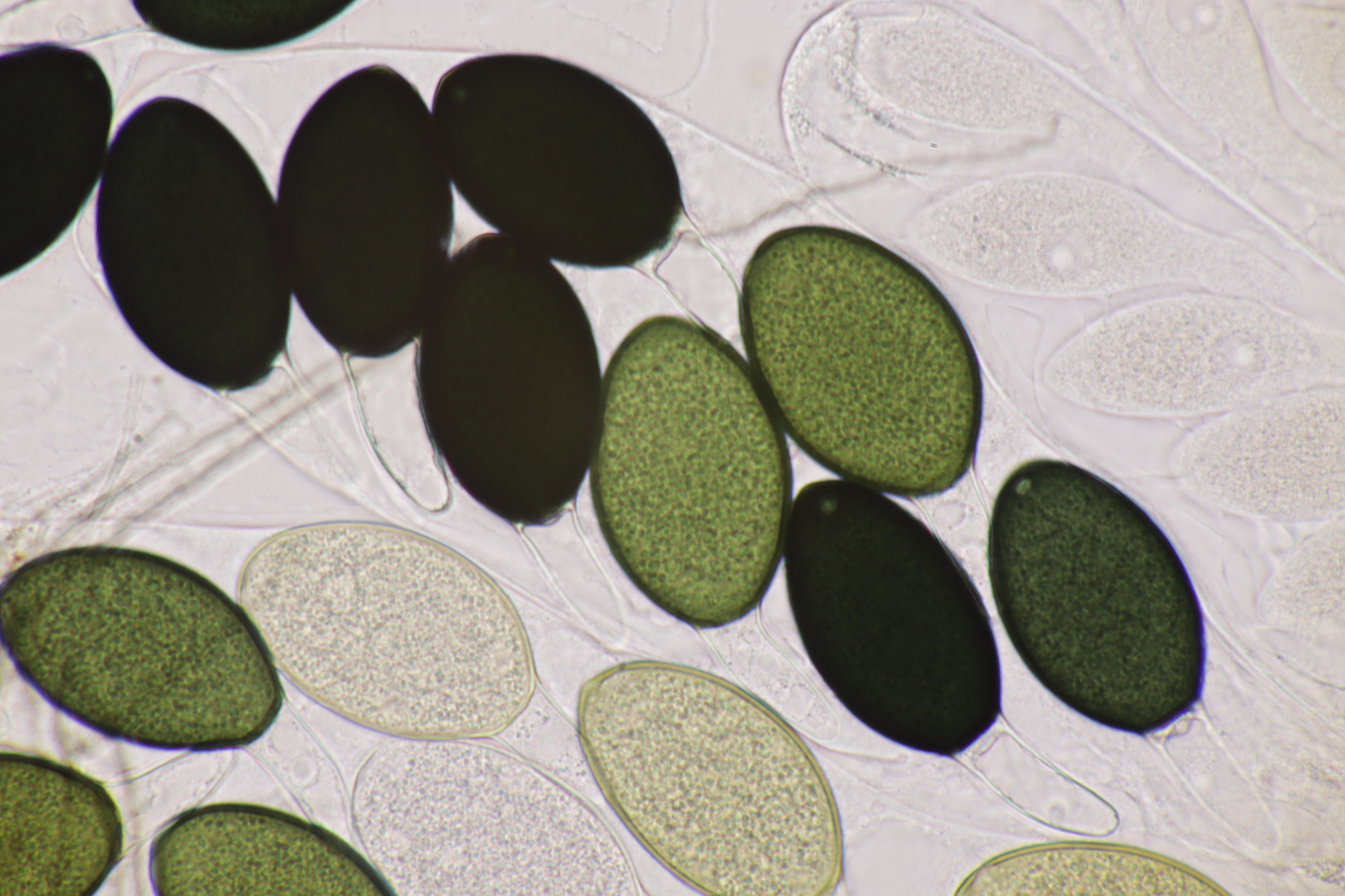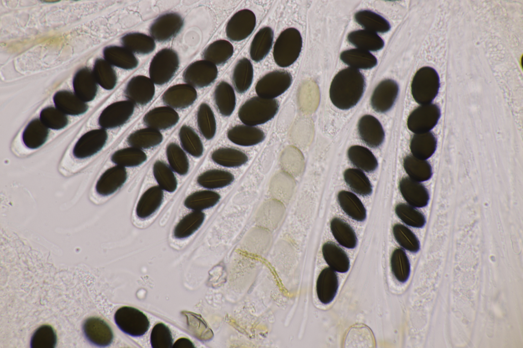 I.2 Leider nur ein Einzelexemplar: eine Podospora mit vielen Sporen im Ascus. Die Sporen messen 21-24 x 14-15 µm. Wie viele es genau waren, ließ sich leider nicht genau ermitteln, es liegt aber um die 100. Damit sind dann nur noch Podospora bifida und setosa im Rennen. Da das Pedicel um die 5 µm breit ist, geht meine Tendenz hier zu Podospora bifida.