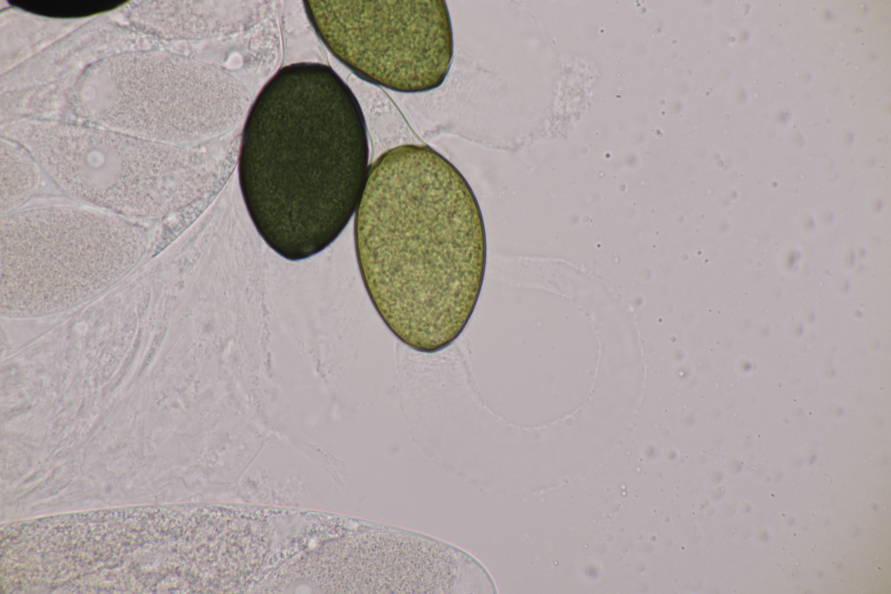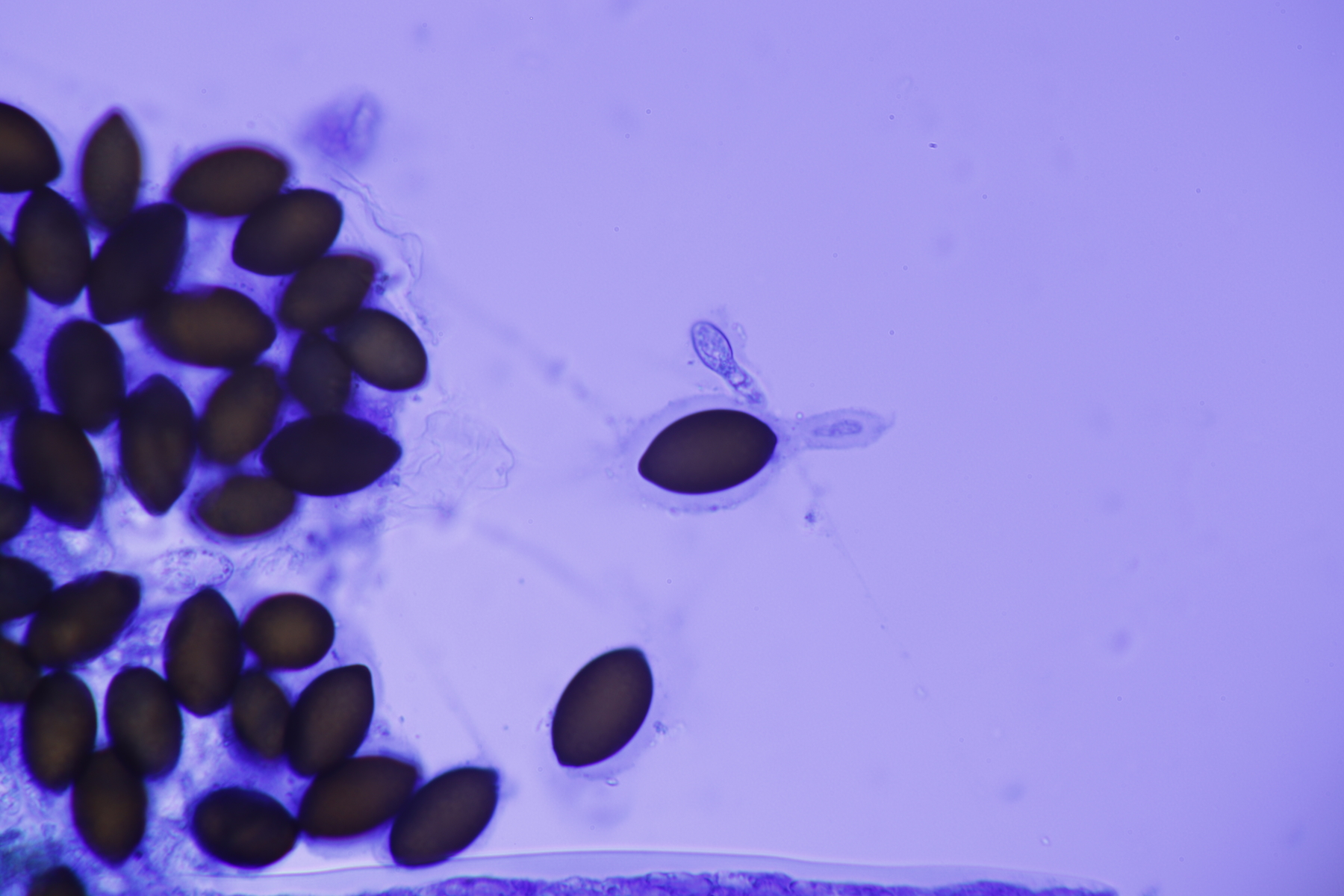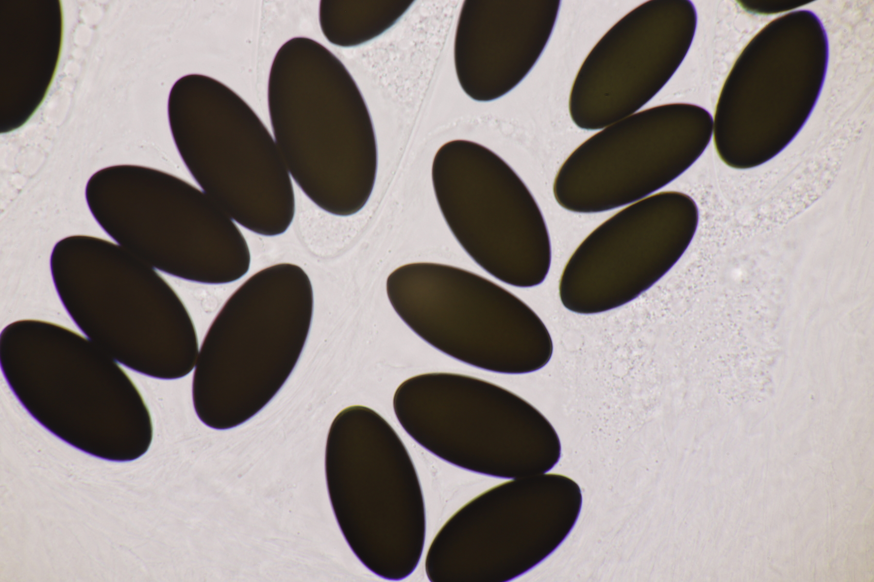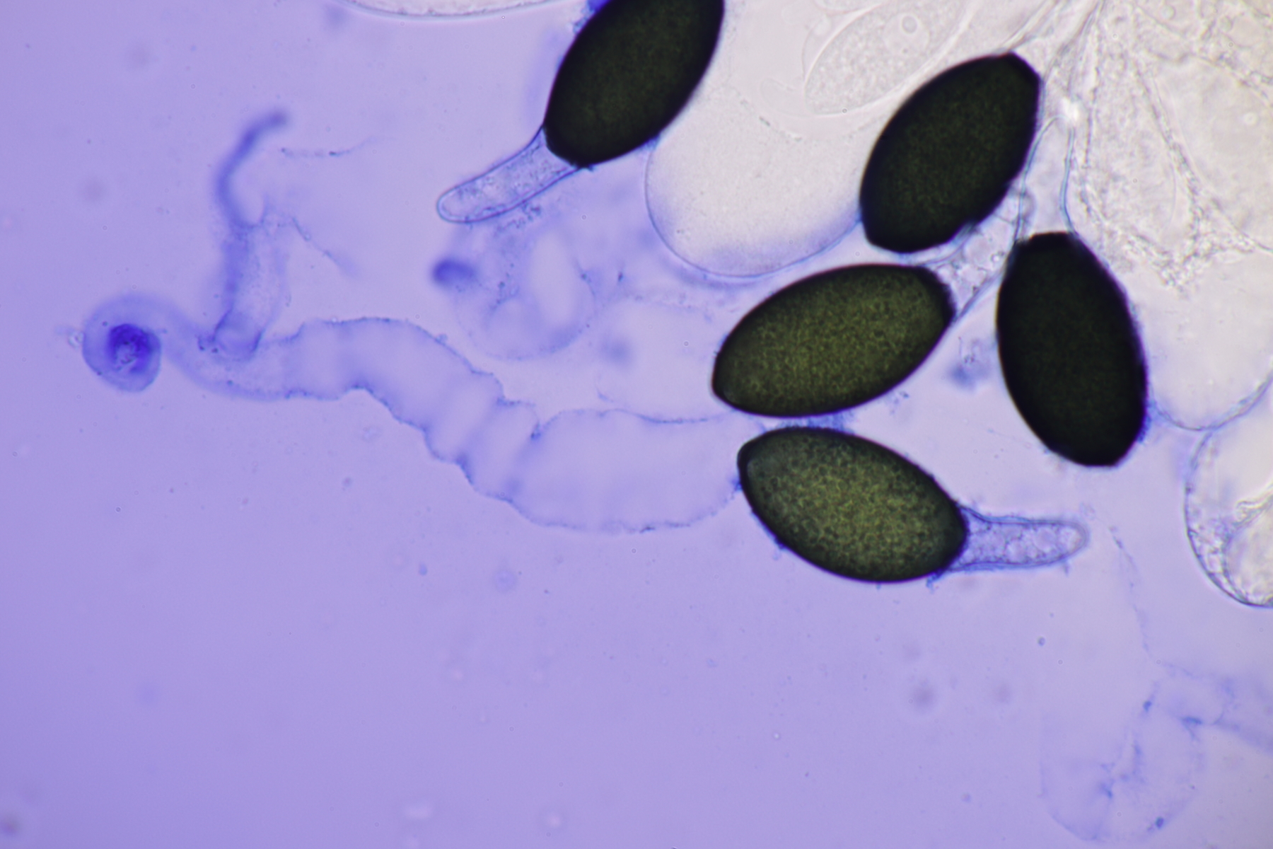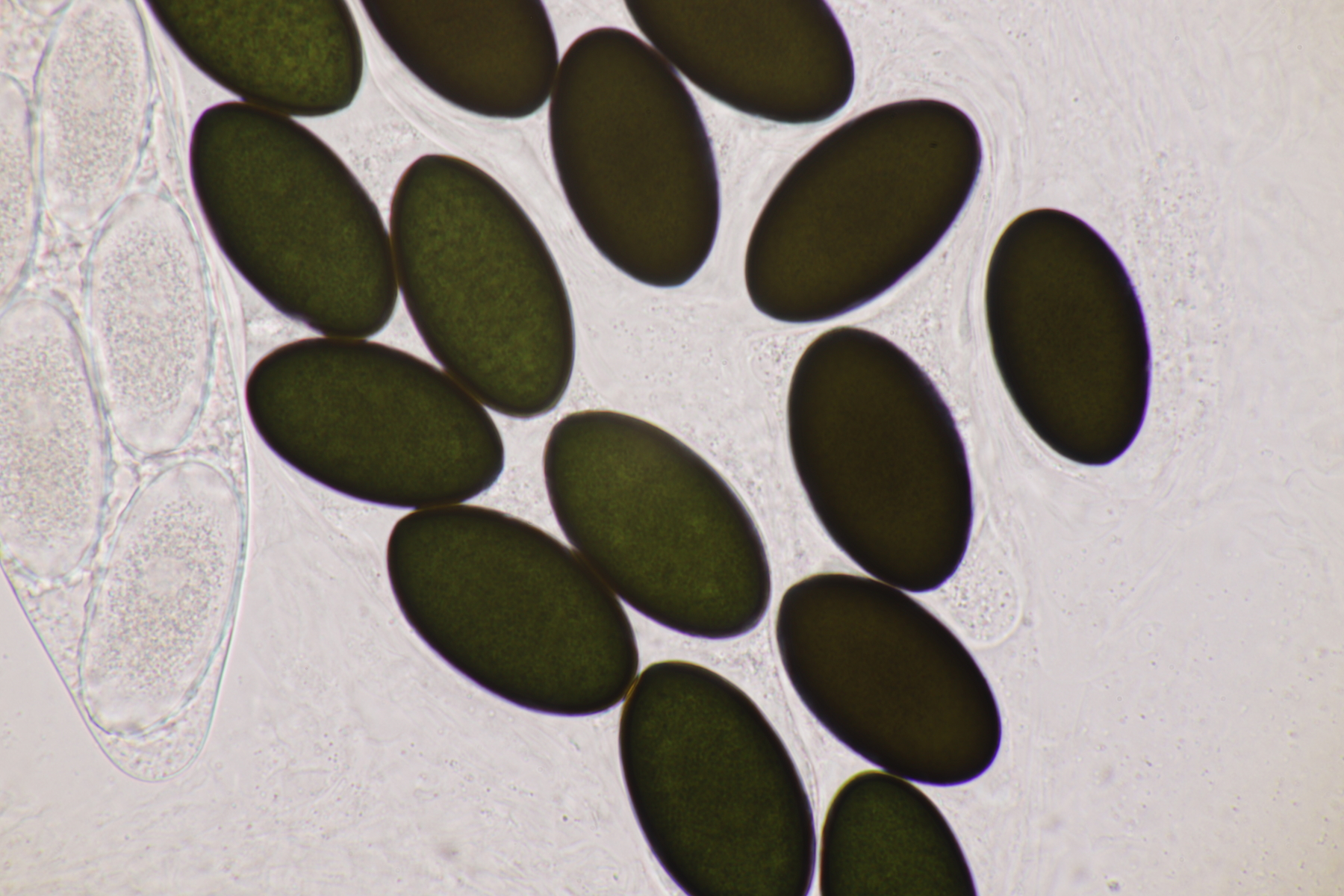 I.2 Leider nur ein Einzelexemplar: eine Podospora mit vielen Sporen im Ascus. Die Sporen messen 21-24 x 14-15 µm. Wie viele es genau waren, ließ sich leider nicht genau ermitteln, es liegt aber um die 100. Damit sind dann nur noch Podospora bifida und setosa im Rennen. Da das Pedicel um die 5 µm breit ist, geht meine Tendenz hier zu Podospora bifida.