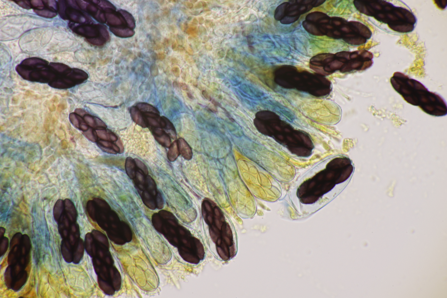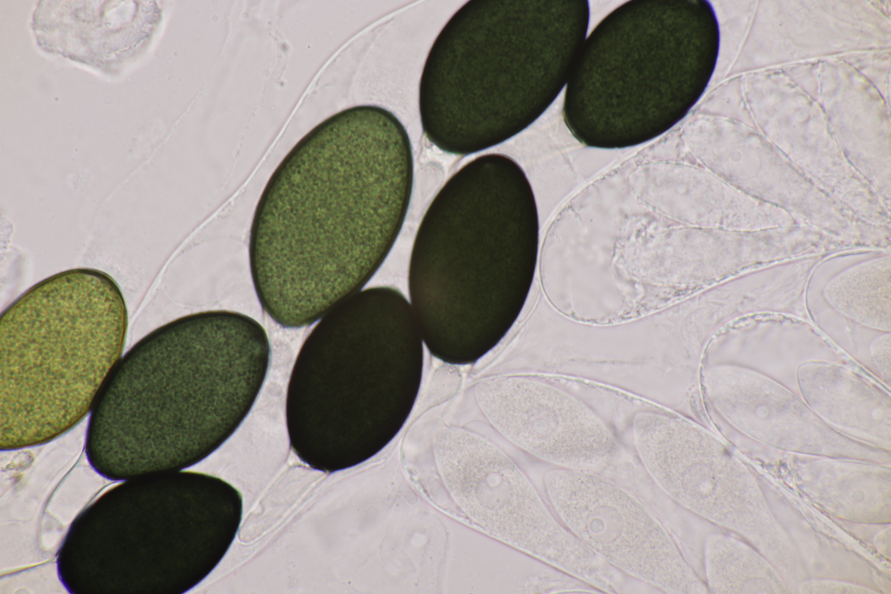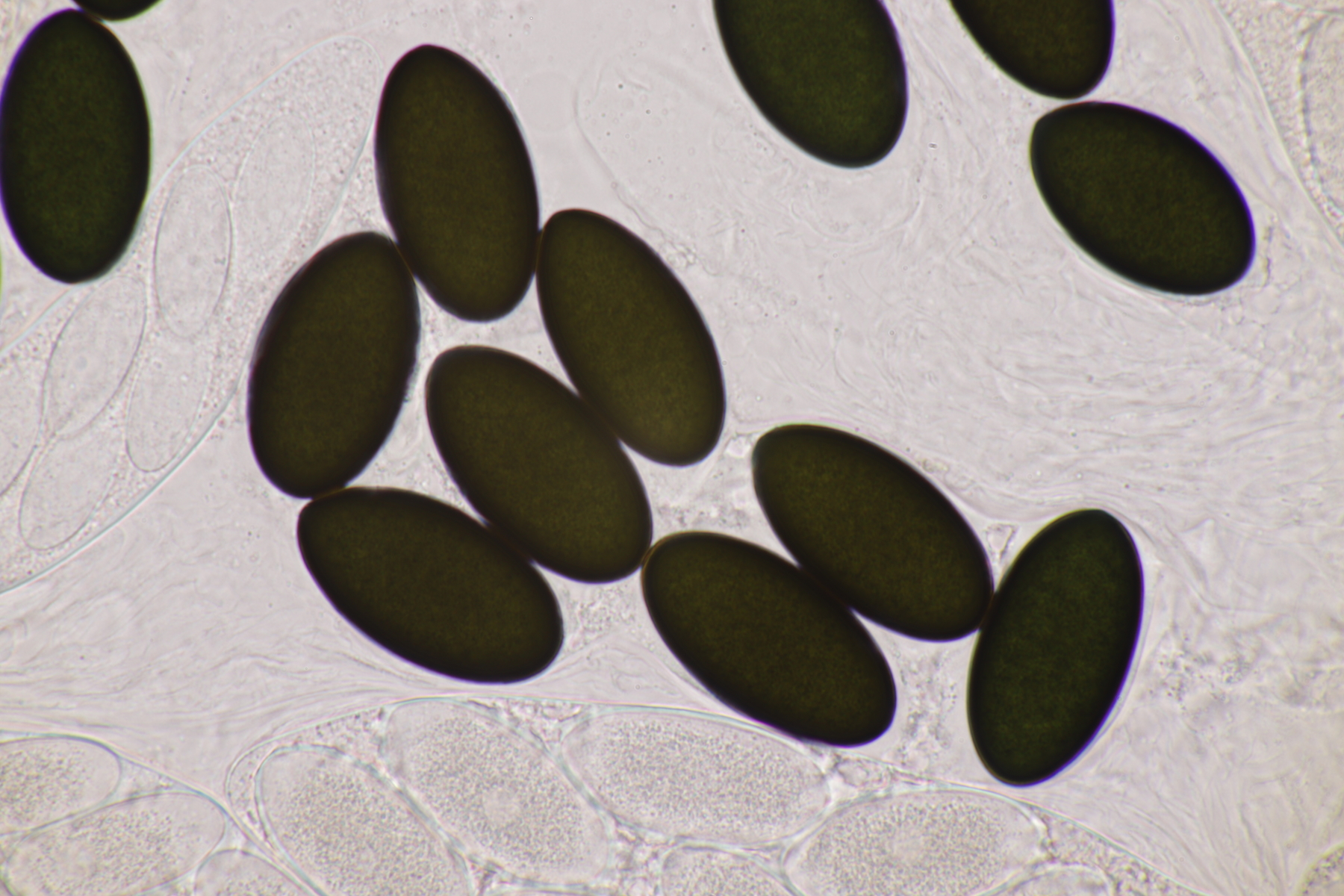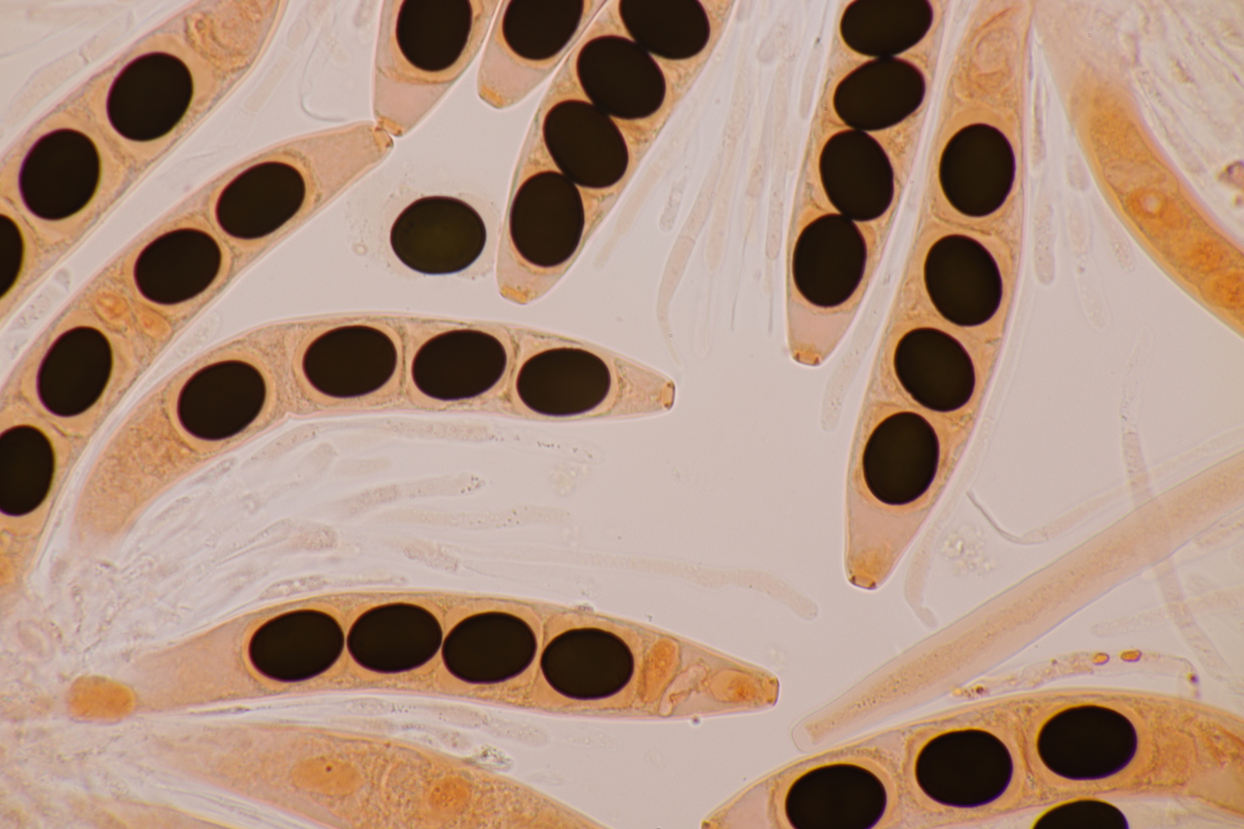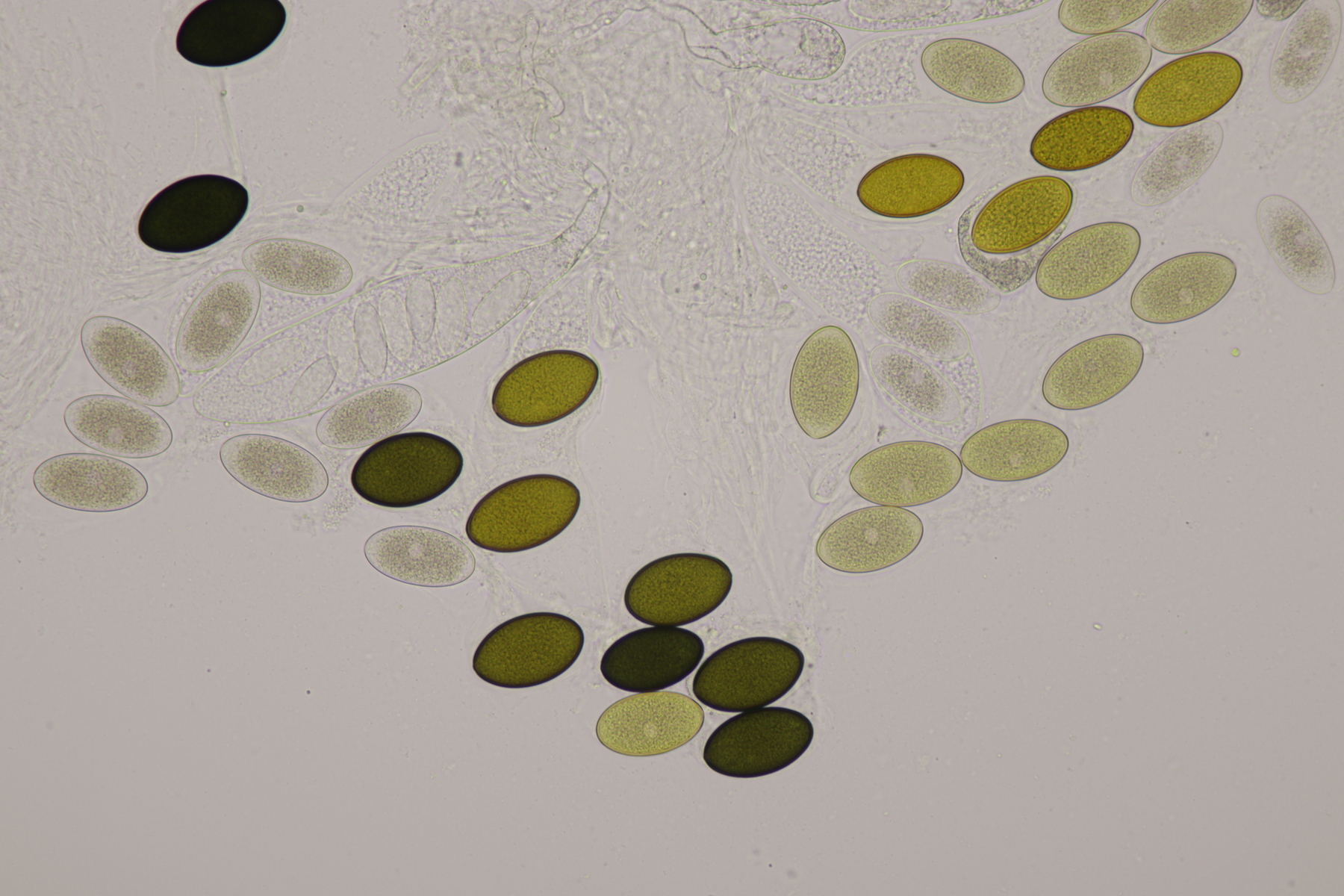 I.2 Leider nur ein Einzelexemplar: eine Podospora mit vielen Sporen im Ascus. Die Sporen messen 21-24 x 14-15 µm. Wie viele es genau waren, ließ sich leider nicht genau ermitteln, es liegt aber um die 100. Damit sind dann nur noch Podospora bifida und setosa im Rennen. Da das Pedicel um die 5 µm breit ist, geht meine Tendenz hier zu Podospora bifida.