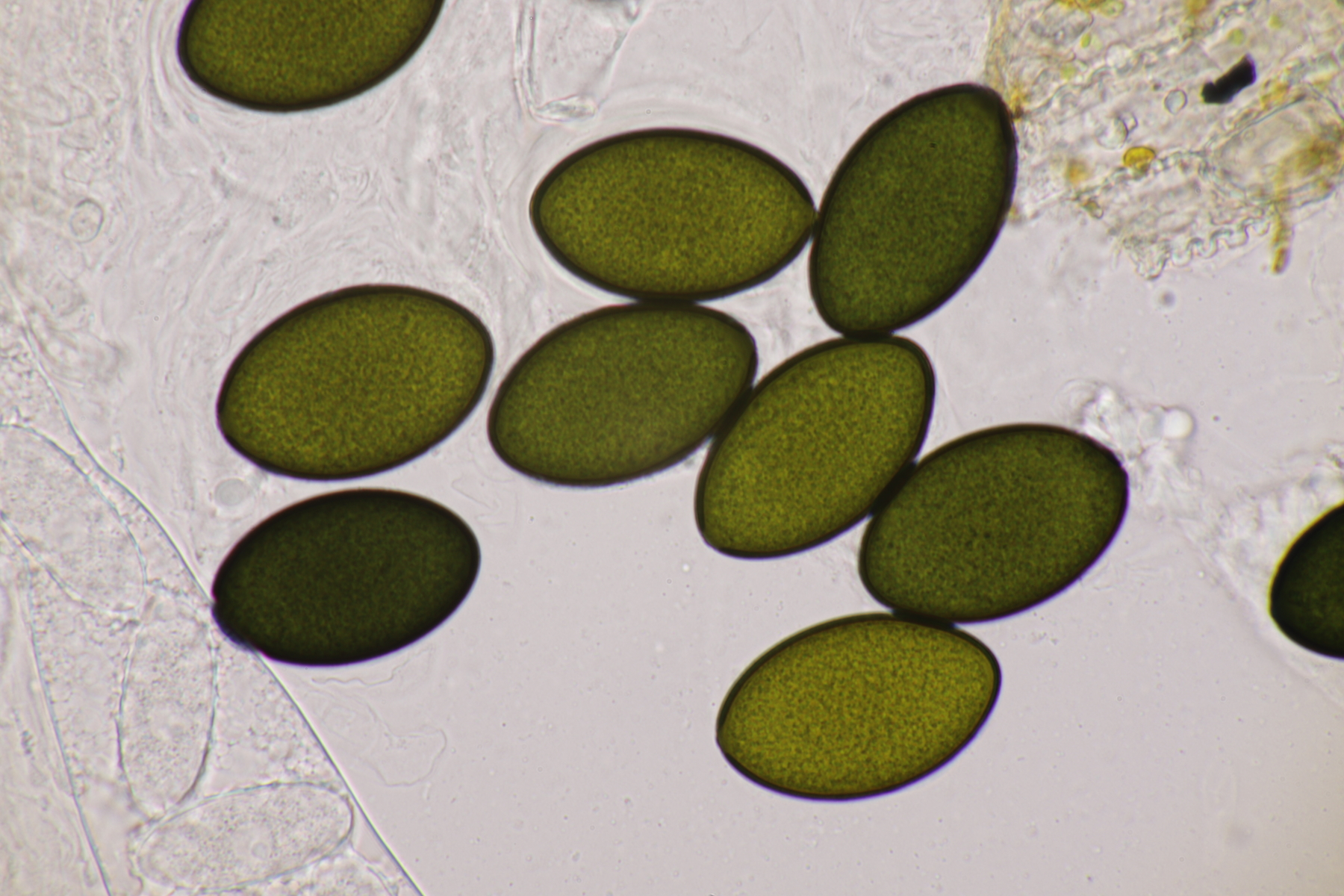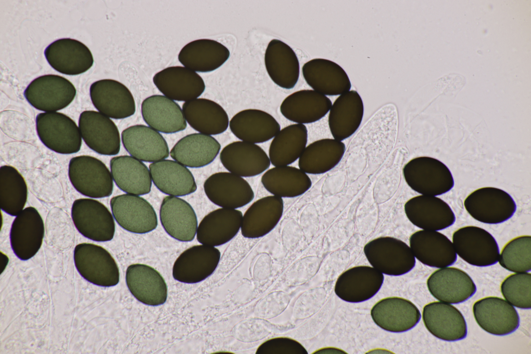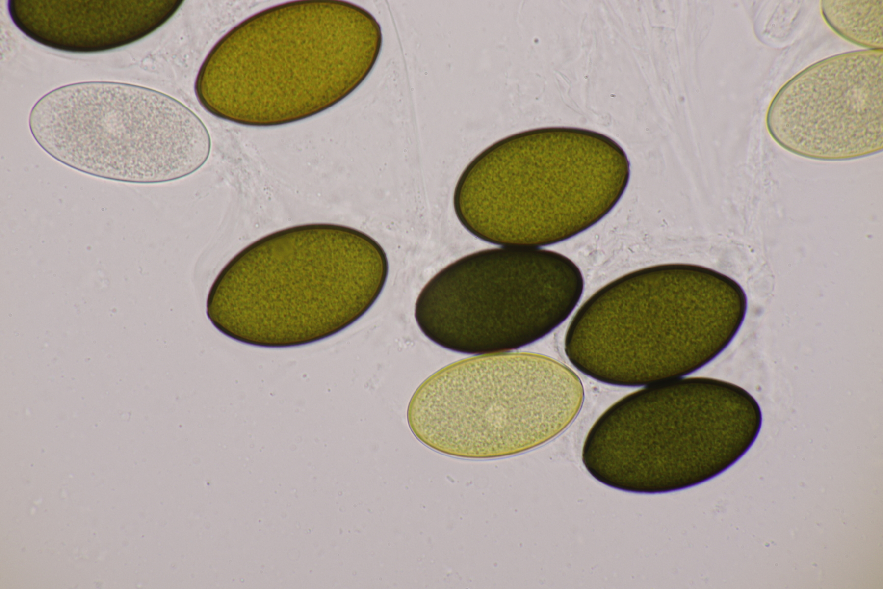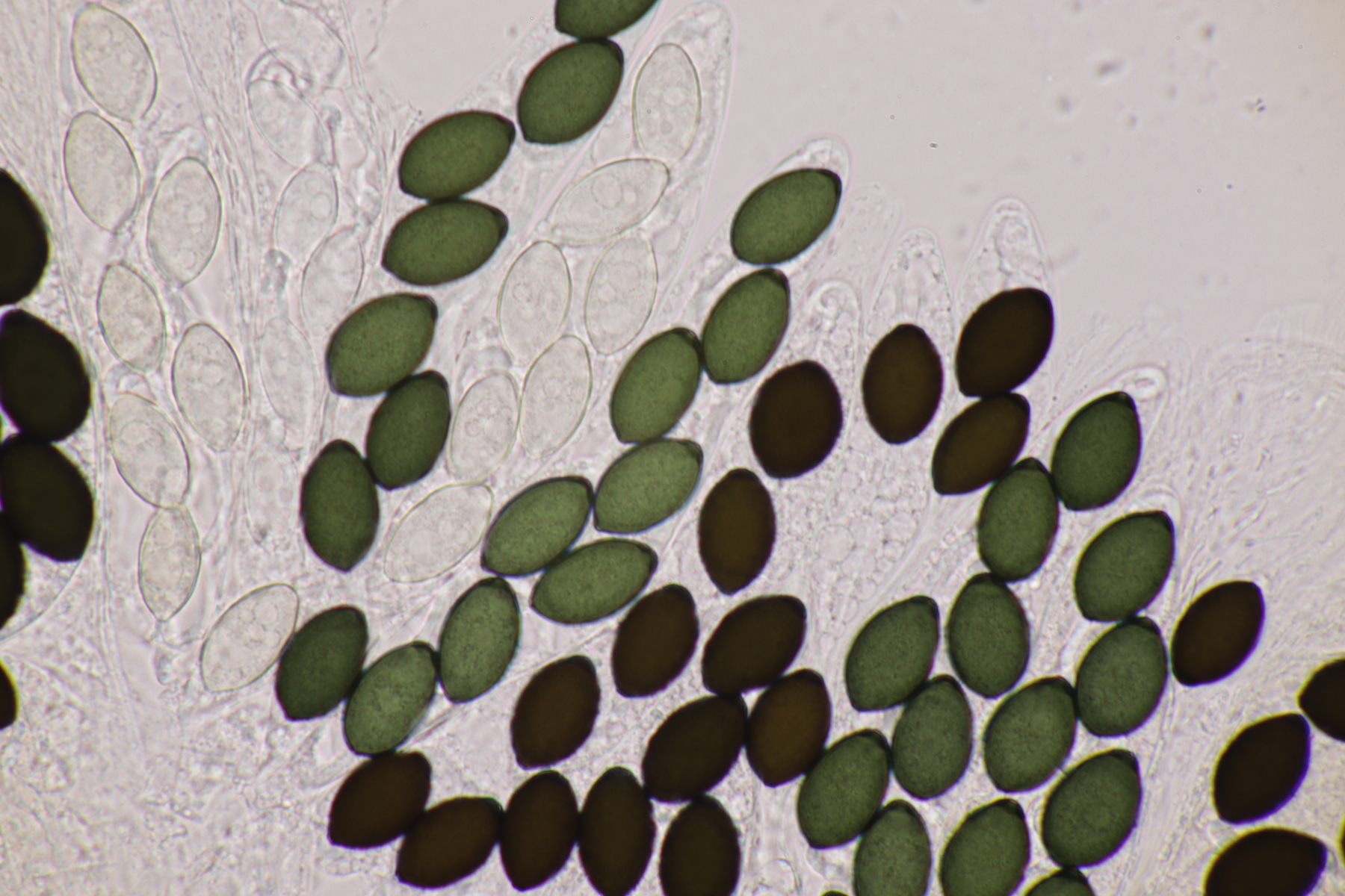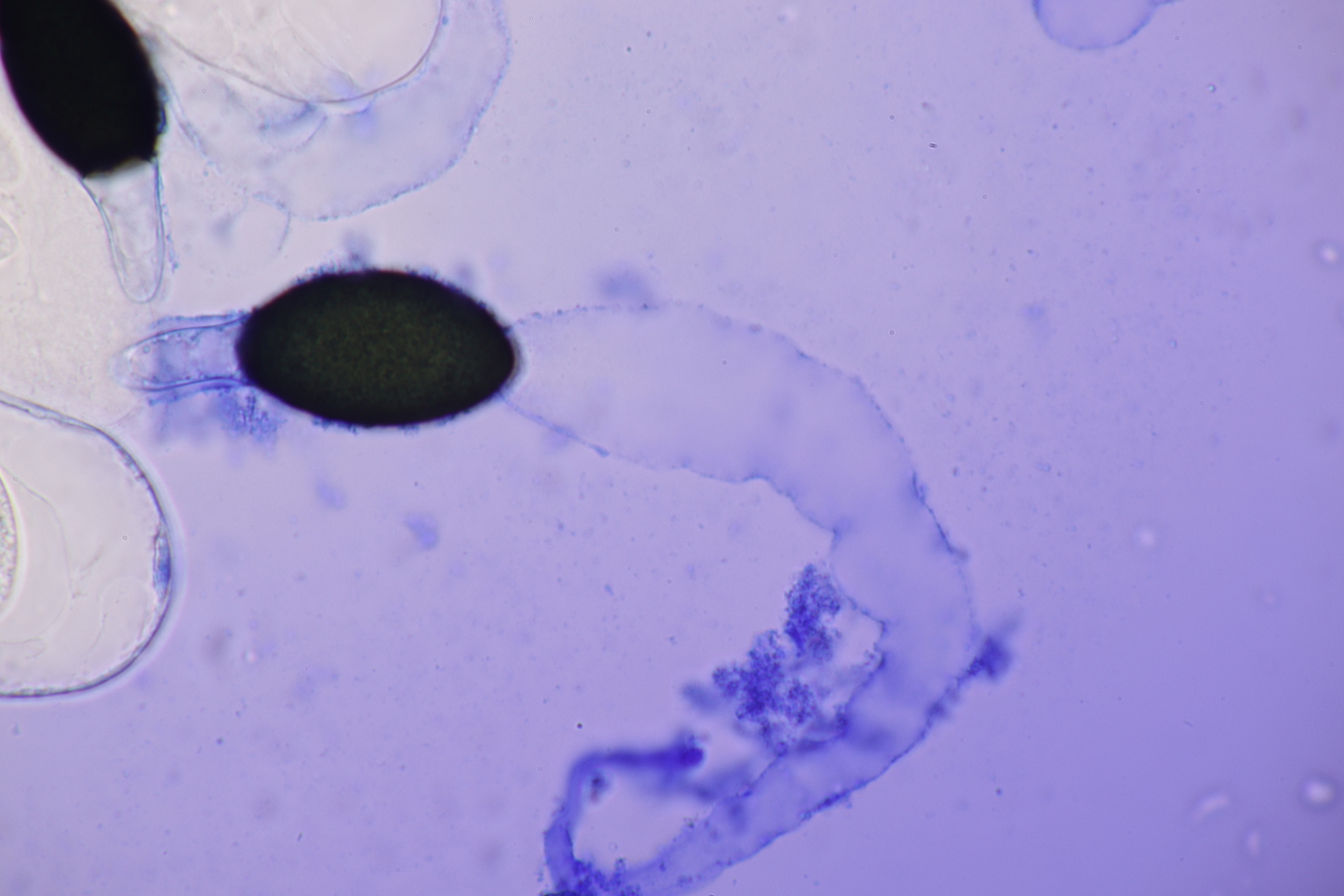 I.2 Leider nur ein Einzelexemplar: eine Podospora mit vielen Sporen im Ascus. Die Sporen messen 21-24 x 14-15 µm. Wie viele es genau waren, ließ sich leider nicht genau ermitteln, es liegt aber um die 100. Damit sind dann nur noch Podospora bifida und setosa im Rennen. Da das Pedicel um die 5 µm breit ist, geht meine Tendenz hier zu Podospora bifida.